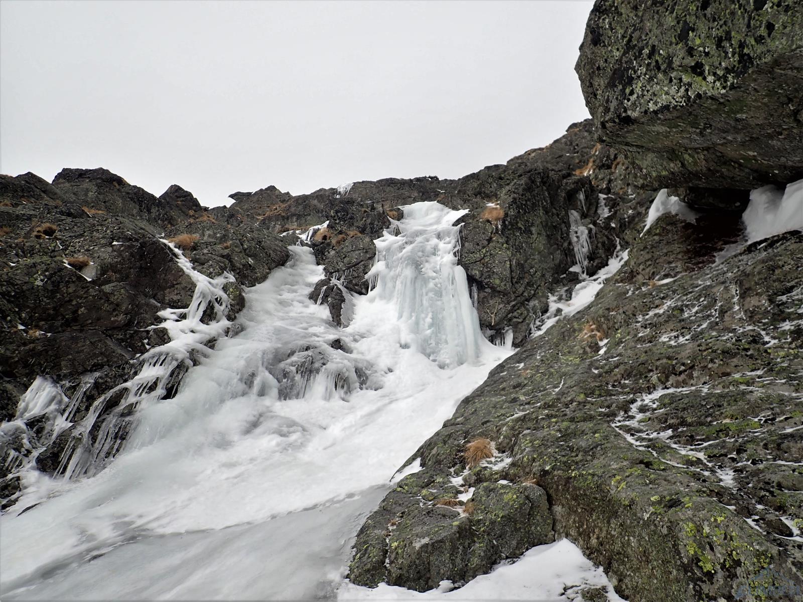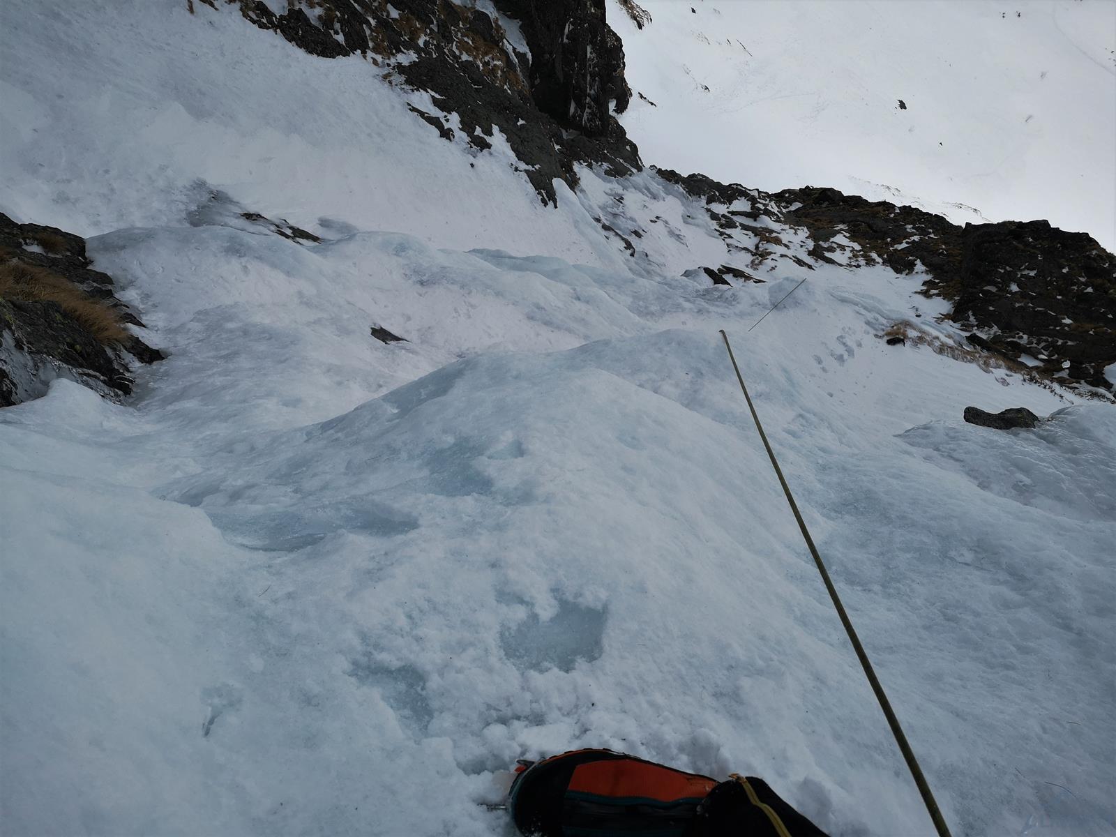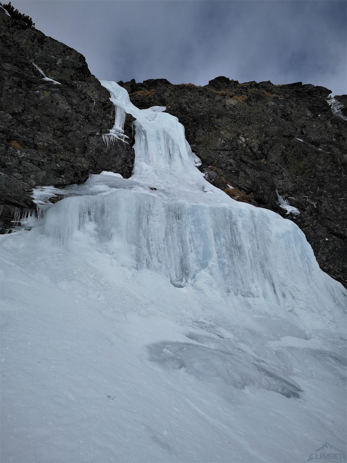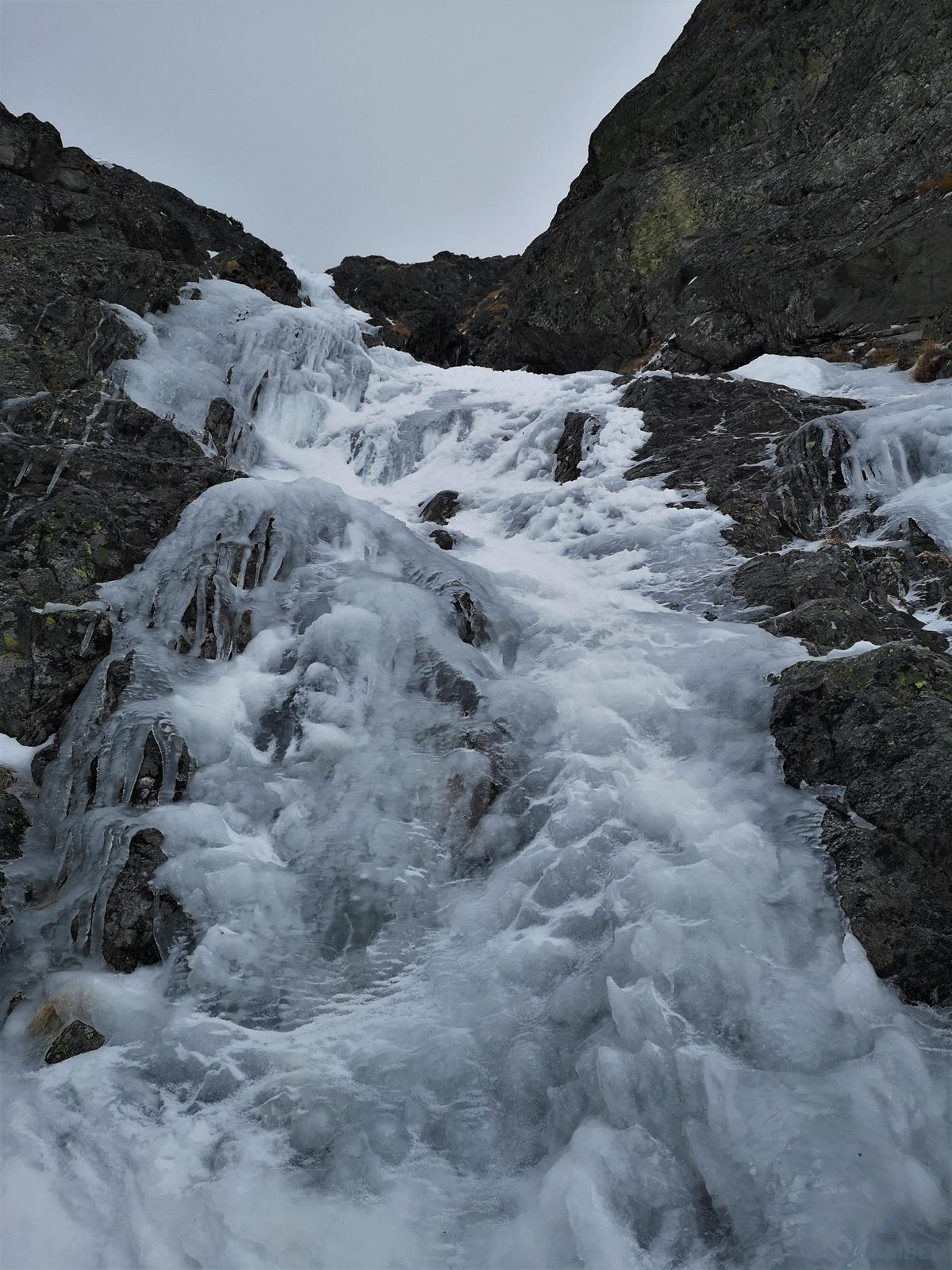 Tutaj ponownie wybieramy trudniejszy wariant (ok. WI4), kolumna okazuje się jednak bardzo nieprzyjemna, kształt kaloryfera oferuje dobre chwyty ale słabe stopnie – ciężko gdziekolwiek zabić raki. Na dodatek mam ostrza mikstowe, grube i mocno stępione po tygodniu wspinania… Robię kilka ruchów i w najsłabszym miejscu jedna dziaba wyrywa lód, druga wyskakuje, a skoro nogi nie mają dobrego podparcia oznacza to szybki powrót w okolice stanowiska 😊. Asekurantka jest jednak dobra, a ekspres wysyłowy wpięty jest do spita stanowiskowego, nie ma więc żadnych konsekwencji tego nieplanowanego wylotu. Za drugim podejściem wspinam się dużo ostrożniej i bardzo mocno zabijam dziaby, a po chwili jestem po trudnościach. Łatwe pole lodowe doprowadza pod piękny lodowy welon, nad którym znajduję kolejne stanowisko.