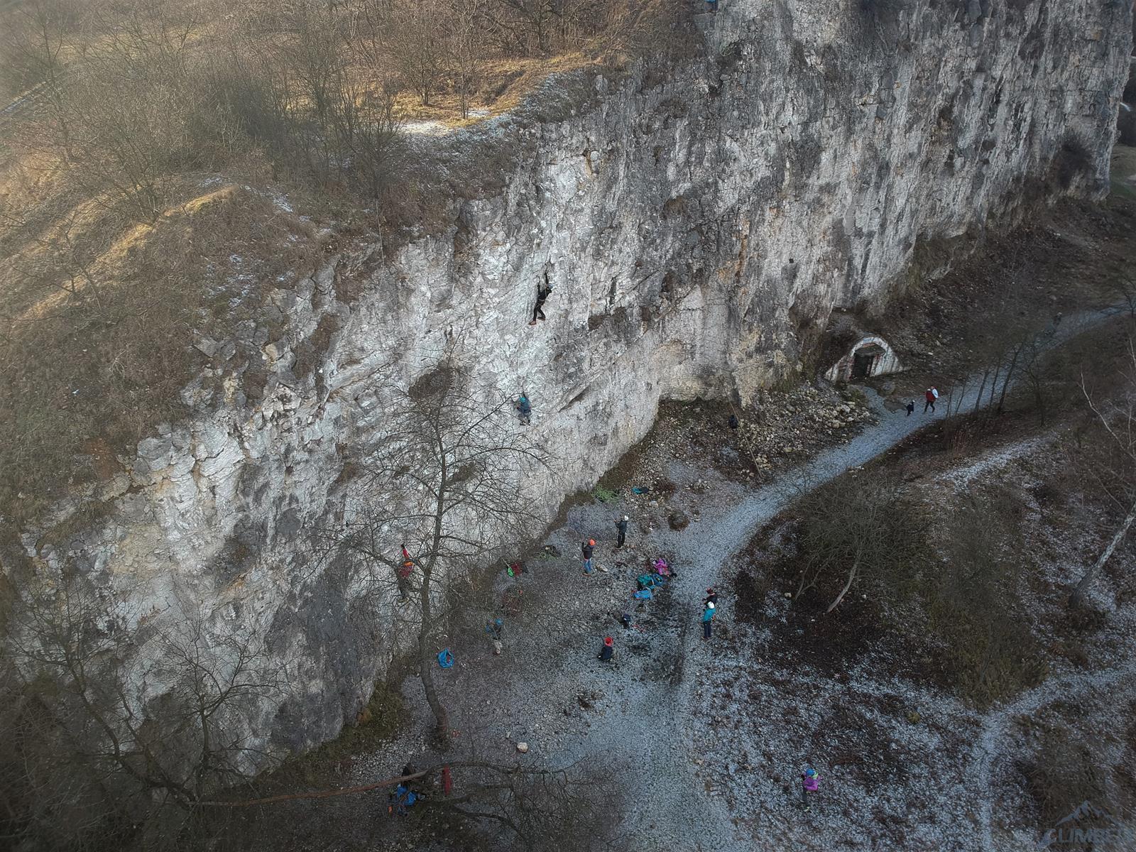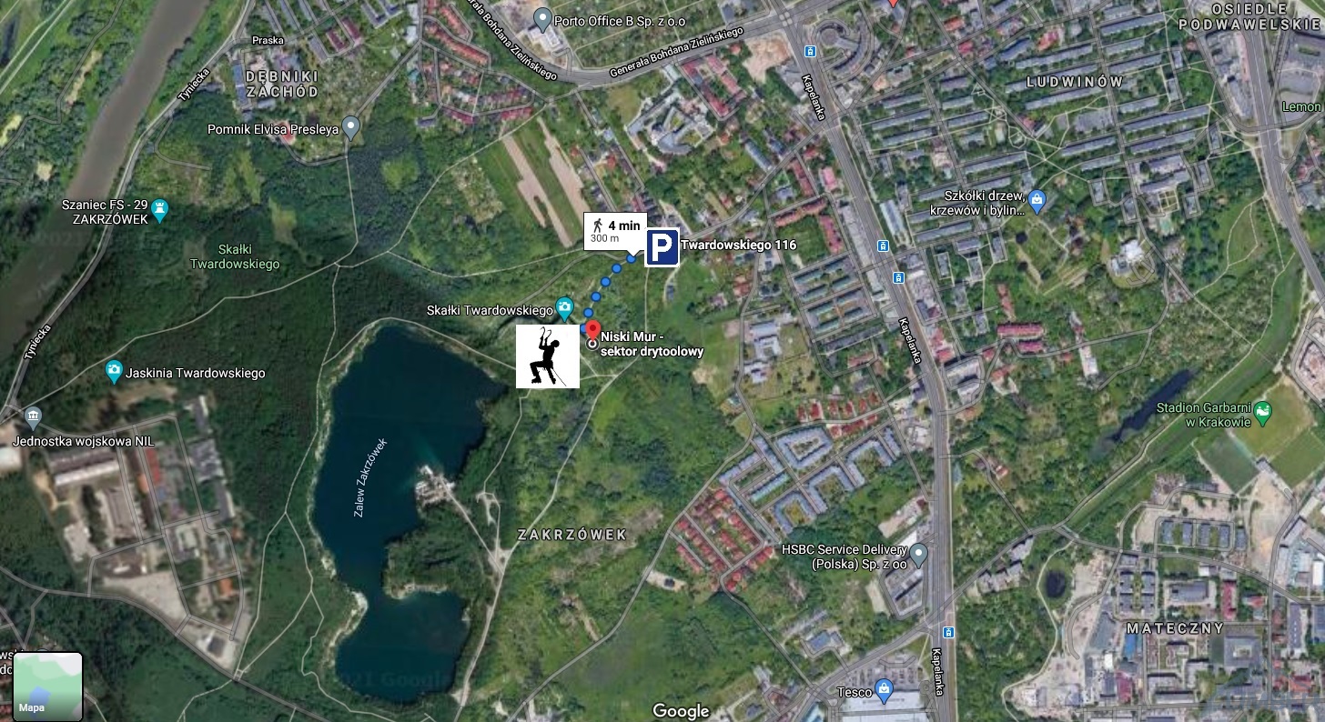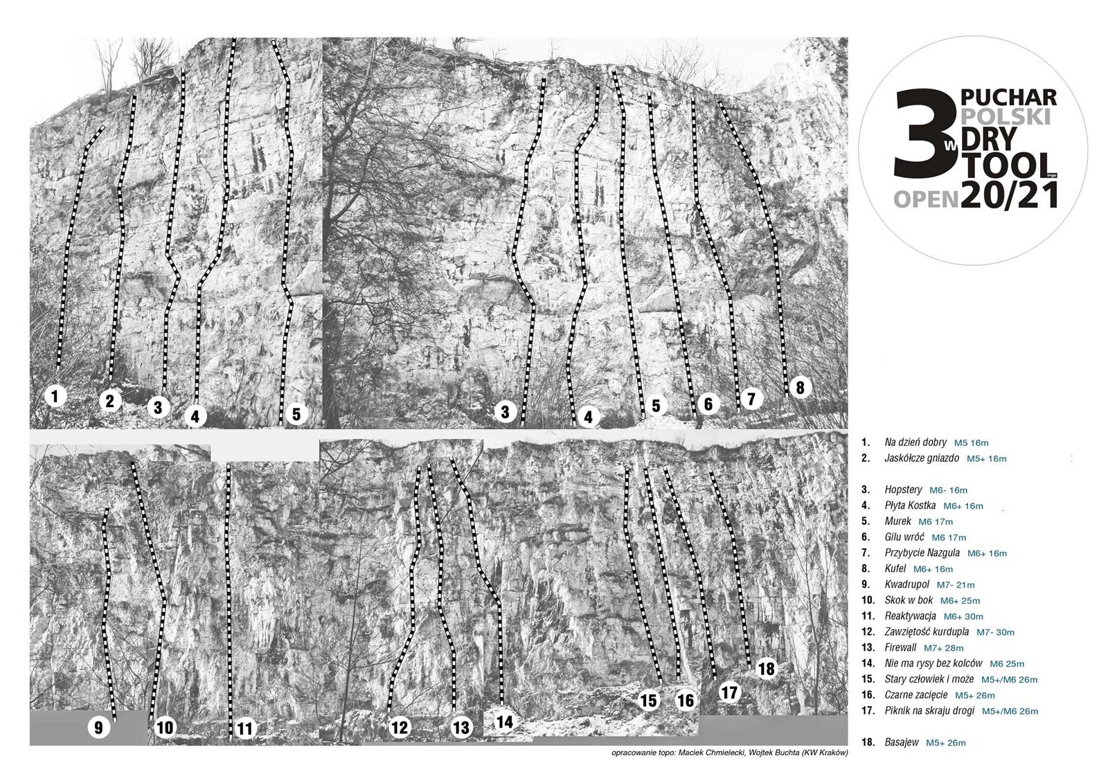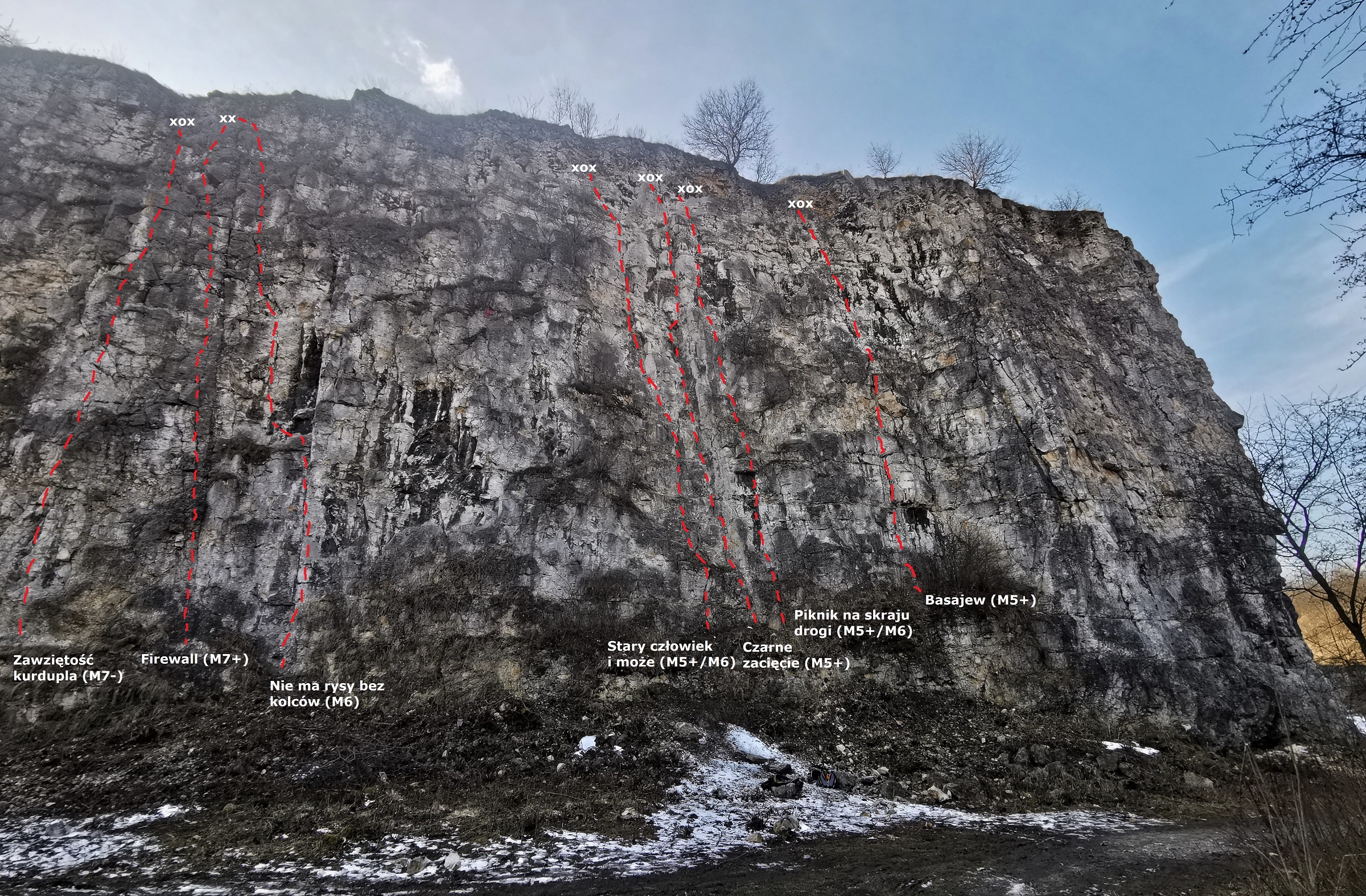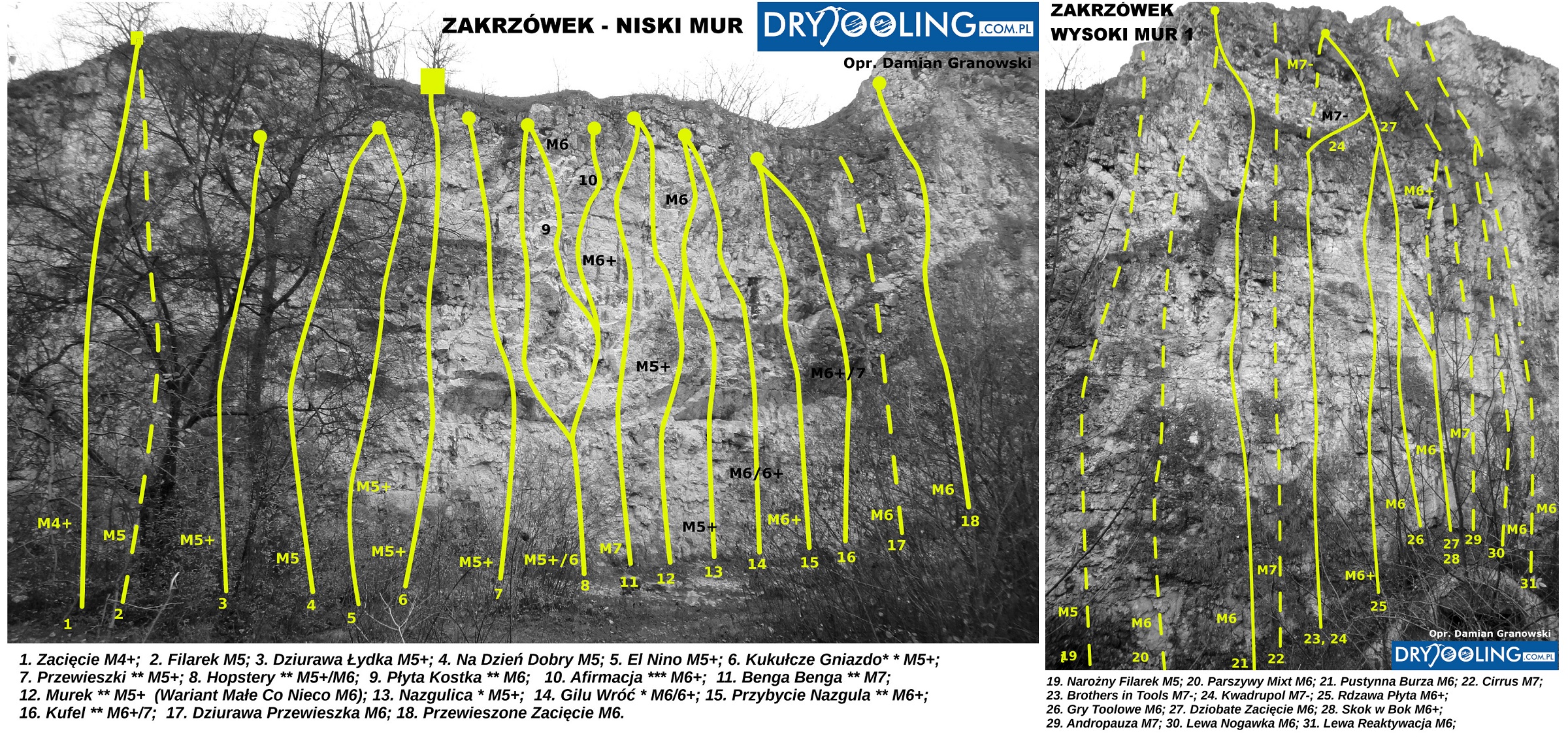 Krakowski kamieniołom wapienny na Zakrzówku to bardzo popularny rejon drytoolowy, głównie ze względu na sporą liczbę dróg (ponad 30) oraz ich przystępność (M5-M7+) - miejsce świetnie nadaje się dla początkujących jak i średnio-zaawansowanych. Do dyspozycji pod dziaby mamy dwie ściany - tzw. Niski Mur i Wysoki Mur, większość ruchu skupia się na pierwszej z nich. Obicie jest przeważnie komfortowe, a wyceny przystępne - szczególnie na popularnych drogach, na których chwyty i stopnie są dobrze wyrobione. Dwa klasyki na niższej ścianie to Afirmacja (M6+) oraz Benga Benga (M7), na wyższej ciekawe są m.in. Czarne Zacięcie (M5+), Nie ma rysy bez kolców (M6), Rdzawa Płytka (M6+) i Firewall (M7+). Załączam zdjęcia z kilku wizyt (aktualizowane) oraz topo.