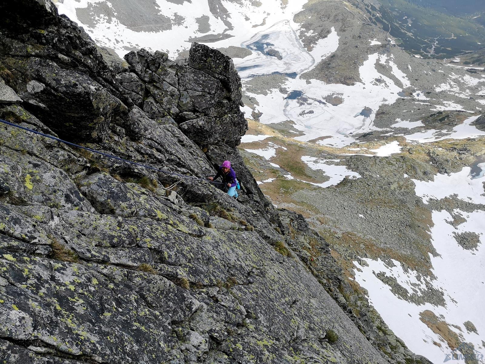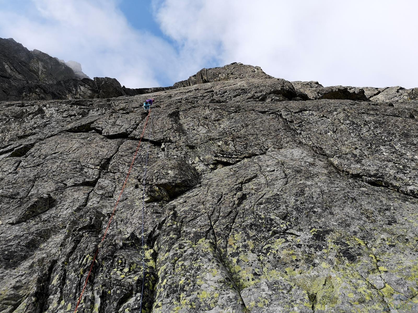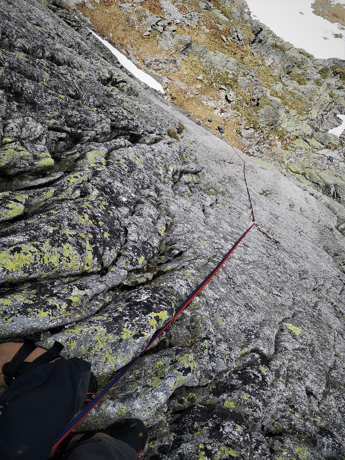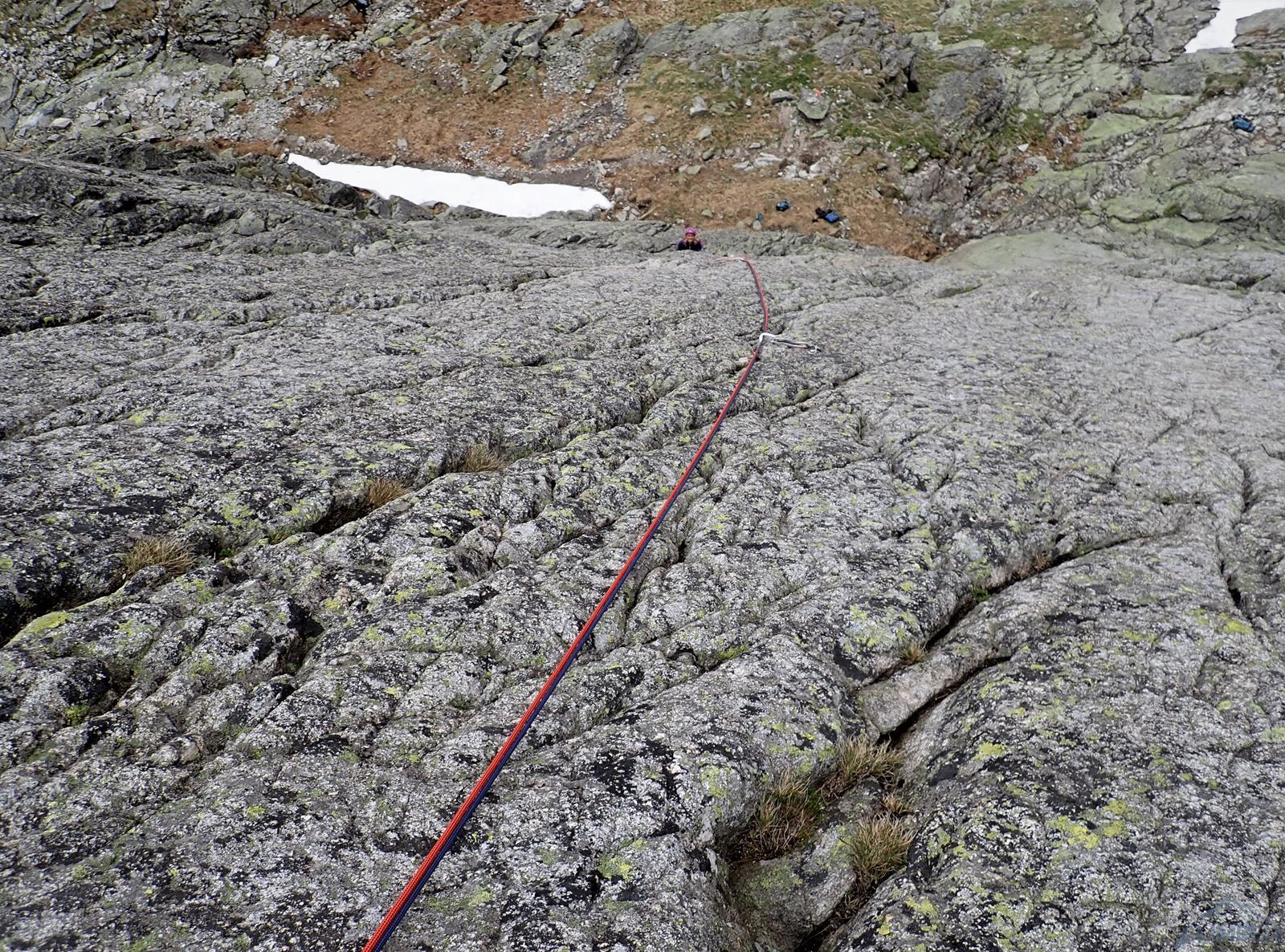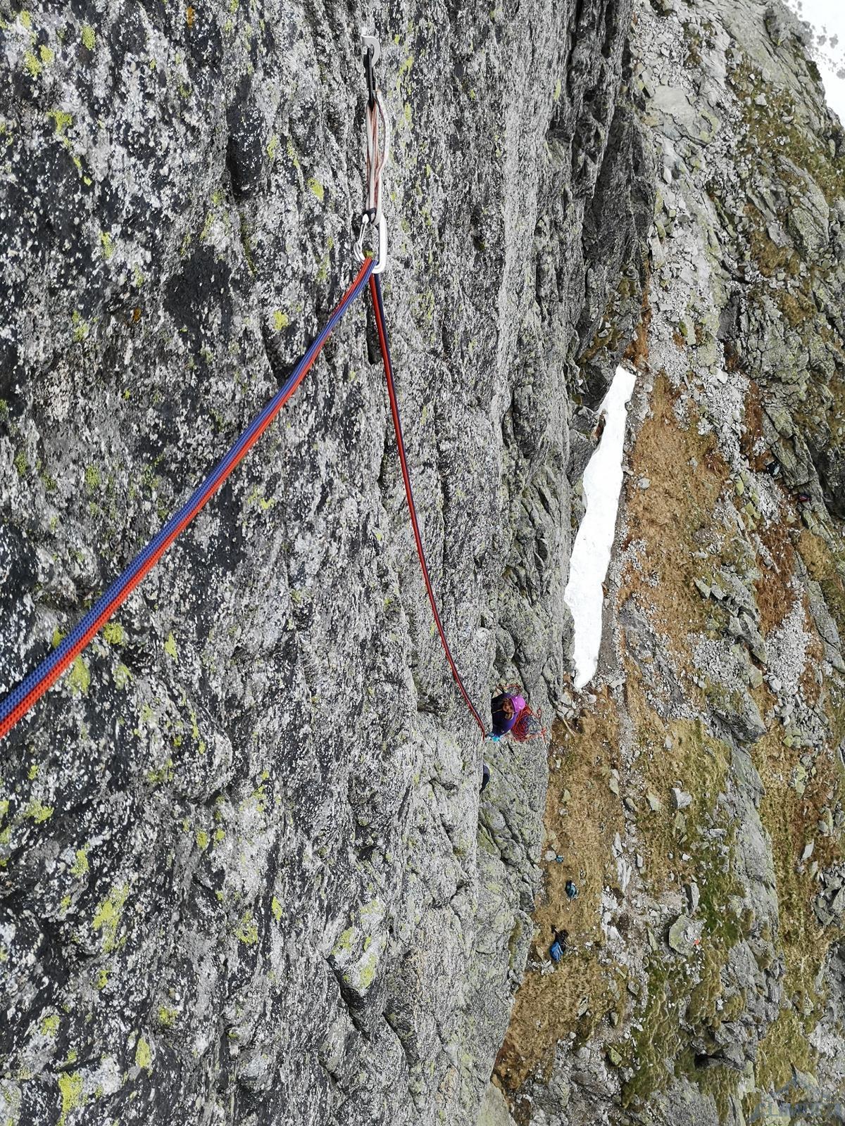 Następny wyciąg to jedna z ładniejszych płyt jakie dane mi było robić w Tatrach. Co prawda początek jest trochę stresujący ale jak już pogodzimy się z faktem, że na 40 metrach będą 4 spity (od biedy można dokładać małe friendy) to pozostaje nam delektować się estetycznymi ruchami po krawądkach. Dochodzę do kolejnej półki przecinającej płyty, tym razem do dyspozycji jest gotowe stanowisko, wspólne z drogą Štáflovej. Po chwili dołączają do mnie Ania z Szymonem. Kolega aż rwie się na ostatni wyciąg, oddaję więc grzecznie sprzęt i zamieniam się w asekuranta.