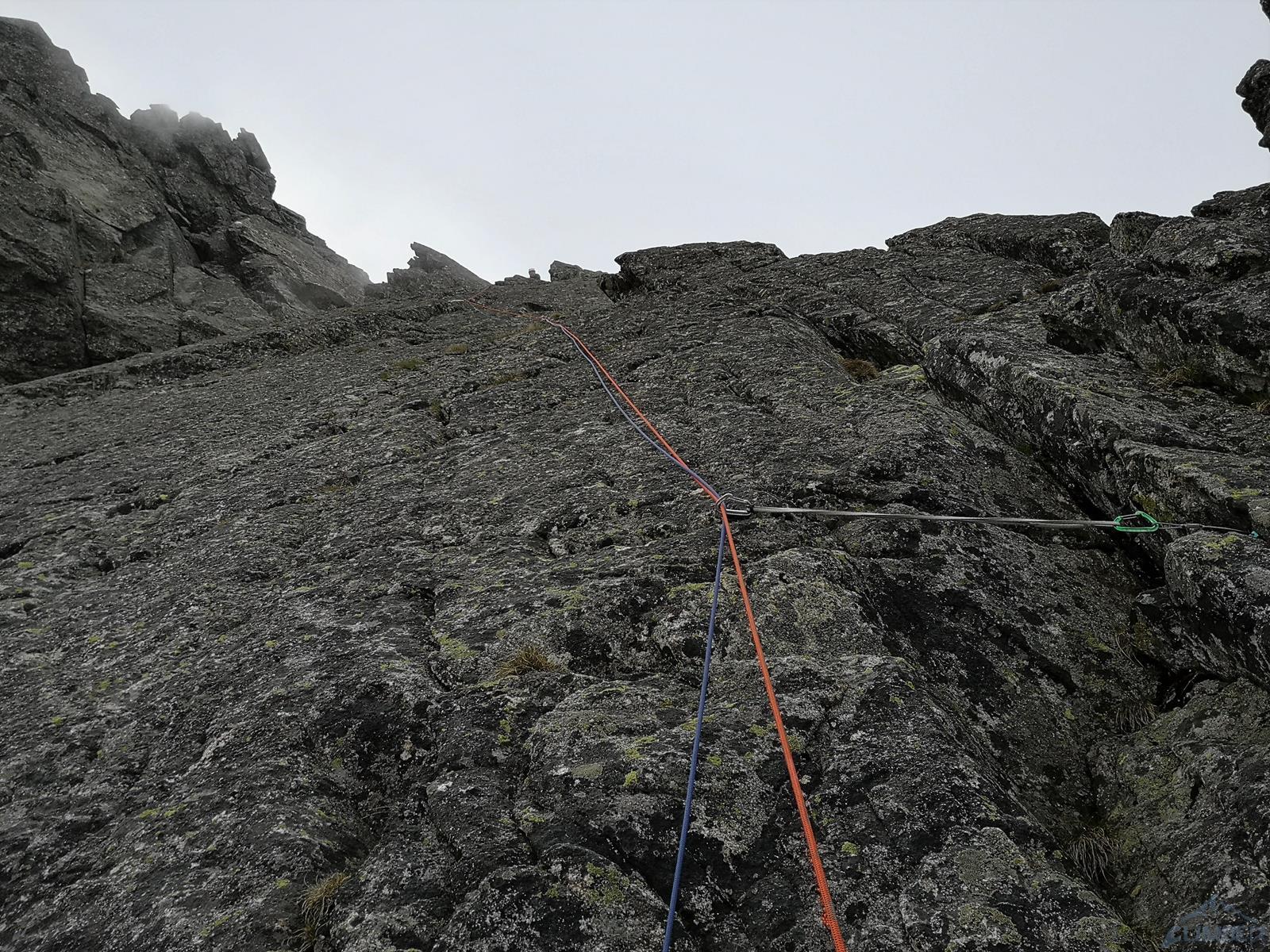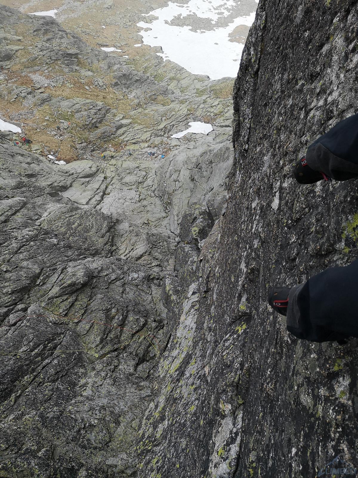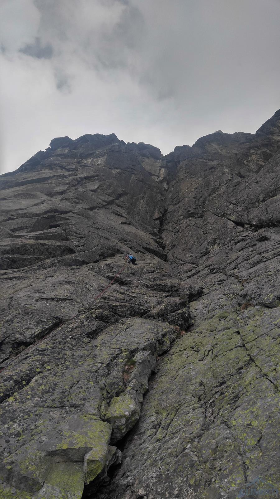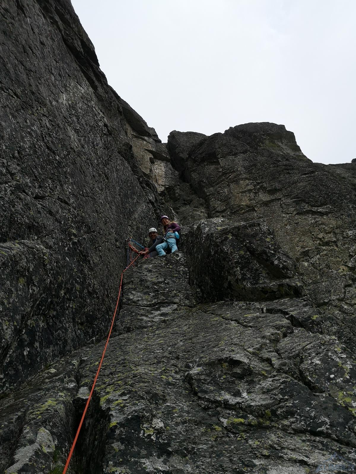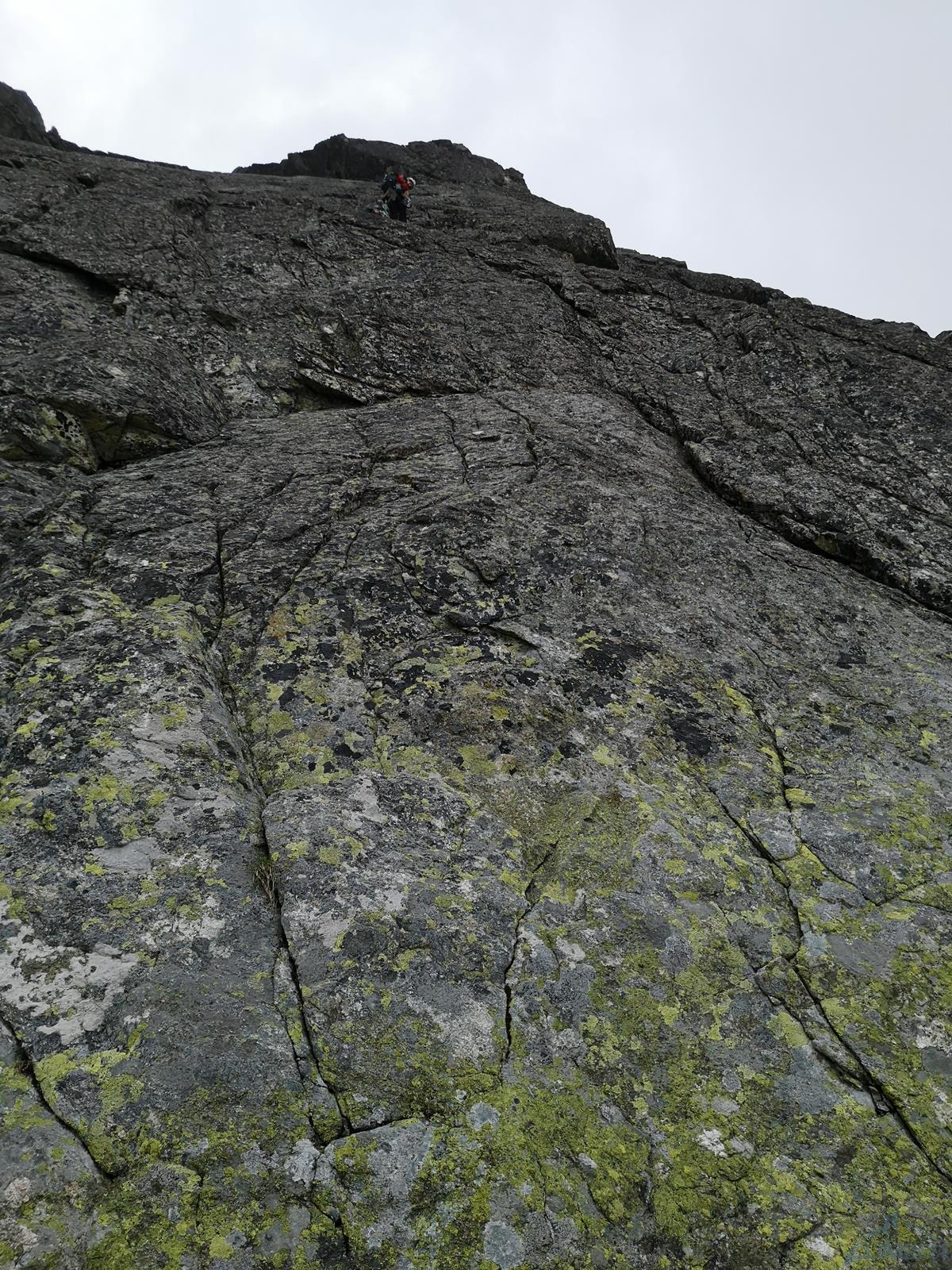 Następny wyciąg to jedna z ładniejszych płyt jakie dane mi było robić w Tatrach. Co prawda początek jest trochę stresujący ale jak już pogodzimy się z faktem, że na 40 metrach będą 4 spity (od biedy można dokładać małe friendy) to pozostaje nam delektować się estetycznymi ruchami po krawądkach. Dochodzę do kolejnej półki przecinającej płyty, tym razem do dyspozycji jest gotowe stanowisko, wspólne z drogą Štáflovej. Po chwili dołączają do mnie Ania z Szymonem. Kolega aż rwie się na ostatni wyciąg, oddaję więc grzecznie sprzęt i zamieniam się w asekuranta.