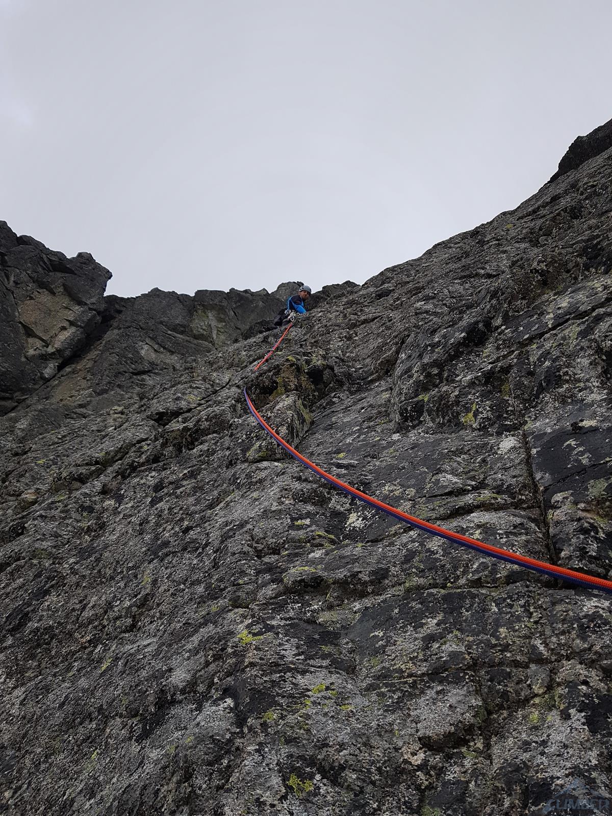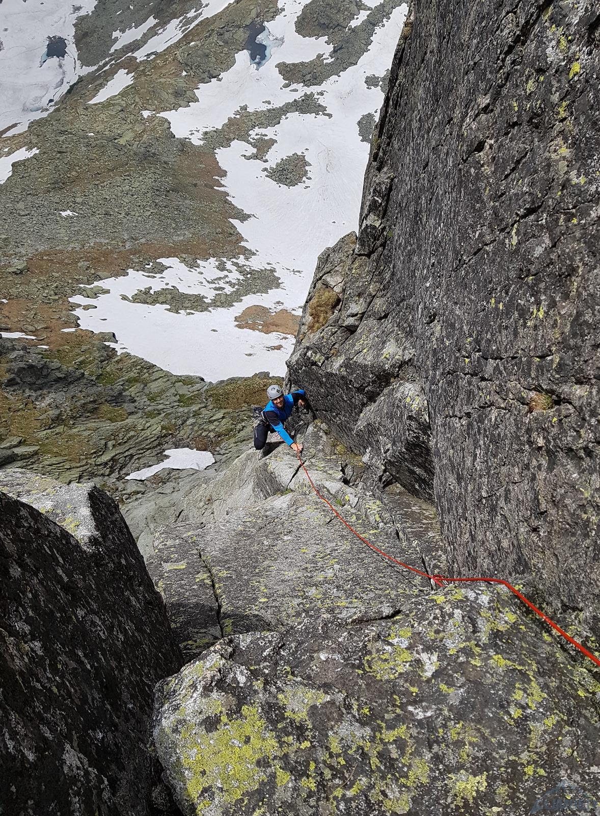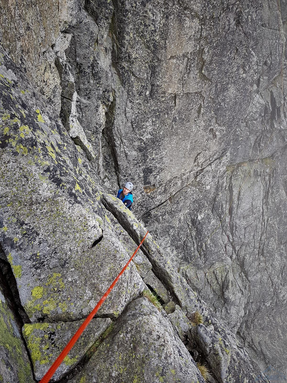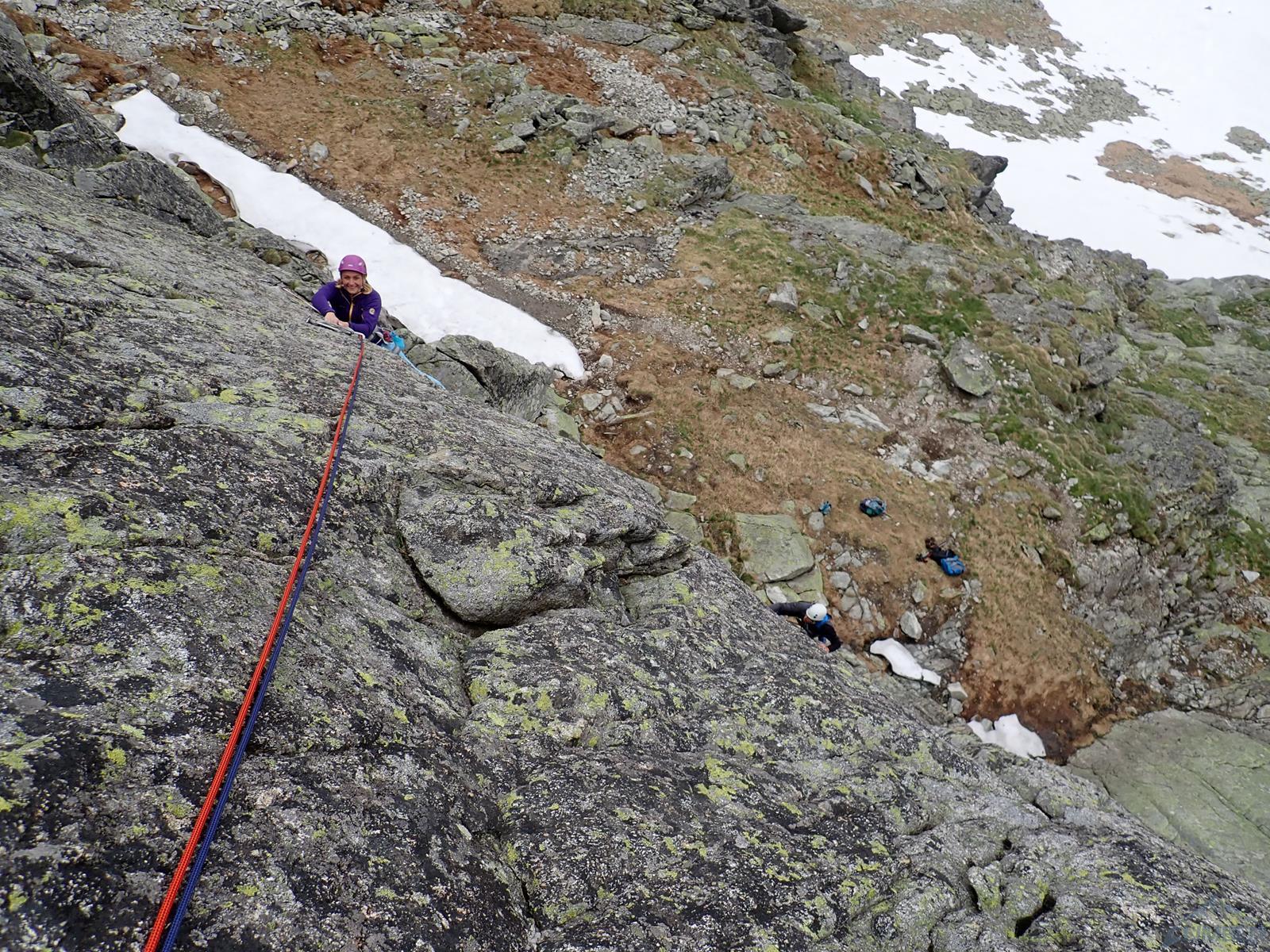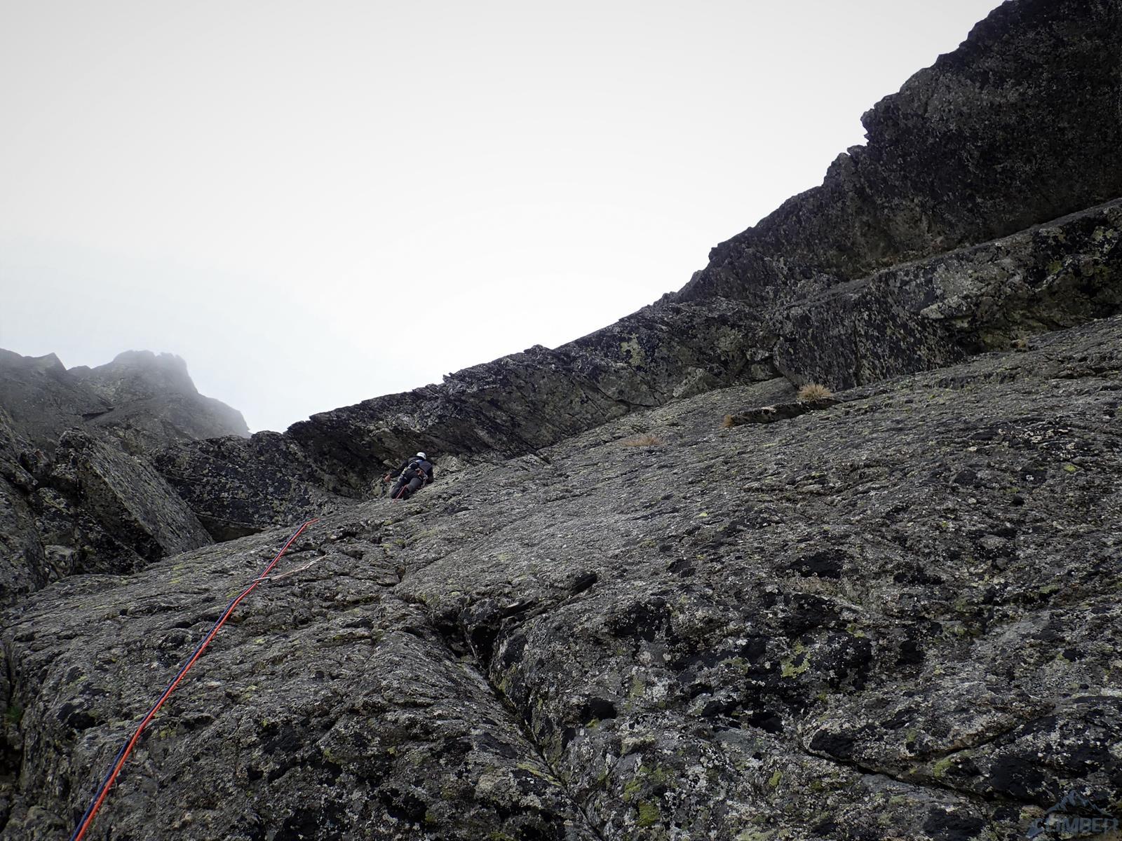 Następny wyciąg to jedna z ładniejszych płyt jakie dane mi było robić w Tatrach. Co prawda początek jest trochę stresujący ale jak już pogodzimy się z faktem, że na 40 metrach będą 4 spity (od biedy można dokładać małe friendy) to pozostaje nam delektować się estetycznymi ruchami po krawądkach. Dochodzę do kolejnej półki przecinającej płyty, tym razem do dyspozycji jest gotowe stanowisko, wspólne z drogą Štáflovej. Po chwili dołączają do mnie Ania z Szymonem. Kolega aż rwie się na ostatni wyciąg, oddaję więc grzecznie sprzęt i zamieniam się w asekuranta.