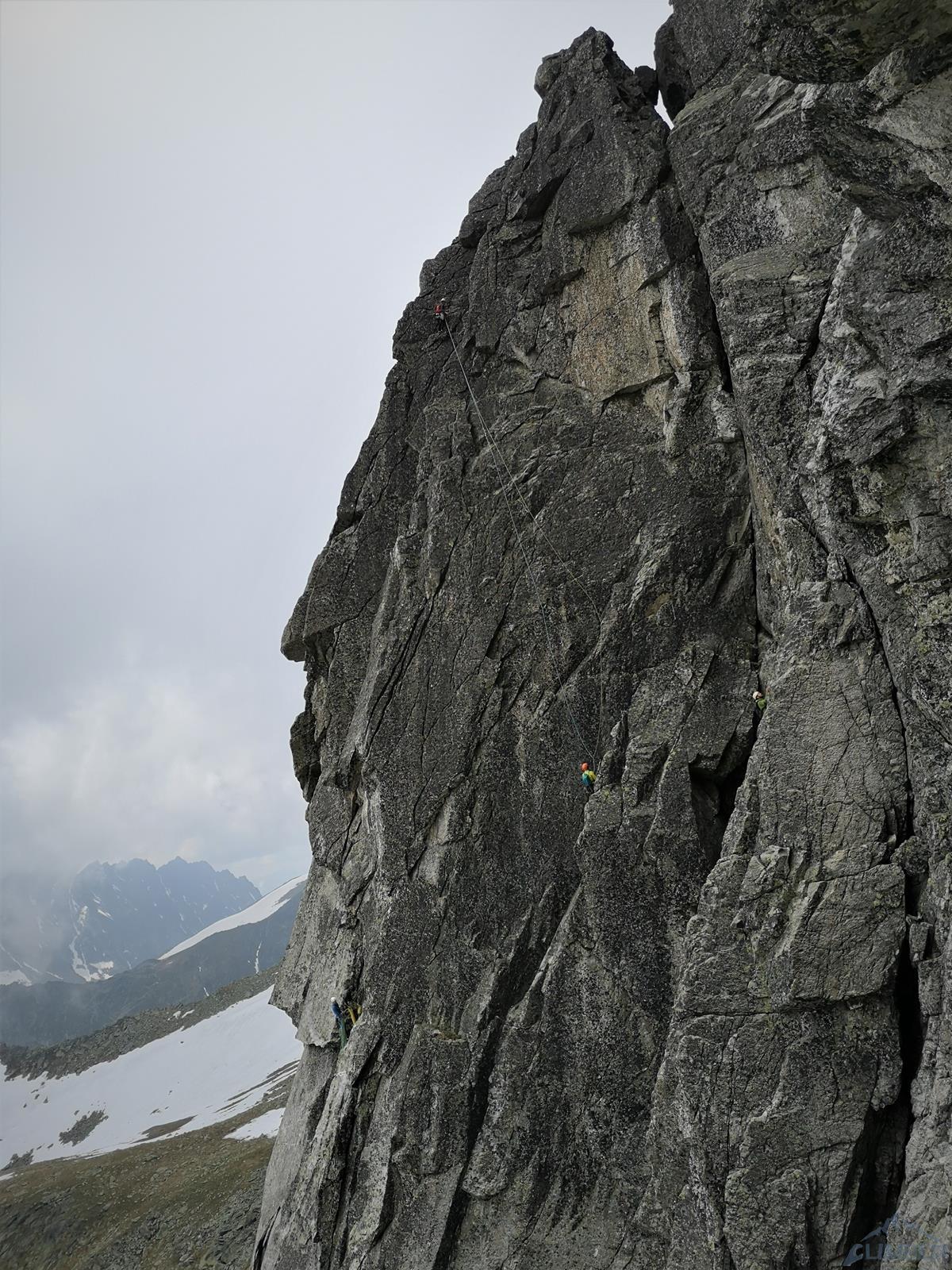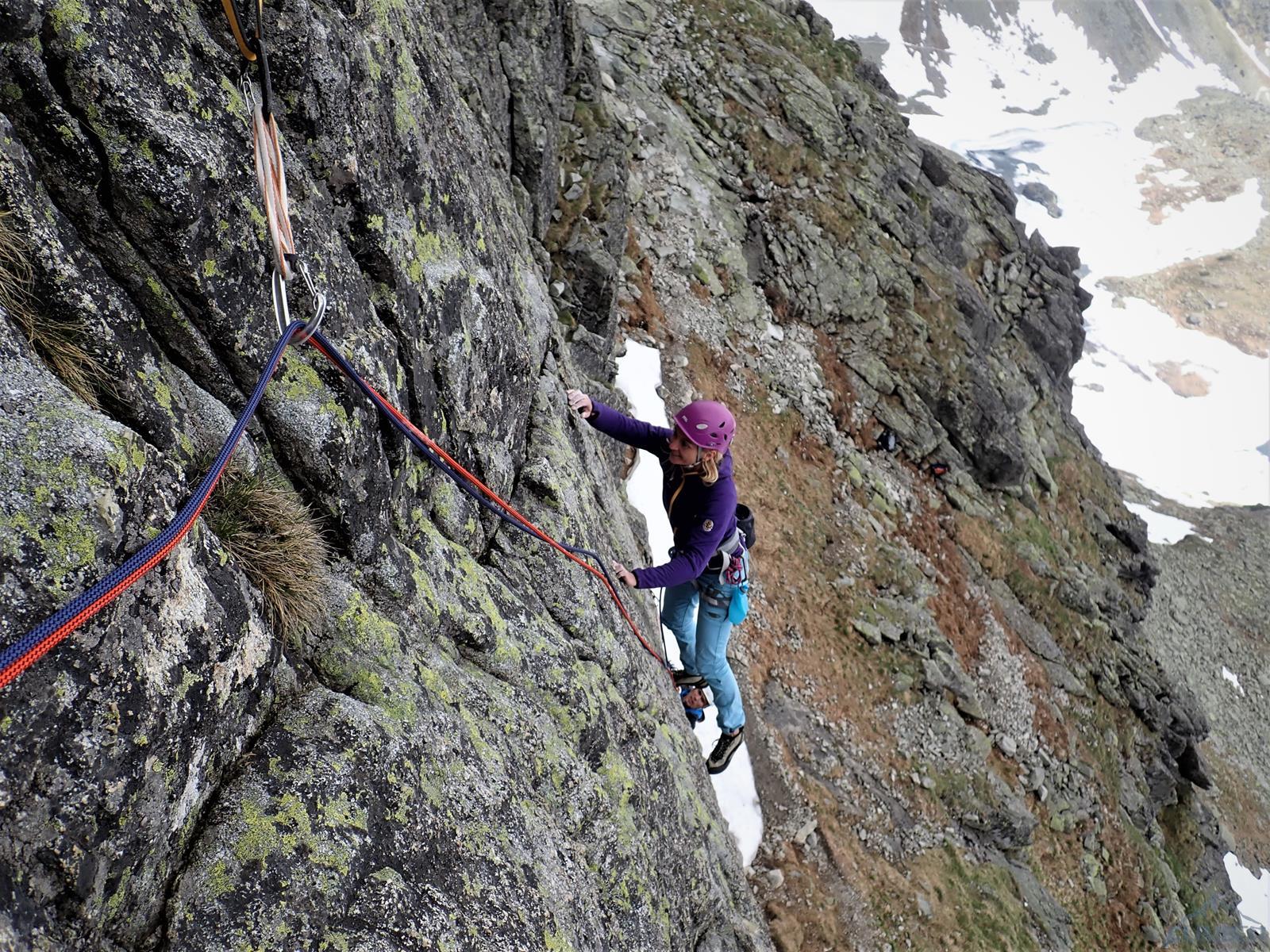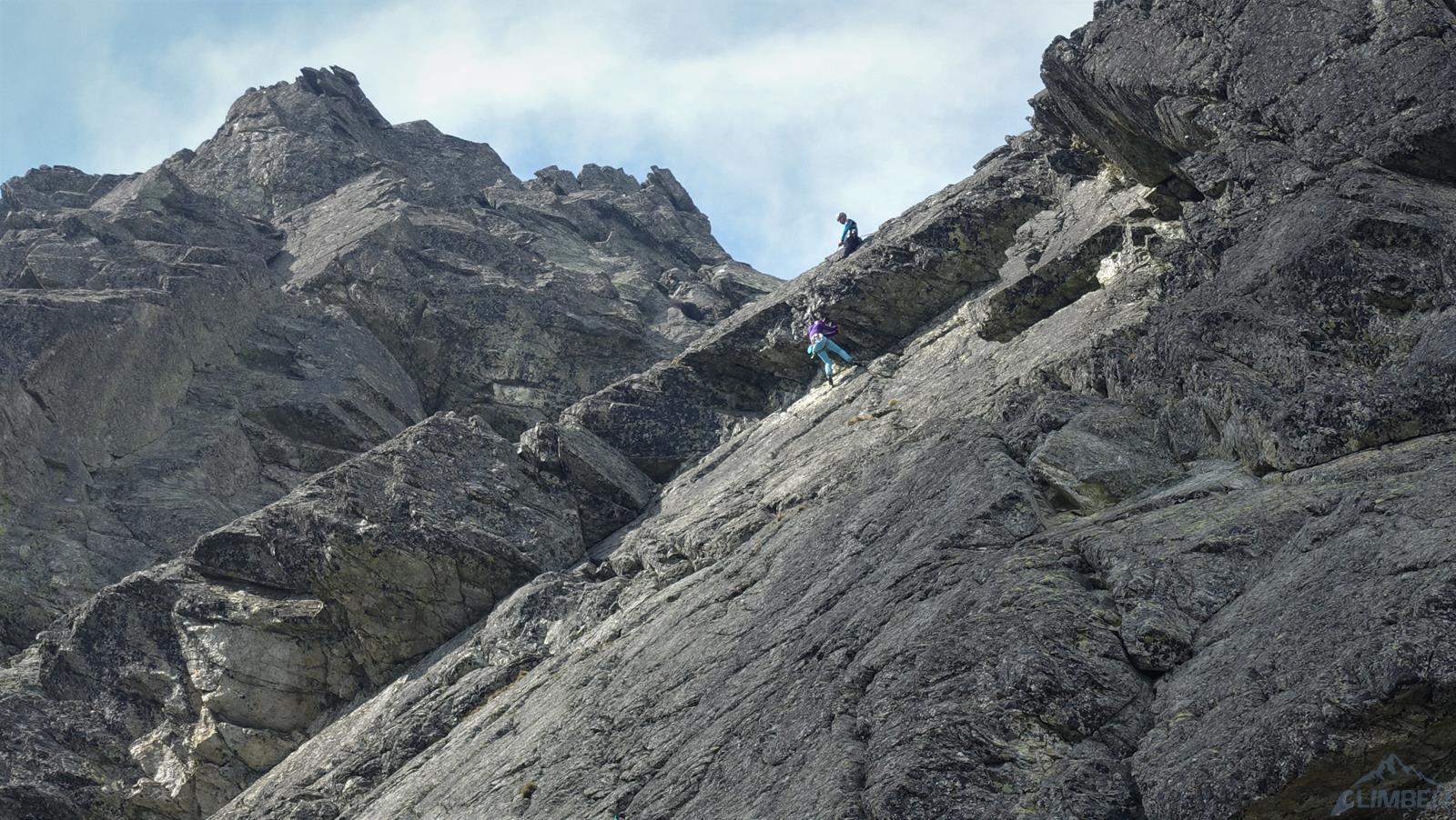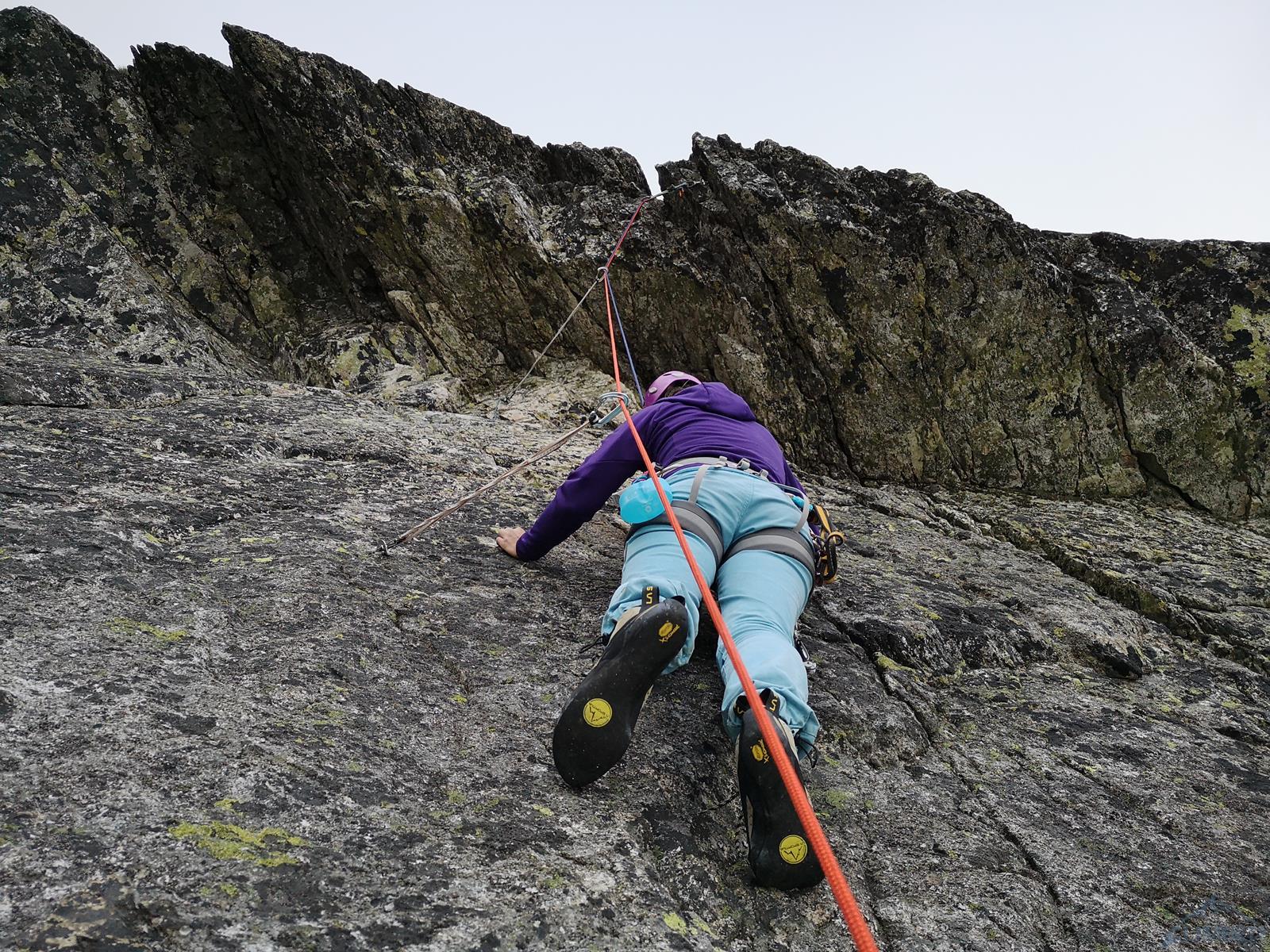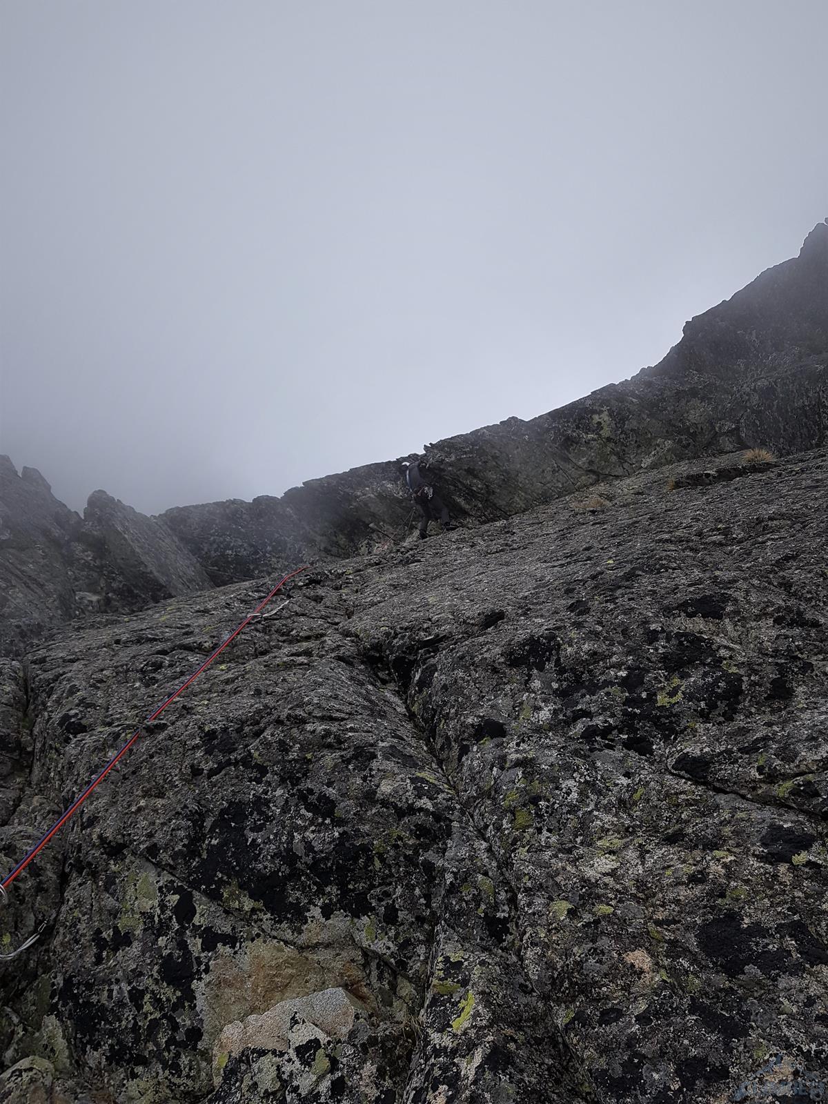 Następny wyciąg to jedna z ładniejszych płyt jakie dane mi było robić w Tatrach. Co prawda początek jest trochę stresujący ale jak już pogodzimy się z faktem, że na 40 metrach będą 4 spity (od biedy można dokładać małe friendy) to pozostaje nam delektować się estetycznymi ruchami po krawądkach. Dochodzę do kolejnej półki przecinającej płyty, tym razem do dyspozycji jest gotowe stanowisko, wspólne z drogą Štáflovej. Po chwili dołączają do mnie Ania z Szymonem. Kolega aż rwie się na ostatni wyciąg, oddaję więc grzecznie sprzęt i zamieniam się w asekuranta.