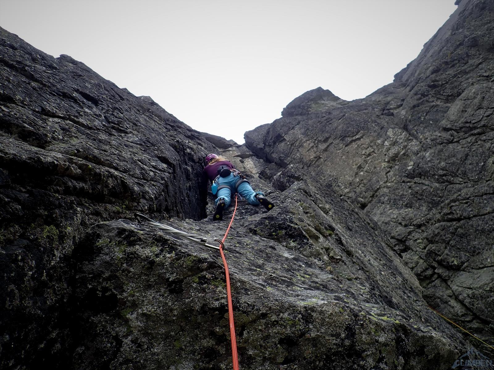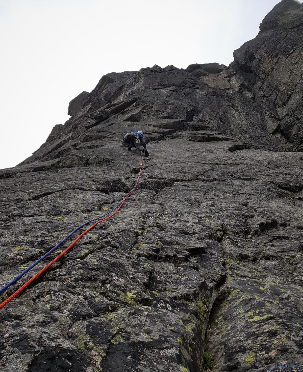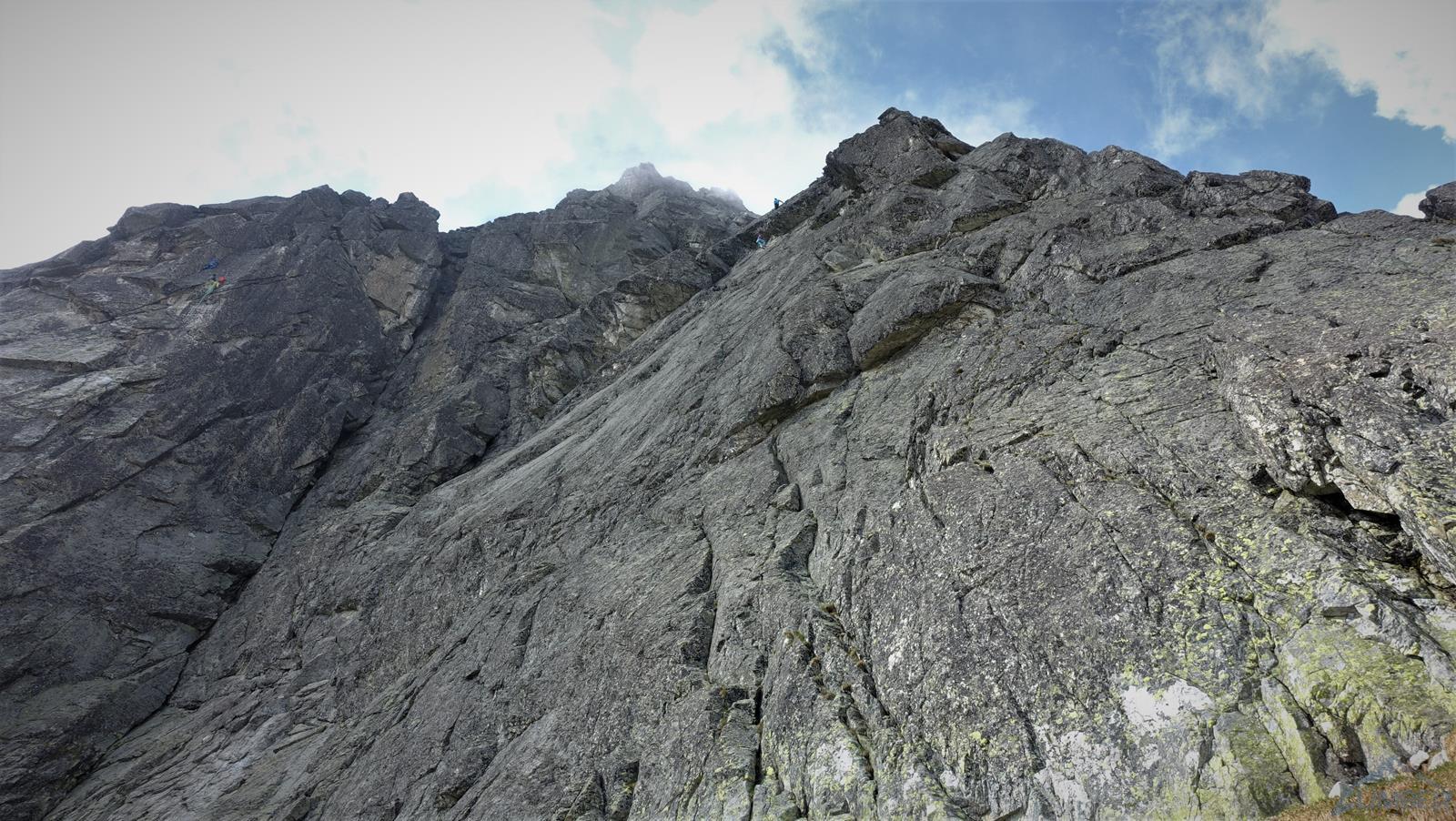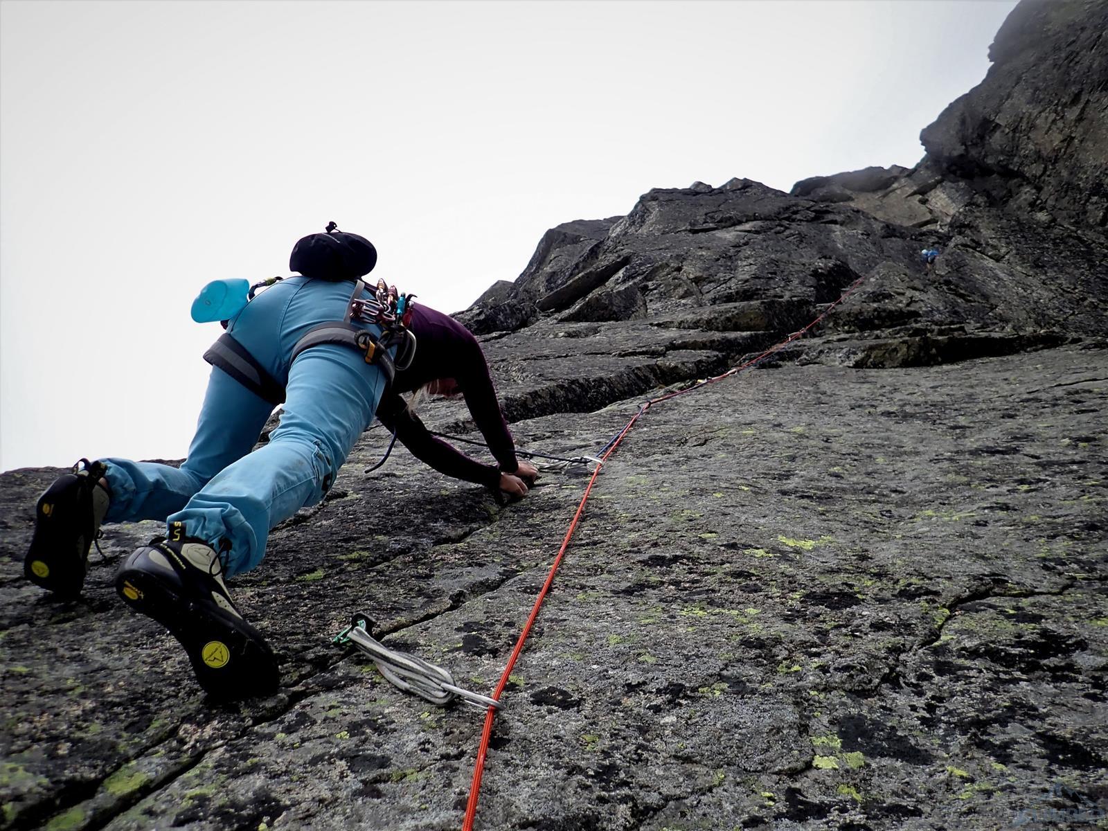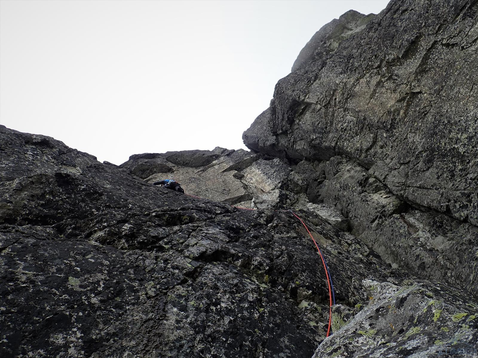 Następny wyciąg to jedna z ładniejszych płyt jakie dane mi było robić w Tatrach. Co prawda początek jest trochę stresujący ale jak już pogodzimy się z faktem, że na 40 metrach będą 4 spity (od biedy można dokładać małe friendy) to pozostaje nam delektować się estetycznymi ruchami po krawądkach. Dochodzę do kolejnej półki przecinającej płyty, tym razem do dyspozycji jest gotowe stanowisko, wspólne z drogą Štáflovej. Po chwili dołączają do mnie Ania z Szymonem. Kolega aż rwie się na ostatni wyciąg, oddaję więc grzecznie sprzęt i zamieniam się w asekuranta.