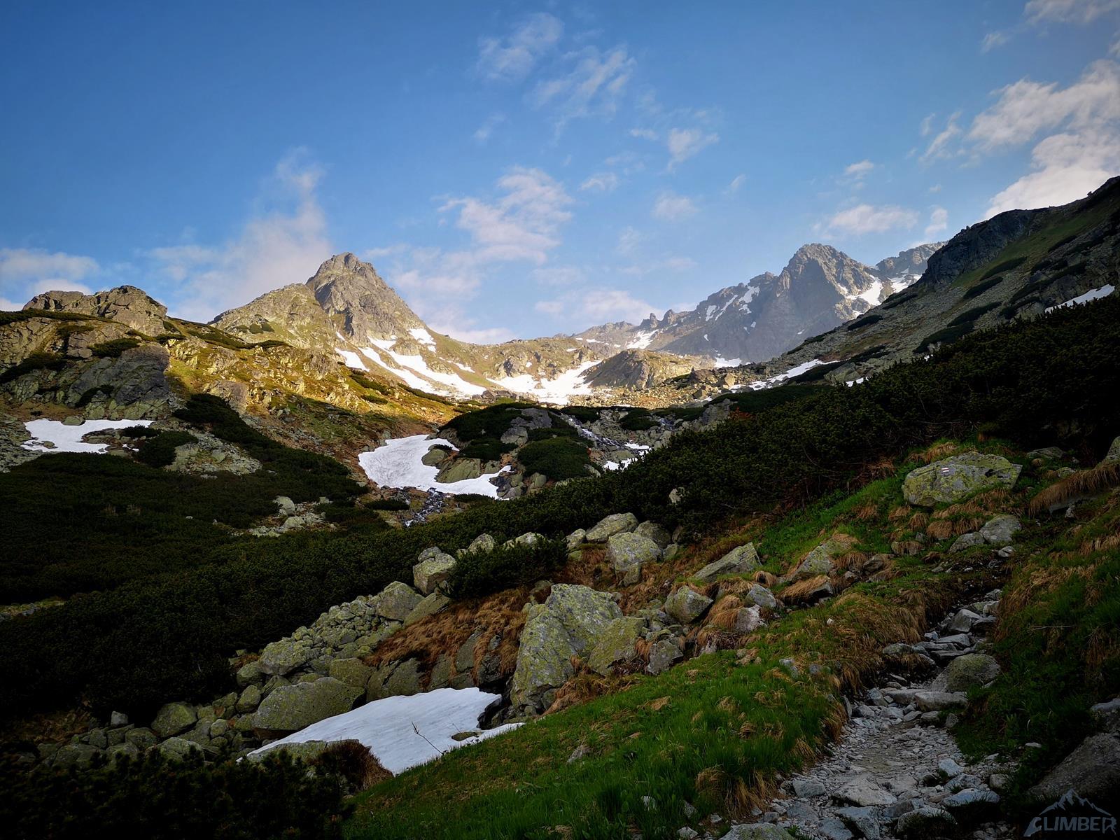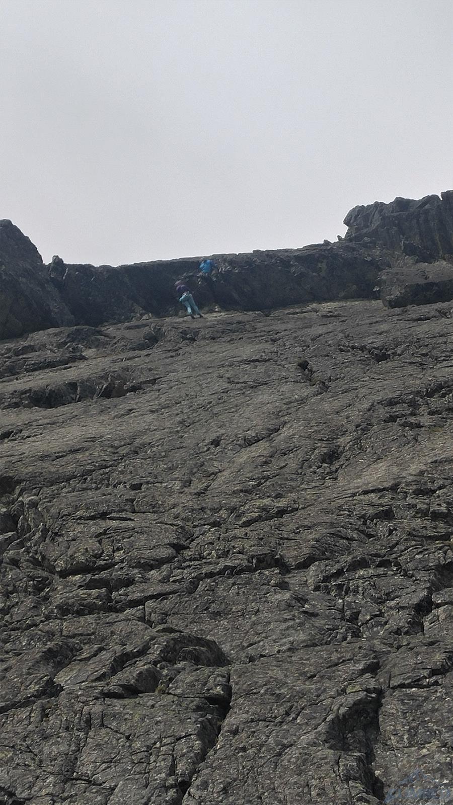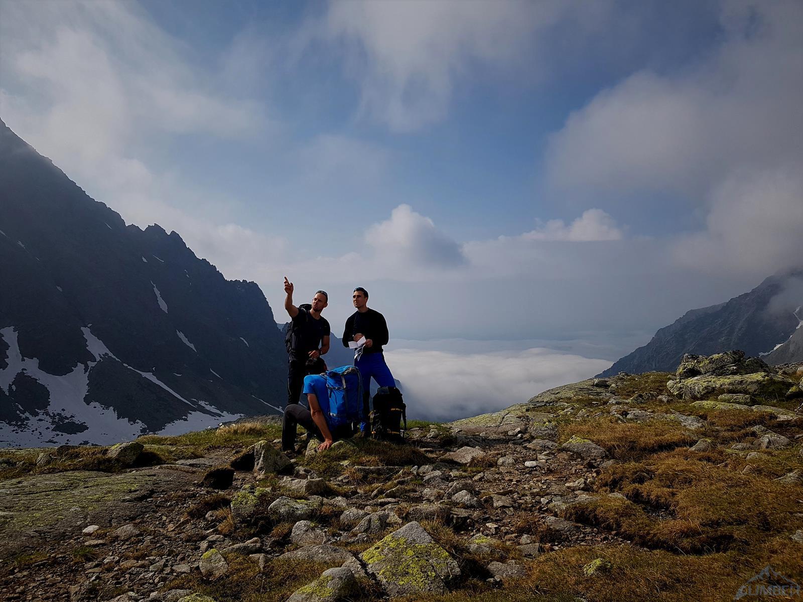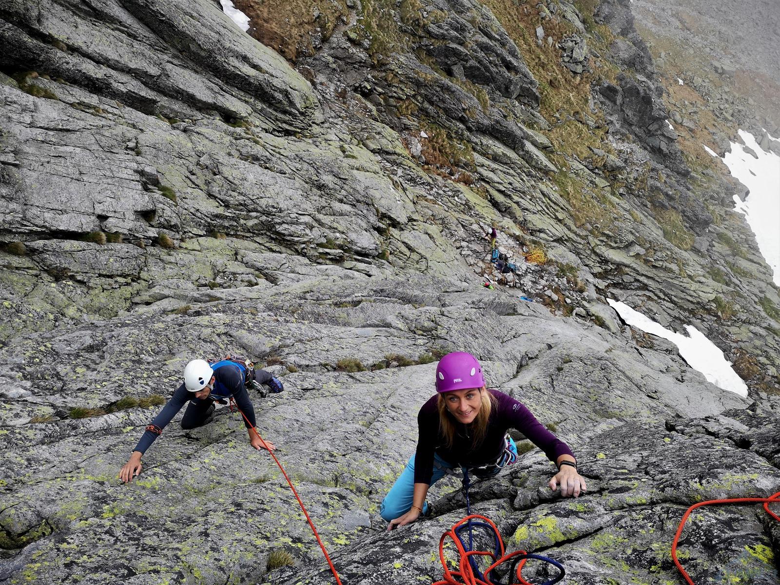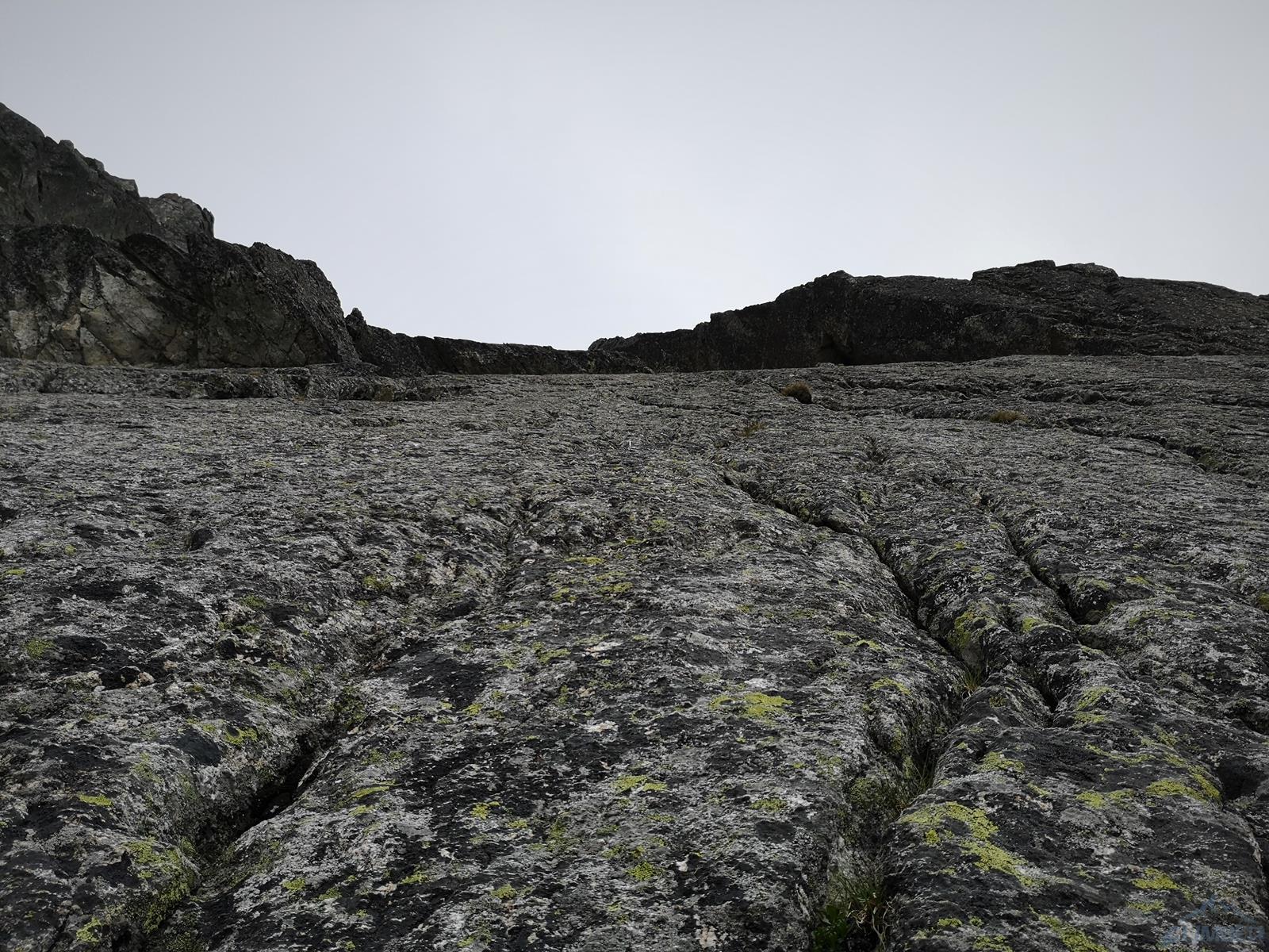 Następny wyciąg to jedna z ładniejszych płyt jakie dane mi było robić w Tatrach. Co prawda początek jest trochę stresujący ale jak już pogodzimy się z faktem, że na 40 metrach będą 4 spity (od biedy można dokładać małe friendy) to pozostaje nam delektować się estetycznymi ruchami po krawądkach. Dochodzę do kolejnej półki przecinającej płyty, tym razem do dyspozycji jest gotowe stanowisko, wspólne z drogą Štáflovej. Po chwili dołączają do mnie Ania z Szymonem. Kolega aż rwie się na ostatni wyciąg, oddaję więc grzecznie sprzęt i zamieniam się w asekuranta.