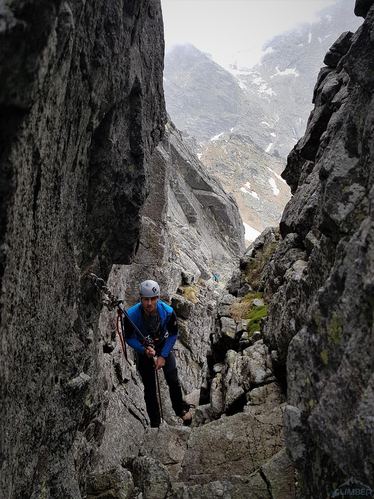 Szymon sprawnie pokonuje czujną płytkę i wpięty do spita na jej końcu próbuje poskładać się do wejścia w okap. Trochę mu na tym schodzi ale w końcu łapie dobre chwyty, niestety z nogami jest gorzej i po chwili mamy efektowną scenę jak z „Na Krawędzi”, gdy Stallone wisi na łapach nad przepaścią i macha nogami w powietrzu 😉 Po chwili walki kolega odpuszcza i półdynamicznie wraca do spita na płycie by odpocząć na bloku. Druga próba kończy się tym samym i dopiero przy trzecim podejściu oraz osadzeniu frienda w okapie, udaje się wyjść nad okap. Tutaj teren się kładzie i czeka nas łatwa do przejścia, dobrze urzeźbiona płyta. Generalnie trzecie stanowisko jest na grani po prawej stronie, Szymon próbuje jednak dociągnąć od razu do stanowiska zjazdowego ze Štáflovki – braknie mu kilku metrów więc stanowisko zrobi ze spotkanego po drodze haka i swojego sprzętu.