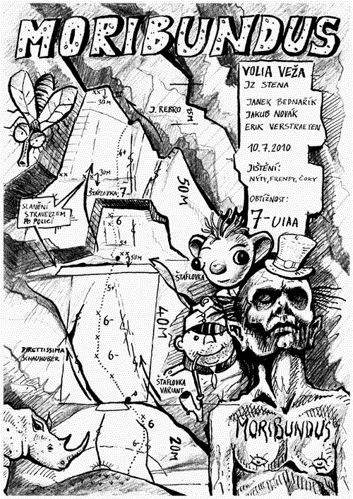 Szybko przechodzę pierwszy, łatwy (IV+) wyciąg i doprowadzam nas do nowego, gotowego stanowiska pod najtrudniejszym odcinkiem. W zeszłym roku od razu poszedłem dalej i dociągnąłem do starego stanowiska z dwóch haków (jest tam moja taśma i mailon). Tym razem dalej prowadzi Szymon – najpierw dobrze asekurowana hakami płyta z rysą (VI+), następnie skośne zacięcie z szerokim pęknięciem i okapikiem. Po około 40 metrach kolega dochodzi do drugiego gotowego stanowiska i ściąga nas do siebie. Trzeci wyciąg można rozpocząć kilkoma wariantami, my ścinamy do góry 3-4 metry od stanowiska, następnie dobrze urzeźbioną ścianką (około V) robimy wznoszący trawers w lewo. Ostatnie stanowisko jest już pod szczytem turnicy, skąd by dostać się do zjazdu kominem Puskasa podchodzimy kilka metrów. Po dwóch szybkich zjazdach jesteśmy z powrotem pod ścianą. Ładna i efektowna (te zdjęcia z naprzeciwka!) ale krótka droga, dla dwójkowego zespołu do zrobienia w około półtora godziny (nam zeszło dwie).