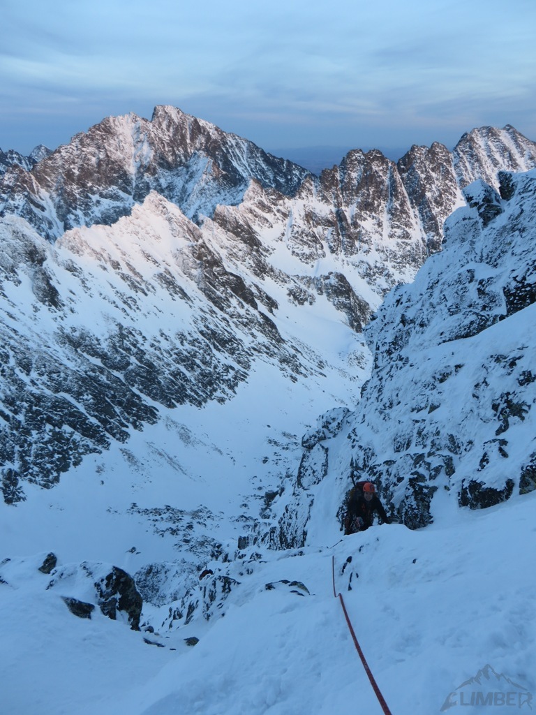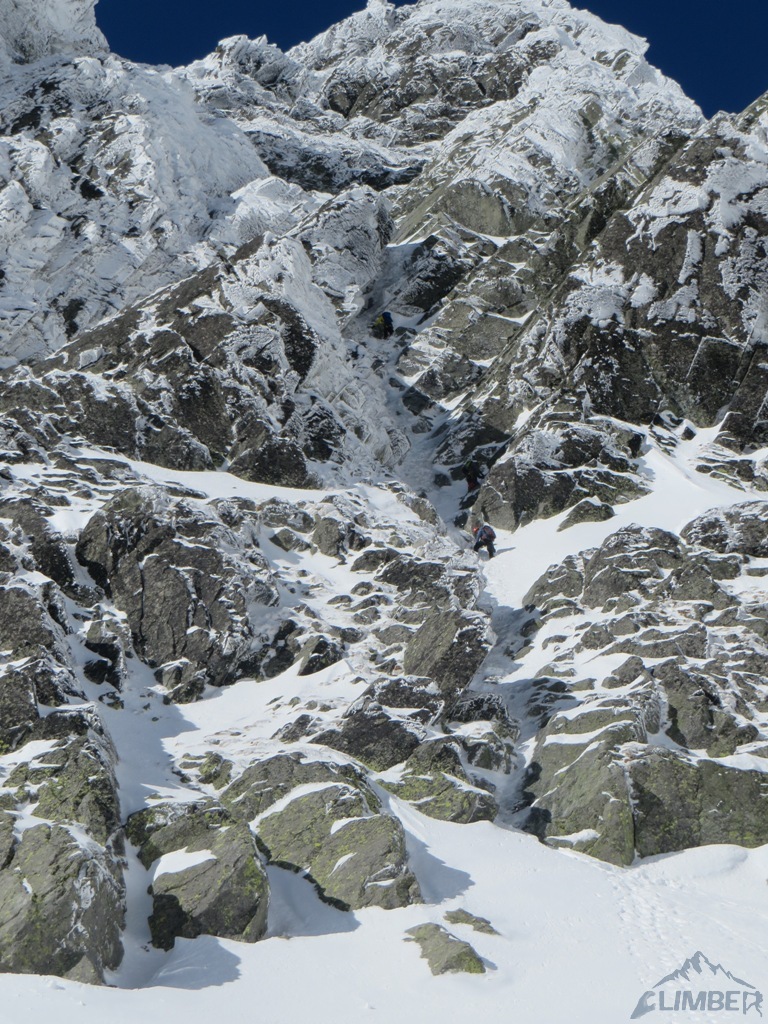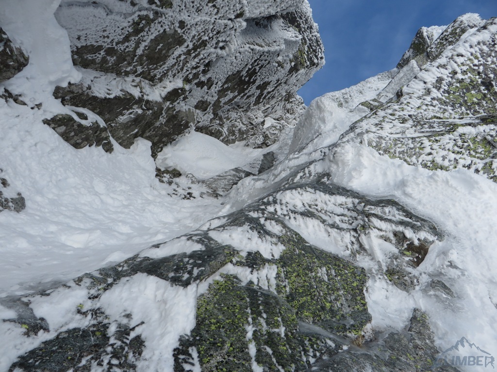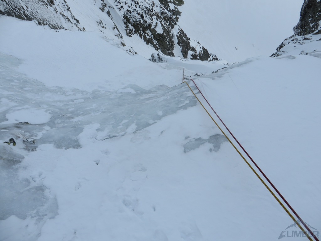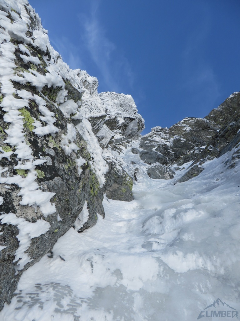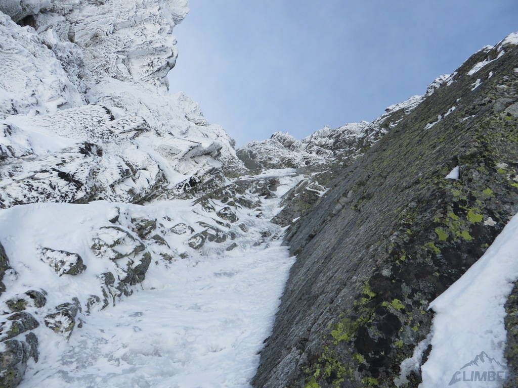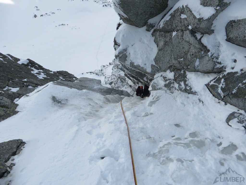 Droga okazuje się piękna i chyba jedyna tego rodzaju w Tatrach – cztery pierwsze wyciągi na długość liny to wspinanie w zalanych lodem zacięciach i kominach, poprzetykane odcinkami śnieżnymi. Z przyjemnością prowadzę całą drogę, humor psuje jedynie bombardowanie jakie fundują nam dwa zespoły nad nami – ze względu na charakter drogi wszystko spada w linii wspinania. Warunki nie są idealne, miejscami brakuje lodu lub skałę zakrywa luźny śnieg - przez to asekuracja jest trochę bardziej wymagająca.