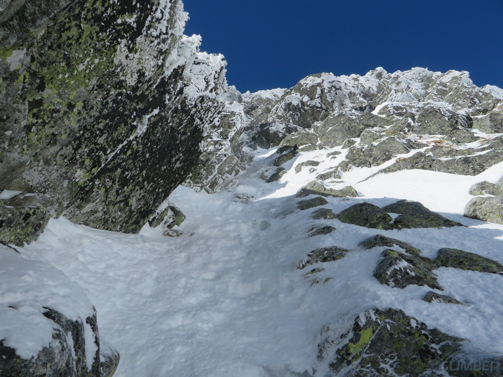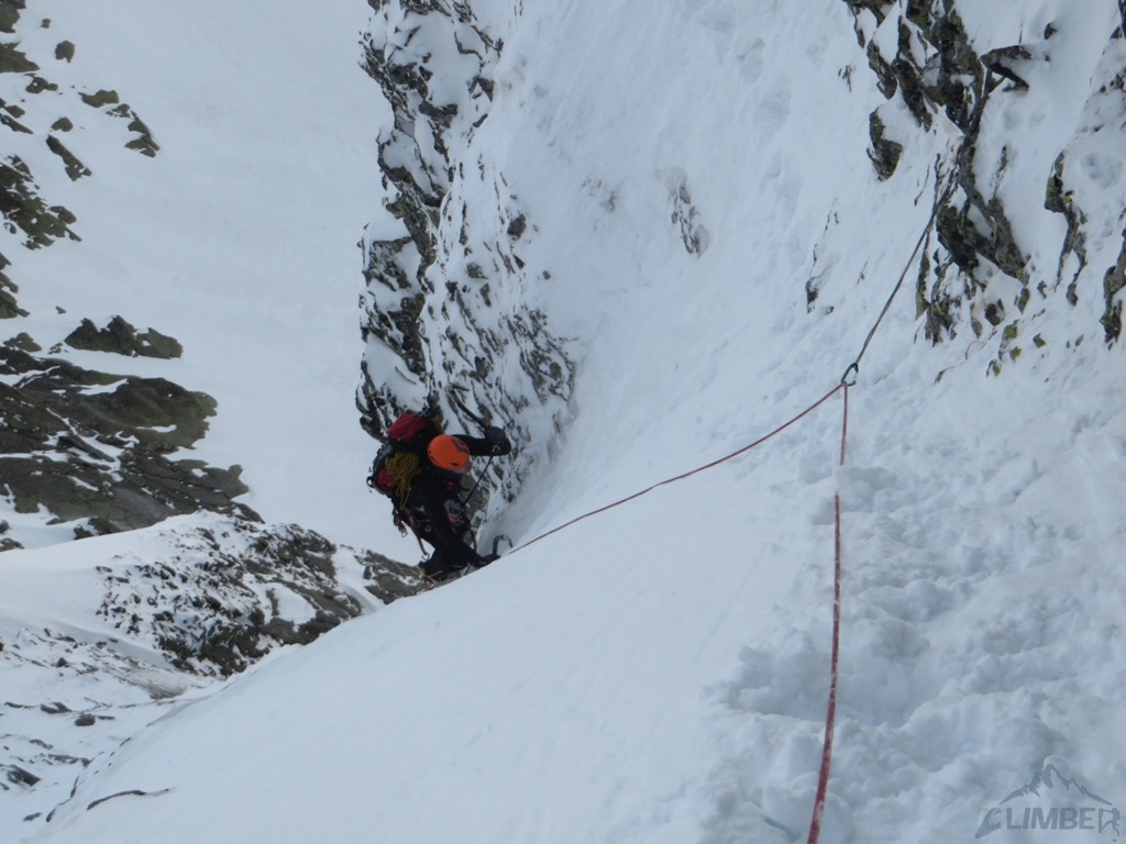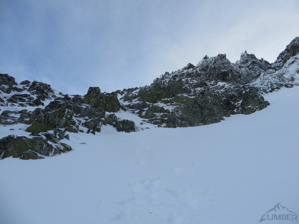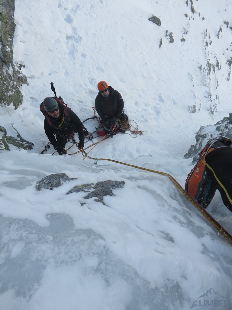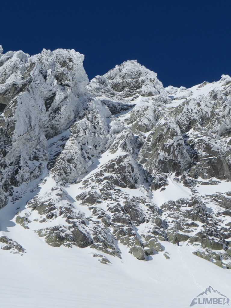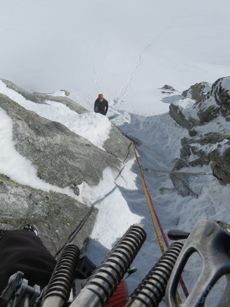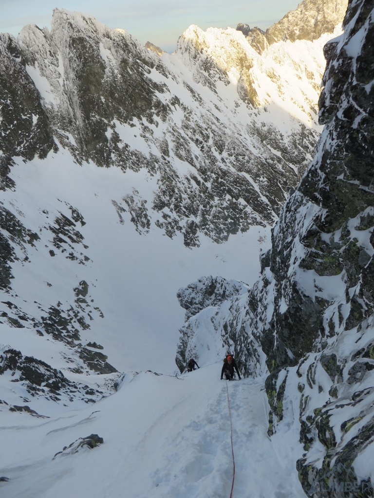 Droga okazuje się piękna i chyba jedyna tego rodzaju w Tatrach – cztery pierwsze wyciągi na długość liny to wspinanie w zalanych lodem zacięciach i kominach, poprzetykane odcinkami śnieżnymi. Z przyjemnością prowadzę całą drogę, humor psuje jedynie bombardowanie jakie fundują nam dwa zespoły nad nami – ze względu na charakter drogi wszystko spada w linii wspinania. Warunki nie są idealne, miejscami brakuje lodu lub skałę zakrywa luźny śnieg - przez to asekuracja jest trochę bardziej wymagająca.