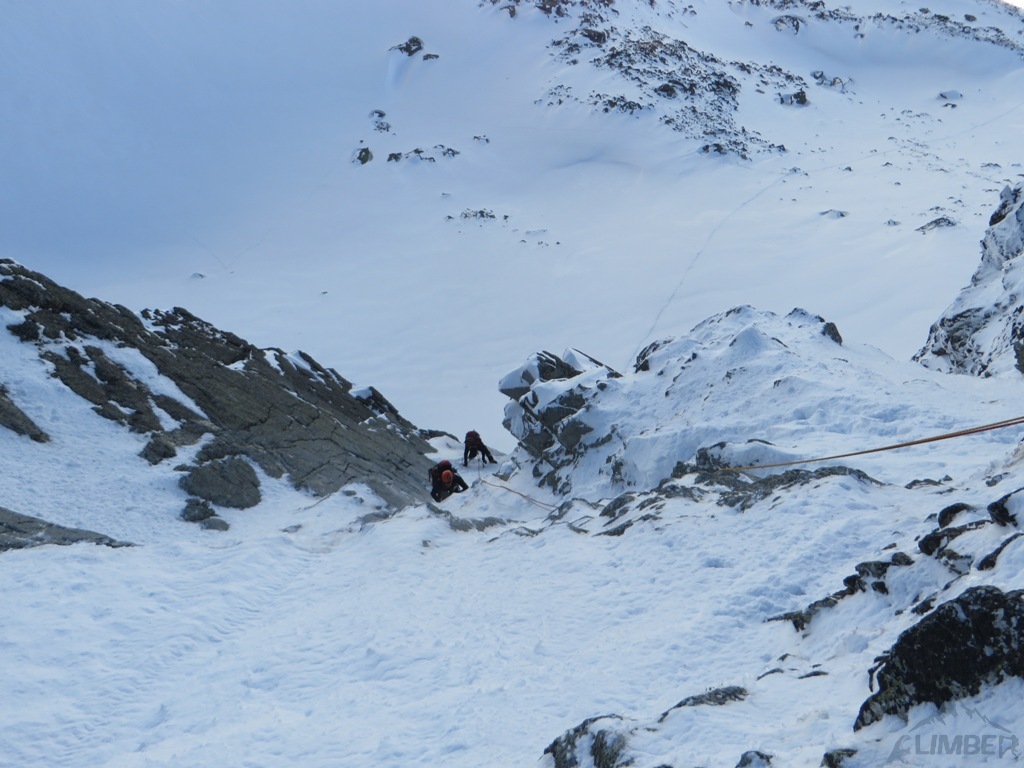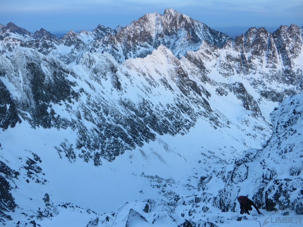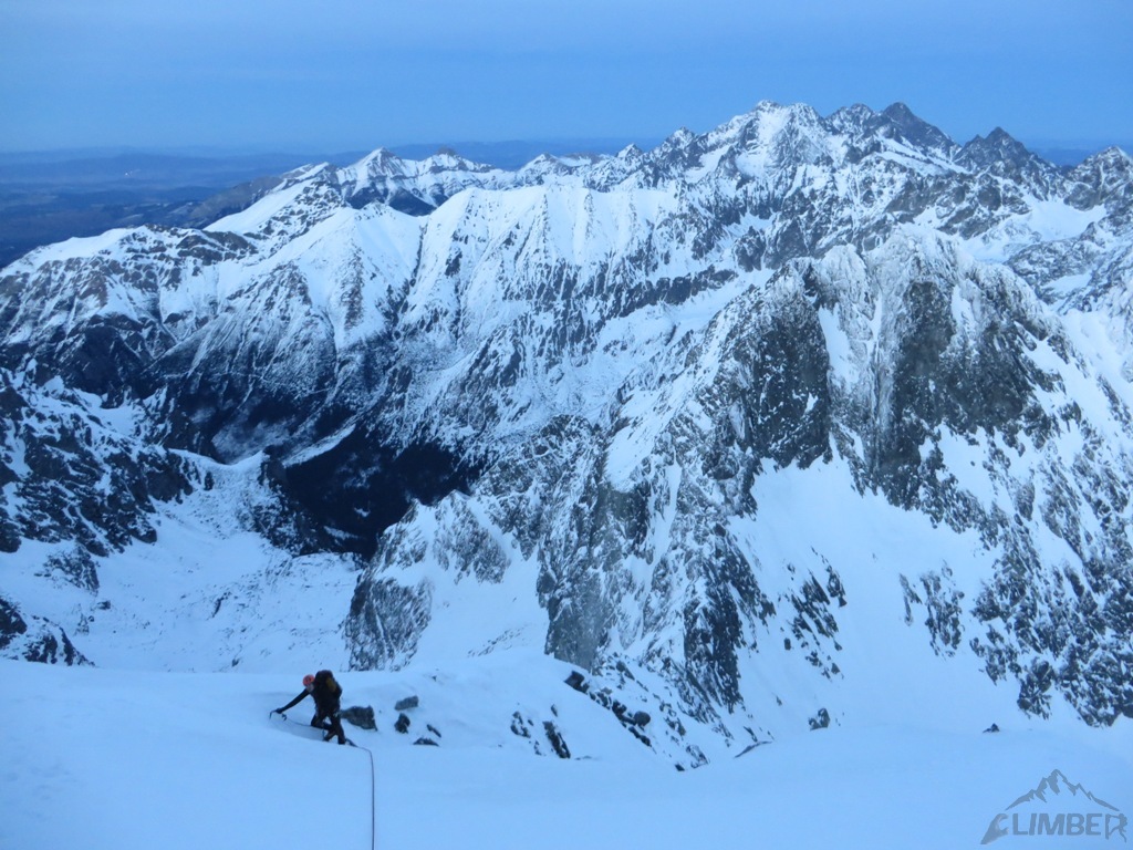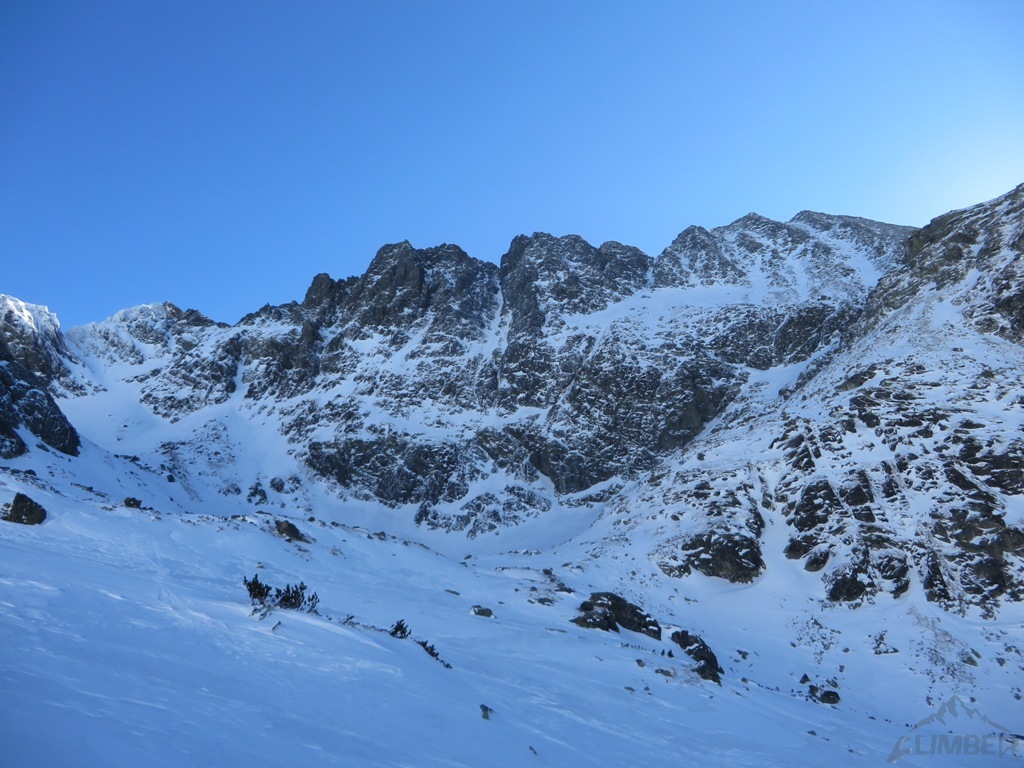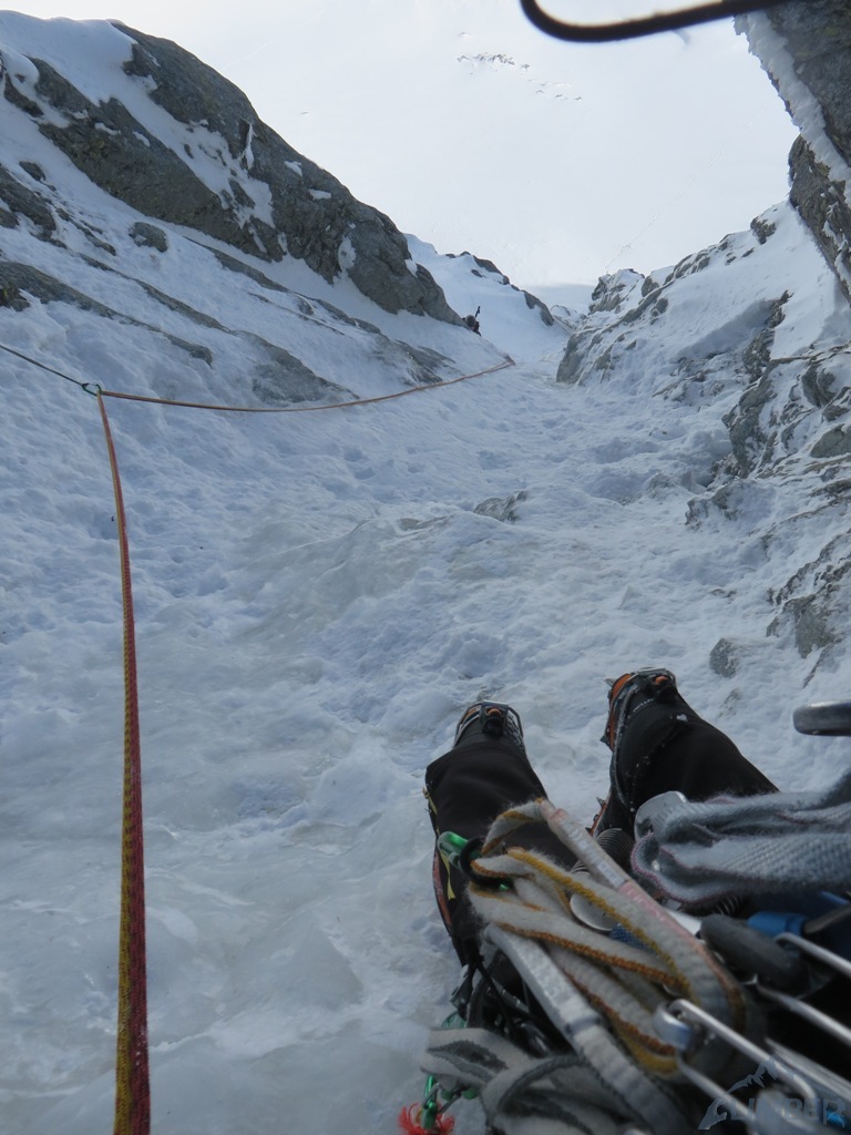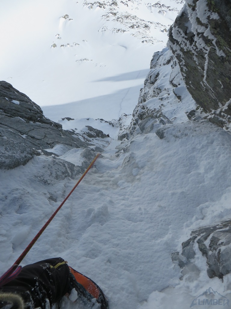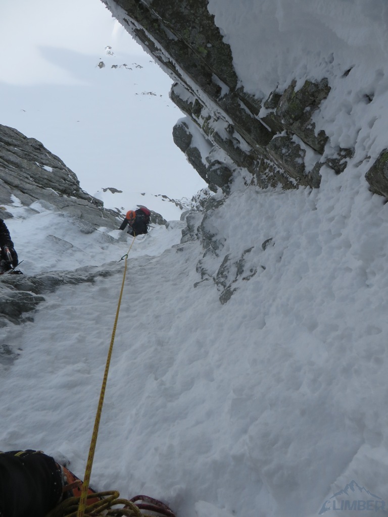 Droga okazuje się piękna i chyba jedyna tego rodzaju w Tatrach – cztery pierwsze wyciągi na długość liny to wspinanie w zalanych lodem zacięciach i kominach, poprzetykane odcinkami śnieżnymi. Z przyjemnością prowadzę całą drogę, humor psuje jedynie bombardowanie jakie fundują nam dwa zespoły nad nami – ze względu na charakter drogi wszystko spada w linii wspinania. Warunki nie są idealne, miejscami brakuje lodu lub skałę zakrywa luźny śnieg - przez to asekuracja jest trochę bardziej wymagająca.