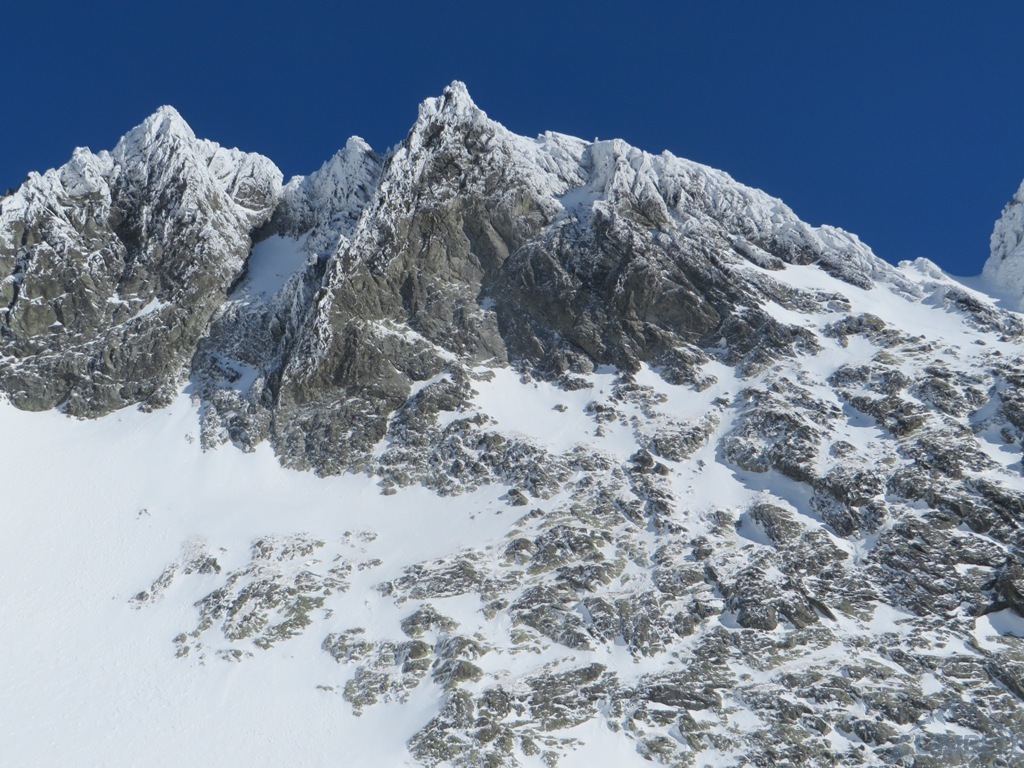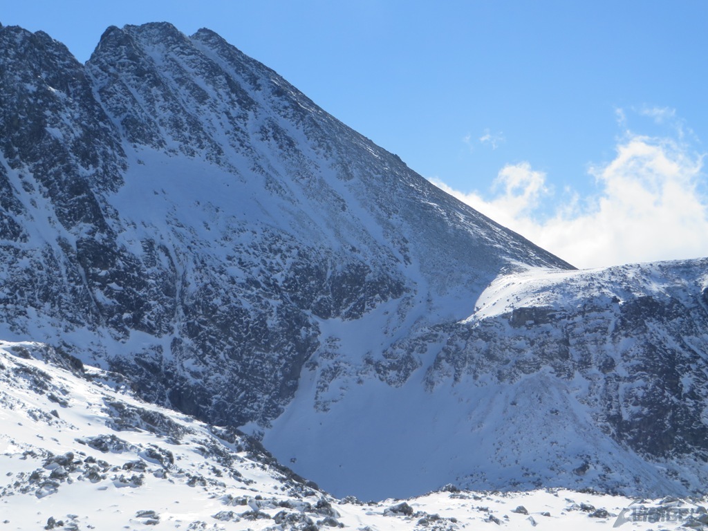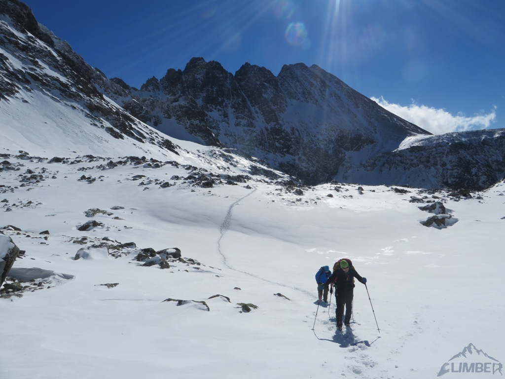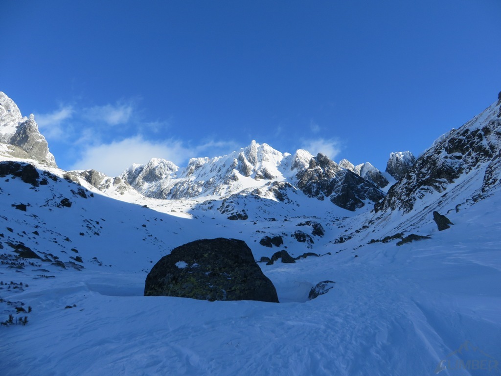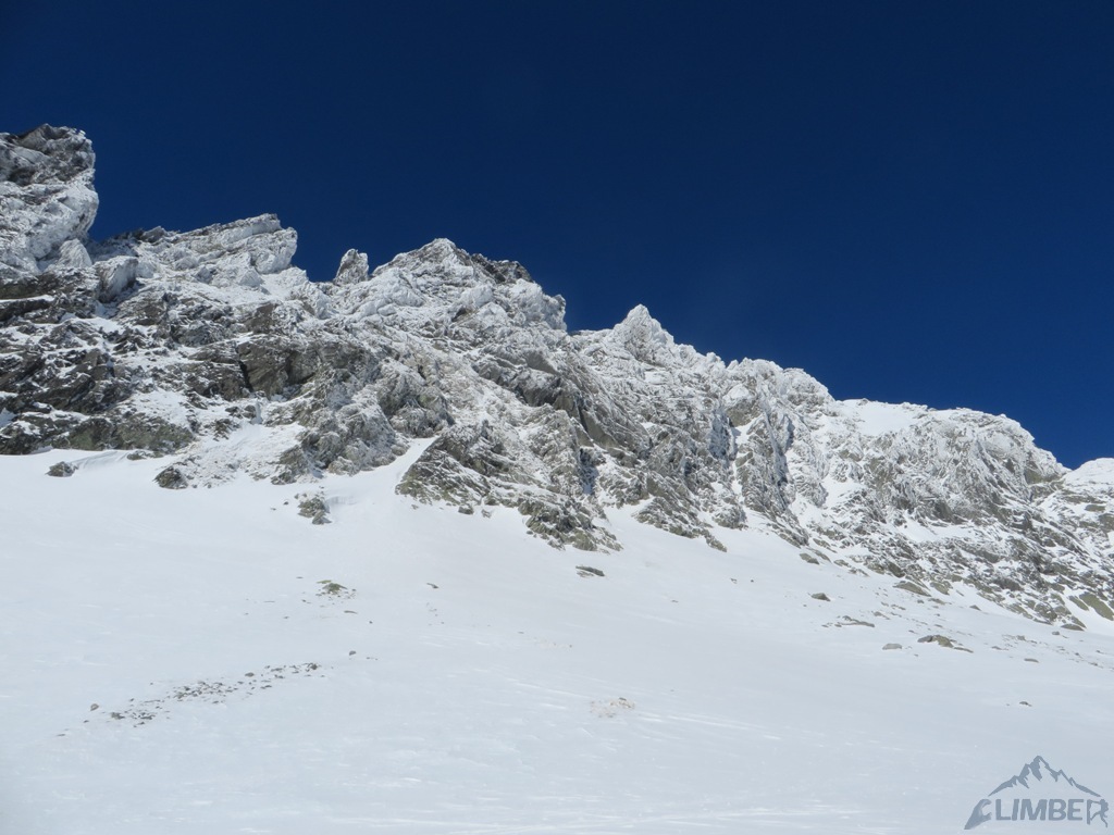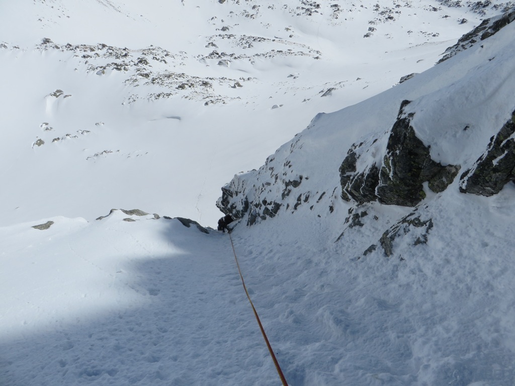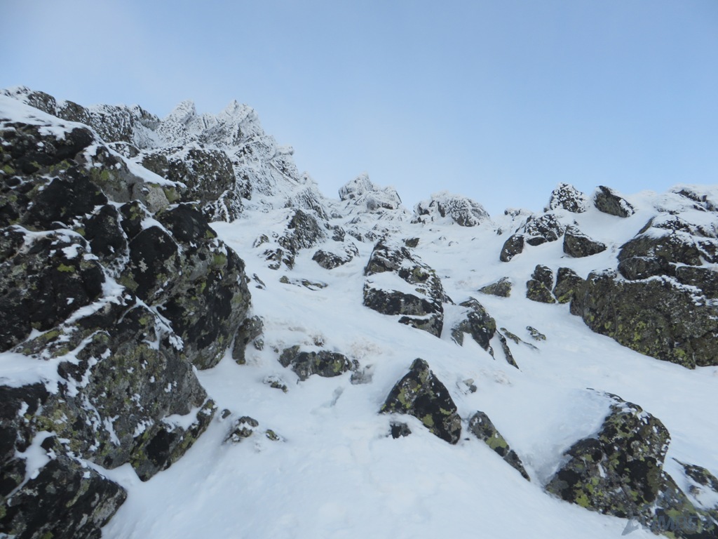 Droga okazuje się piękna i chyba jedyna tego rodzaju w Tatrach – cztery pierwsze wyciągi na długość liny to wspinanie w zalanych lodem zacięciach i kominach, poprzetykane odcinkami śnieżnymi. Z przyjemnością prowadzę całą drogę, humor psuje jedynie bombardowanie jakie fundują nam dwa zespoły nad nami – ze względu na charakter drogi wszystko spada w linii wspinania. Warunki nie są idealne, miejscami brakuje lodu lub skałę zakrywa luźny śnieg - przez to asekuracja jest trochę bardziej wymagająca.