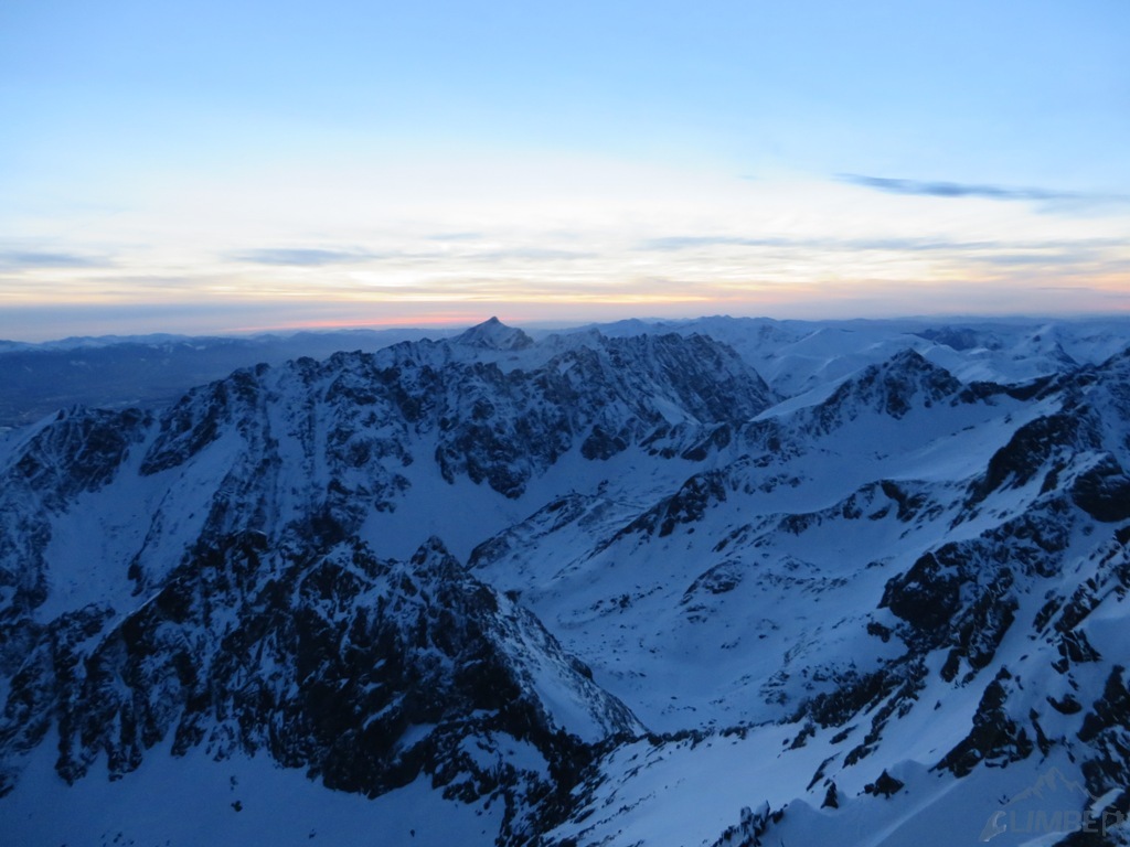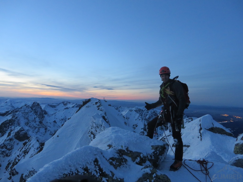 Po czterech długościach liny przechodzimy na lotną i szybko pokonujemy kolejne metry drogi. Ponieważ jednak mieliśmy opóźniony start, na szczycie Wysokiej stawiamy się tuż przed zachodem Słońca, a zjazd do żlebu robimy już po ciemku. Pozostaje szybkie zejście w dolinę i do schroniska, gdzie czeka grupa klubowiczów żądnych integracji. Po takiej drodze świętowanie zasłużone 😊.