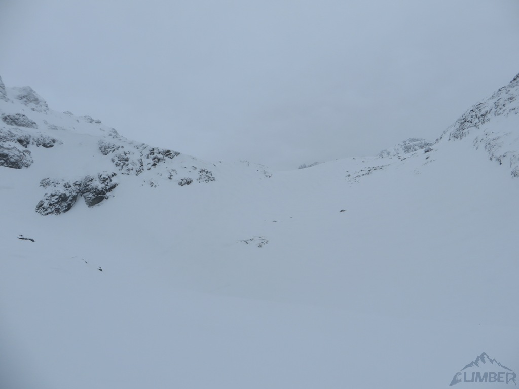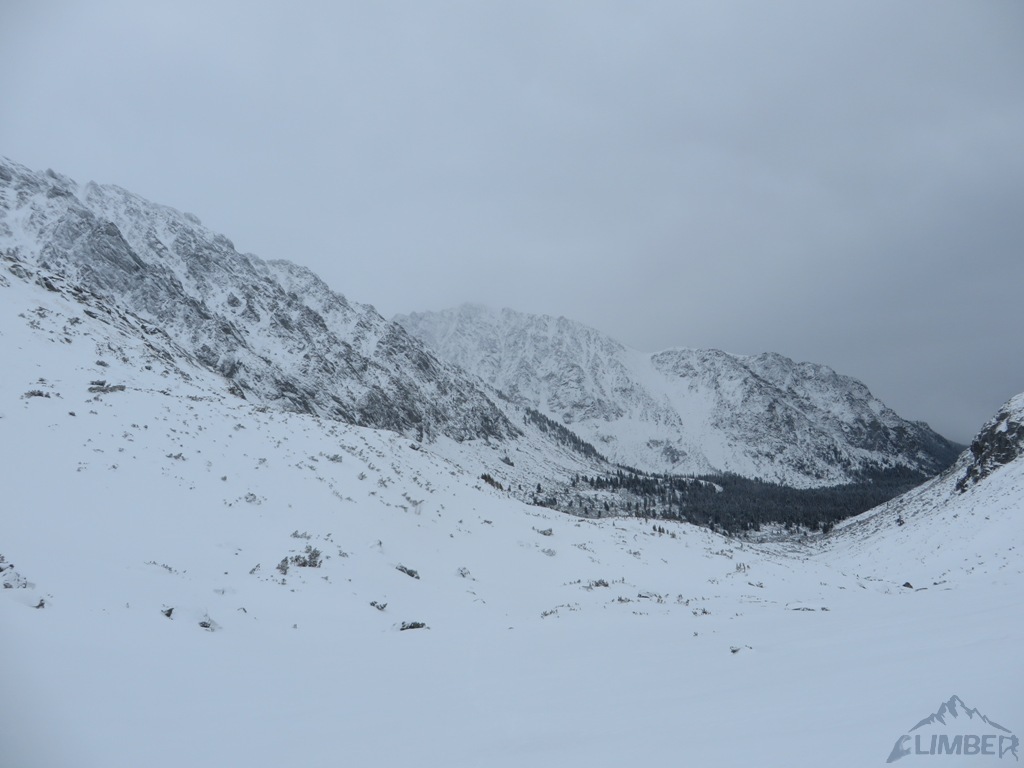 Środa niestety wita nas opadem śniegu i mocnym wiatrem – nici z planów na wspinanie. Zabieram więc tury i postanawiam podejść do Szatanie Dolinki by obejrzeć drogę planowaną na weekend – Motykę na Wyżnią Basztową Przełęcz. Niestety droga jest w stanie nie dającym szans na przejście. Podchodzę dalej pod Hińczowe Stawy jednak dalsze opady i wiatr odbierają mi ochotę na zapędzanie się wyżej.