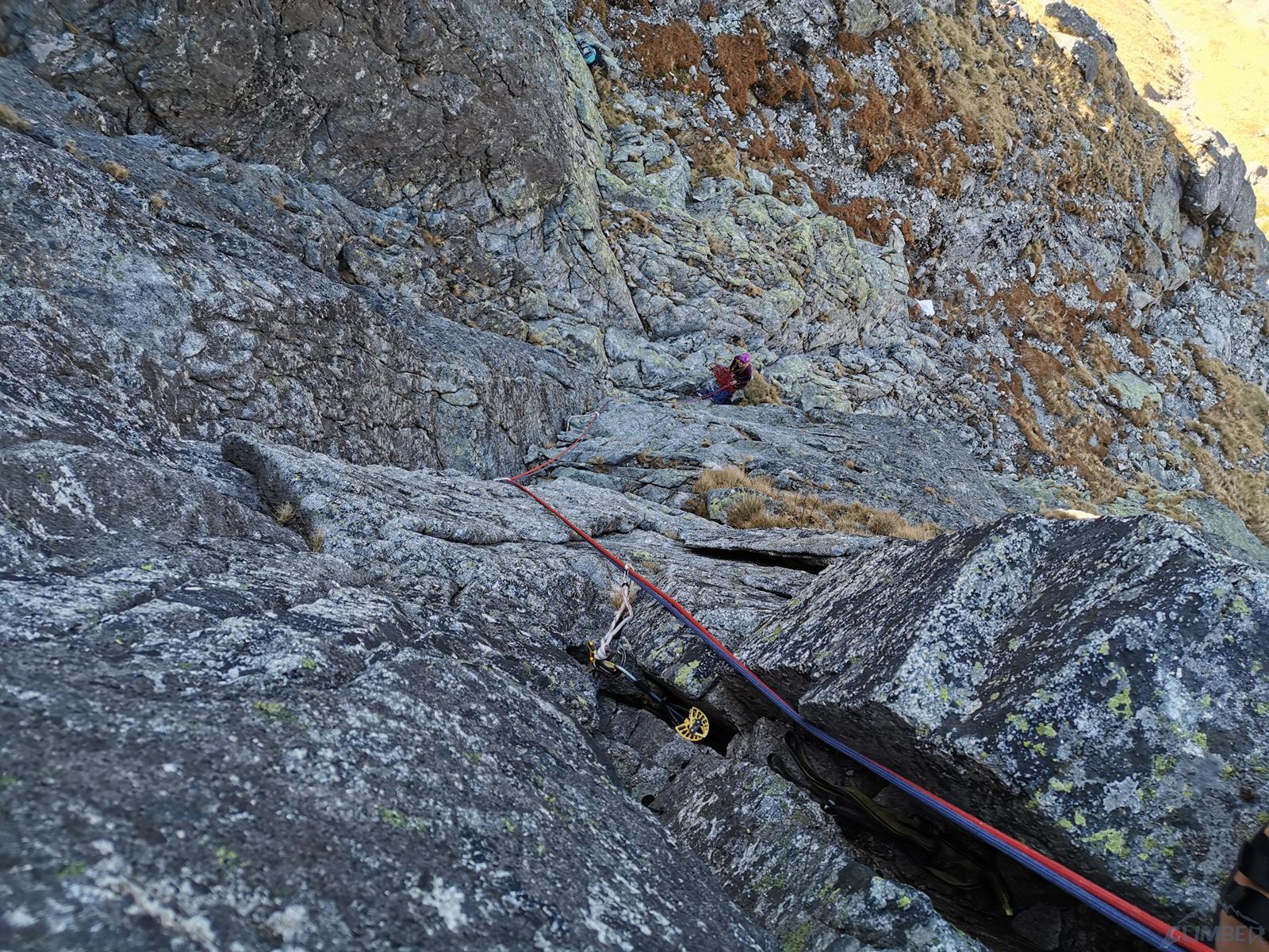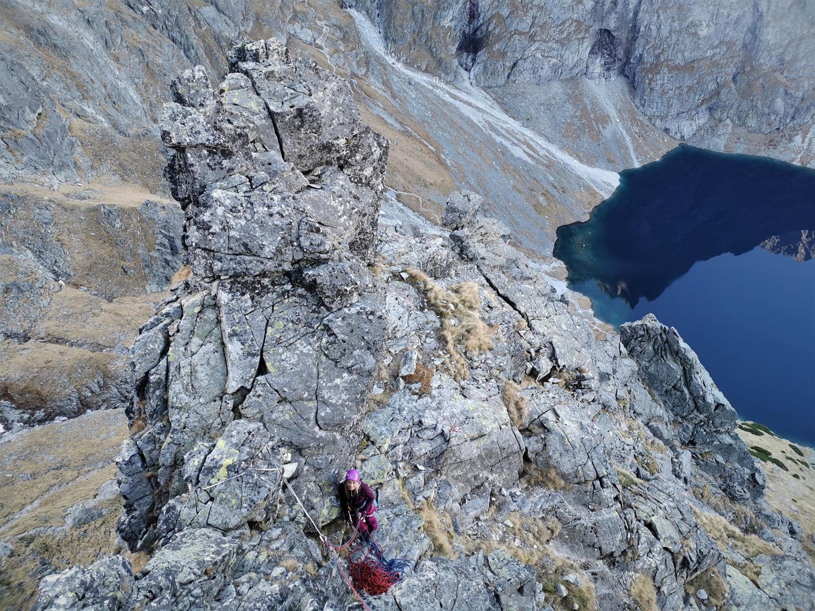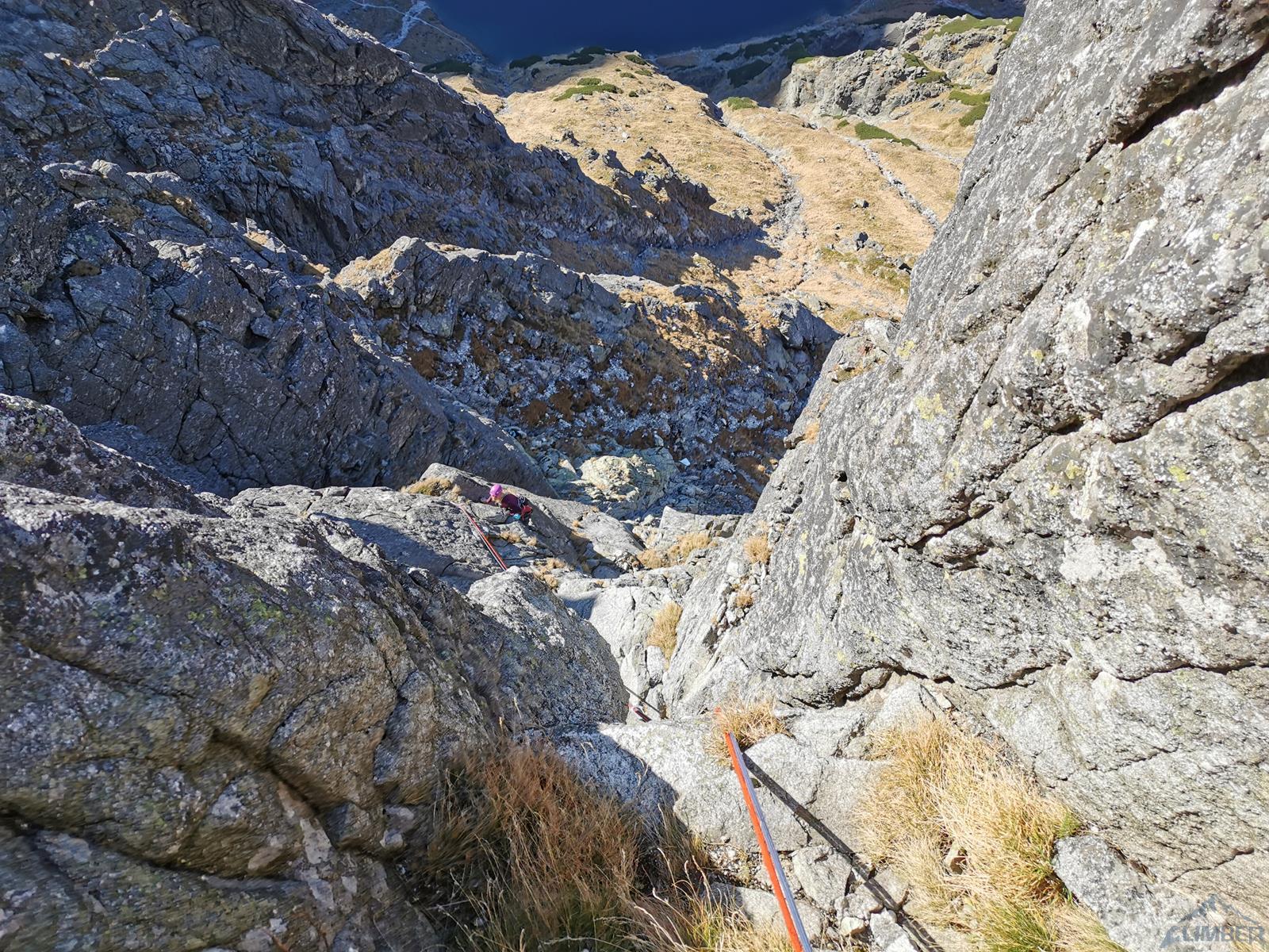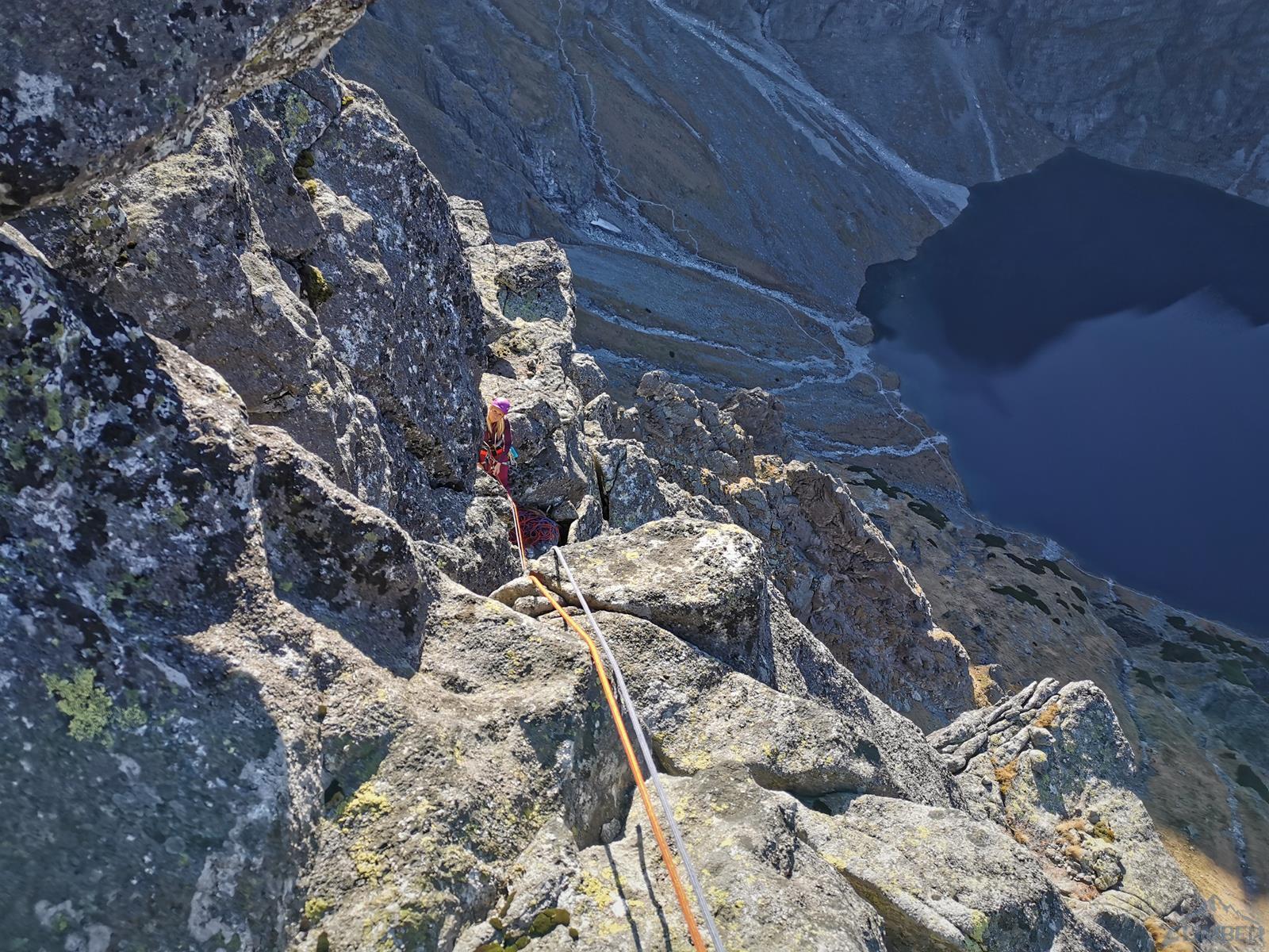 Z Lalkowego Przechodu wspinam się na wprost ścianką, powyżej której trawersuję w prawo – idę za daleko, do Półki z Jałowcem docieram porośniętym zacięciem. W to miejsce ściągam Anię i ruszam dalej – najpierw kilka metrów do góry, po czym zgodnie z foto-topo trawersem do drogi normalnej i nią już na wierzchołek. Jednym 50-metrowym zjazdem zjeżdżamy do miejsca oddalonego zaledwie kilkanaście metrów od Przechodu. Przy okazji oglądam bardzo ładny wariant końcowy na Grani – Rysę Kozika (VI, hak), zdecydowanie polecam wybór tej opcji by było ciekawiej.