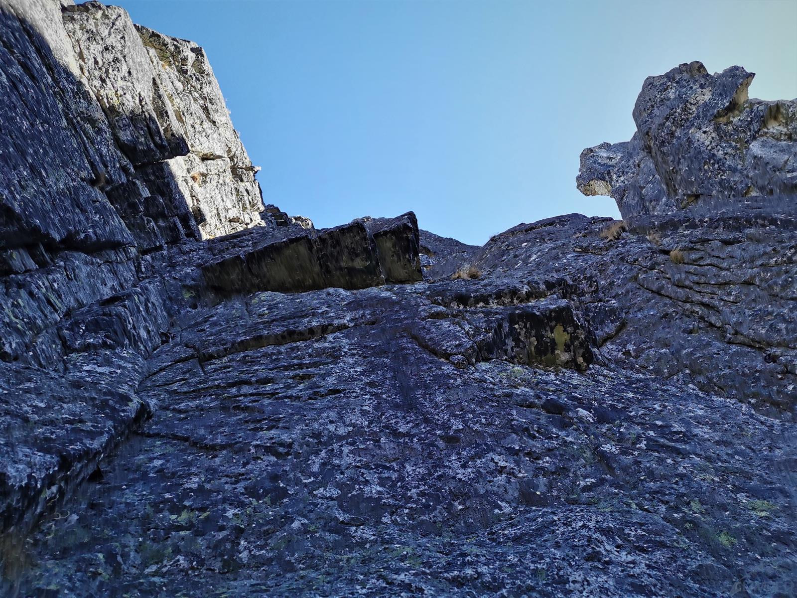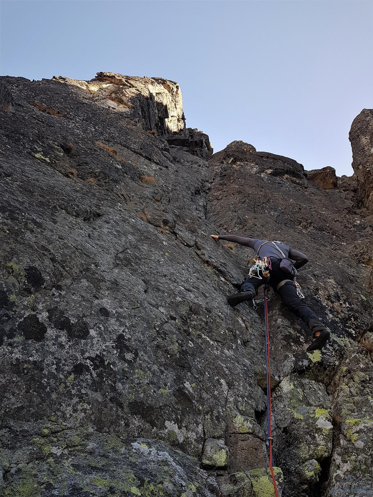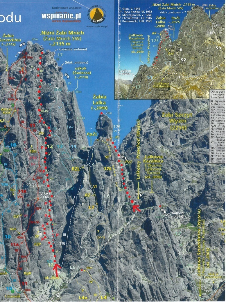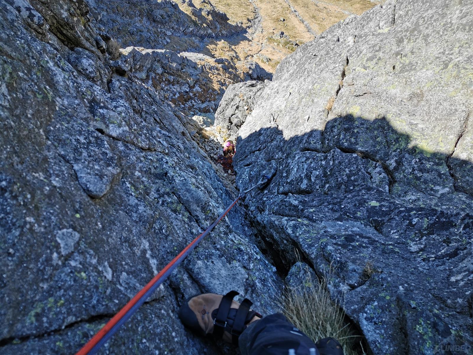 Z Lalkowego Przechodu wspinam się na wprost ścianką, powyżej której trawersuję w prawo – idę za daleko, do Półki z Jałowcem docieram porośniętym zacięciem. W to miejsce ściągam Anię i ruszam dalej – najpierw kilka metrów do góry, po czym zgodnie z foto-topo trawersem do drogi normalnej i nią już na wierzchołek. Jednym 50-metrowym zjazdem zjeżdżamy do miejsca oddalonego zaledwie kilkanaście metrów od Przechodu. Przy okazji oglądam bardzo ładny wariant końcowy na Grani – Rysę Kozika (VI, hak), zdecydowanie polecam wybór tej opcji by było ciekawiej.