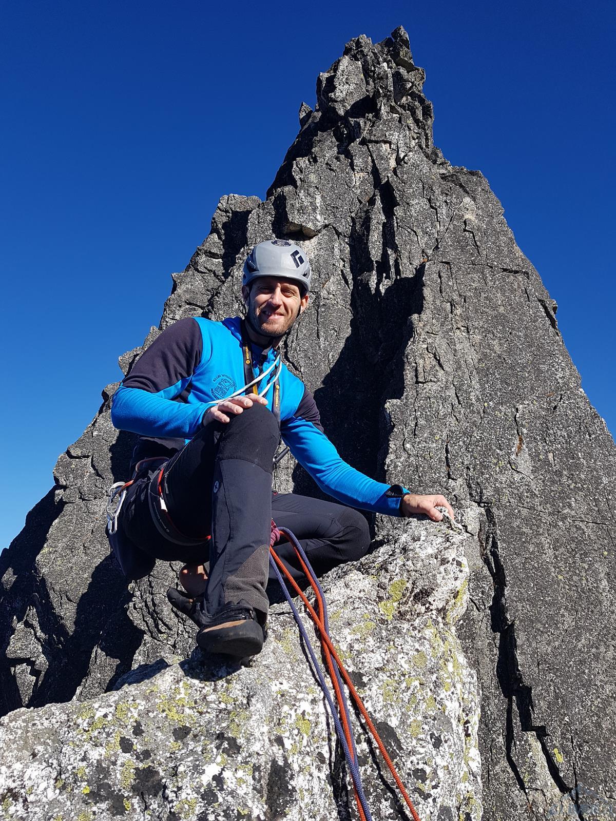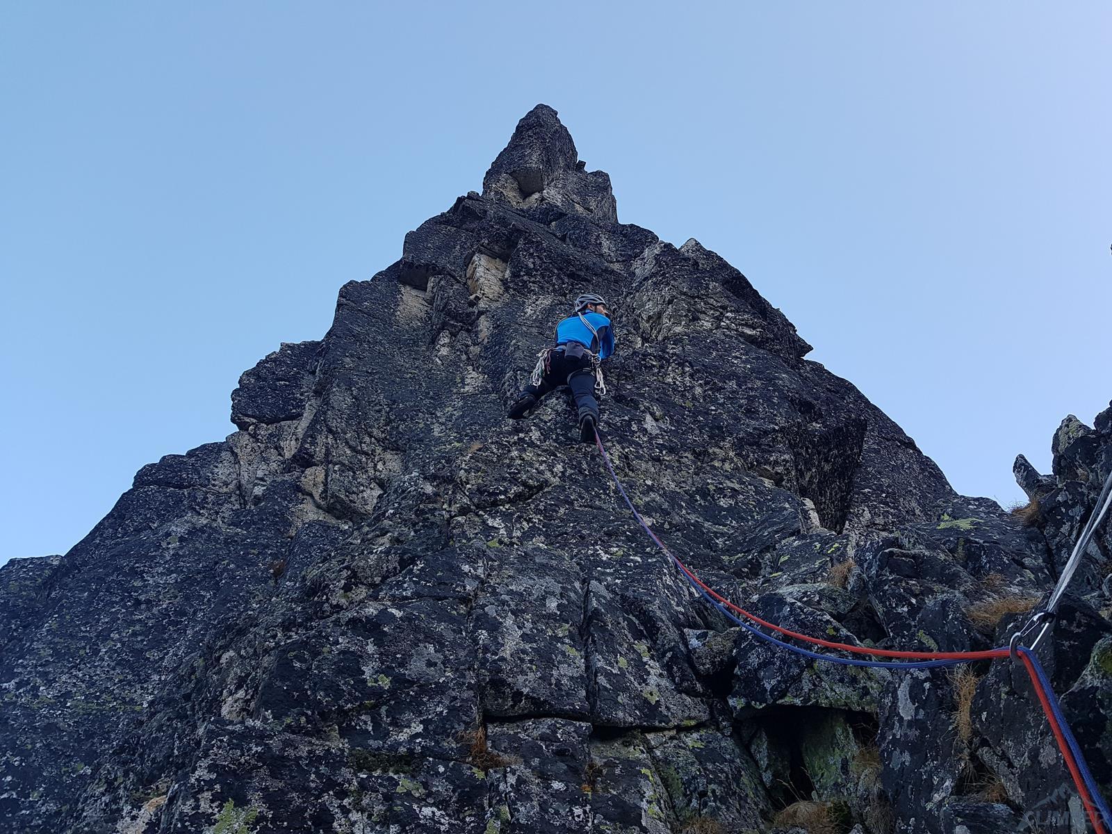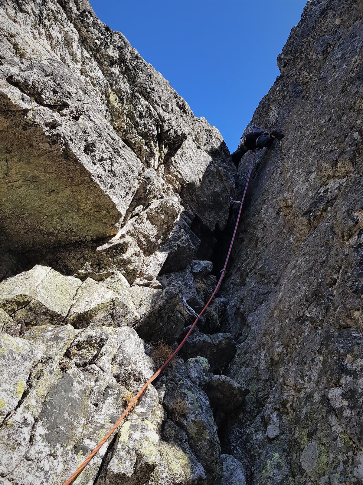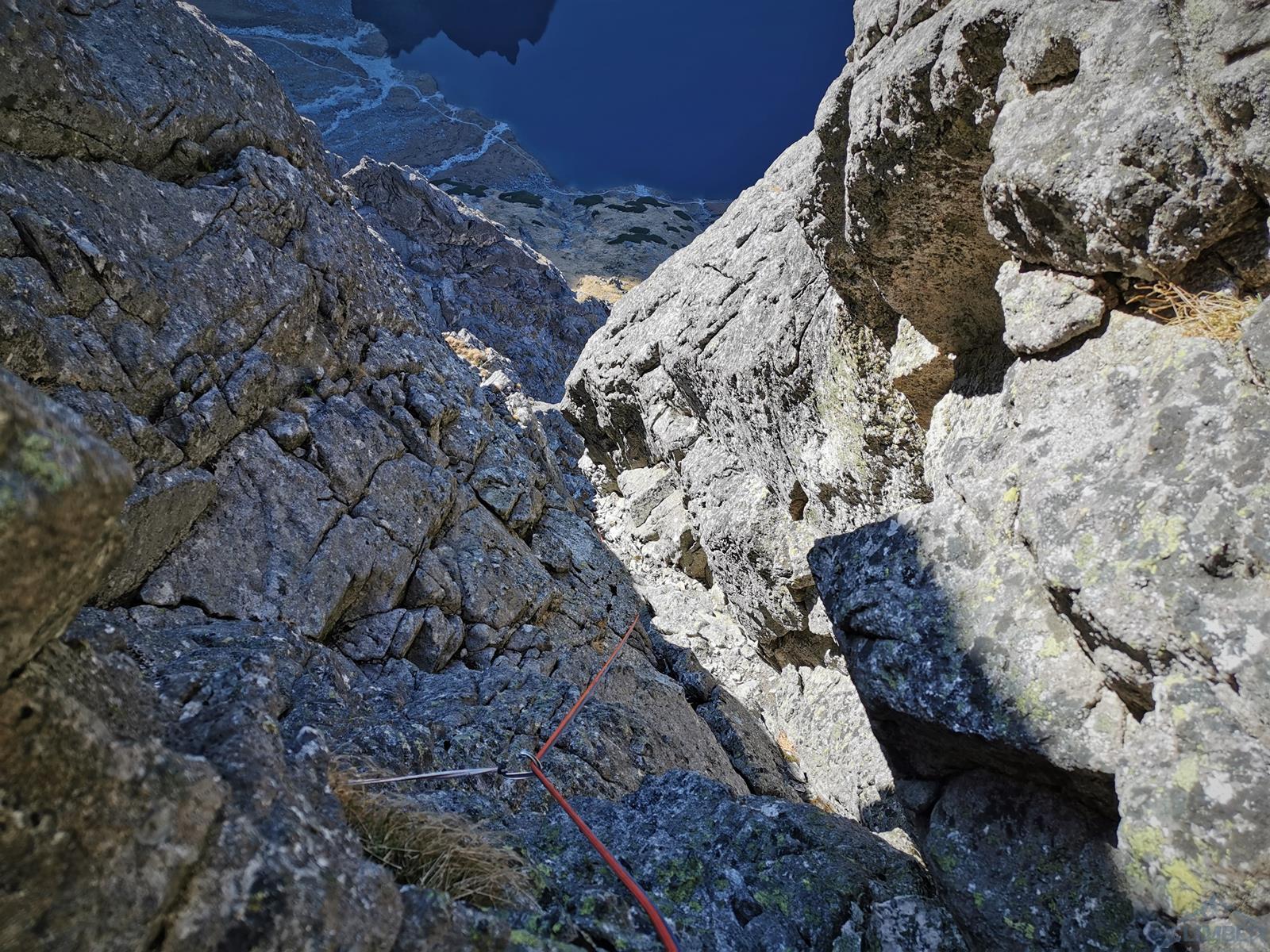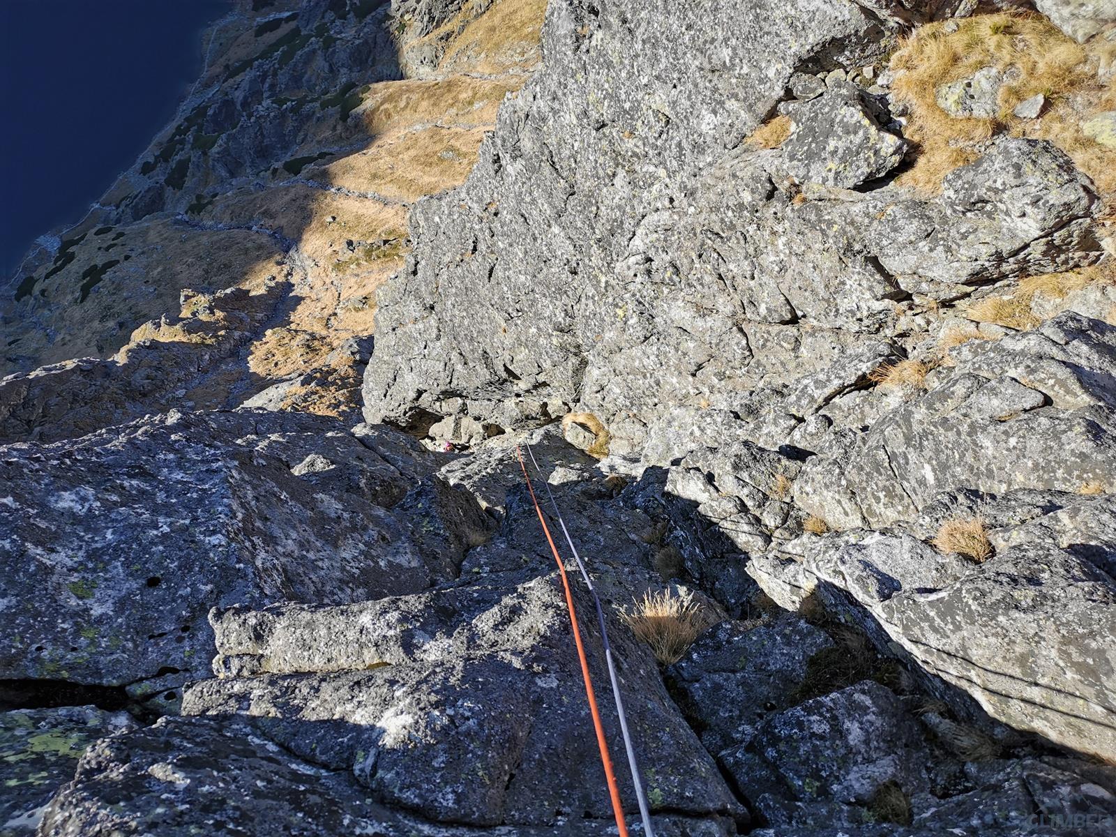 Kolejny wyciąg zaczyna się kruchą ścianką, po której wchodzi się w zacięcie przechodzące w ciasny komin, przewieszający się u wylotu (słaby hak). Wygląda trudniej niż jest w rzeczywistości (V+). Wychodzę na półkę i robię stanowisko dorzucając coś do jednego haka. Czas na czwórkowy wyciąg – patrzymy do góry a tam przewieszony otwarty komin z wątpliwą asekuracją, droga znowu zaskakuje 😊. Okazuje się jednak, że zgodnie z wyceną jest łatwo, przy czym bardzo ciekawie. Po przejściu komina kontynuujemy depresją, przewieszenie u jej wylotu obchodząc po prawej. Można zrobić stan ze spotkanego haka, ja jednak idę dalej jak puszcza (trudności niewielkie, III-IV). Gdy kończy się lina, ściągam partnerkę i kończymy drogę, przechodząc ostatnie 15-metrów na szczyt Żabiego Kapucyna. Po jednym krótkim zjeździe jesteśmy na Żabiej Szczerbinie, drugim dostajemy się na ścieżkę. By wrócić do miejsca startu schodzimy kilka metrów i wchodzimy na eksponowany Lalkowy Chodnik (I), którym docieramy do Lalkowego Przechodu, z którego ponownie schodzimy do plecaków i pod ścianę. Jeszcze tylko żleb, szlak, asfalt, kolacja w Roztoce i rozjeżdżamy się. Ania wraca ze znajomymi, ja zostaję na kwaterze – za kilka godzin przyjedzie wypoczęty kolega na drugą część planu, piękną Ódę na radosť (VII+) na Kieżmarskim Szczycie!