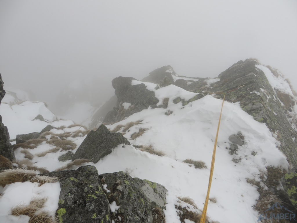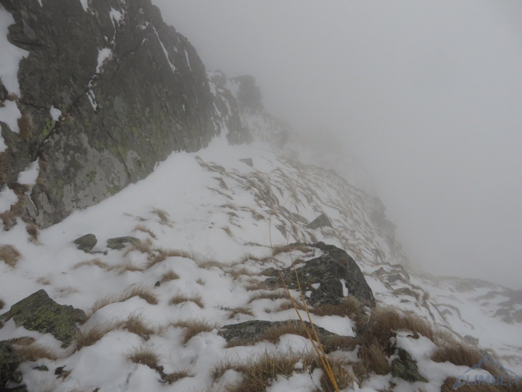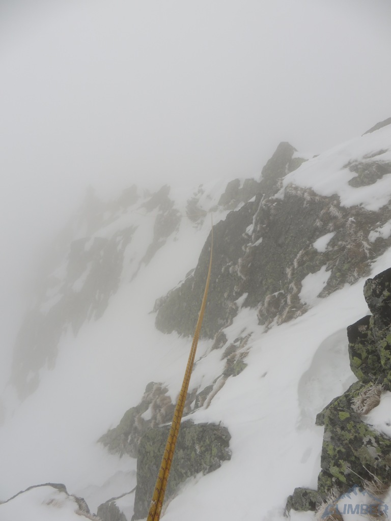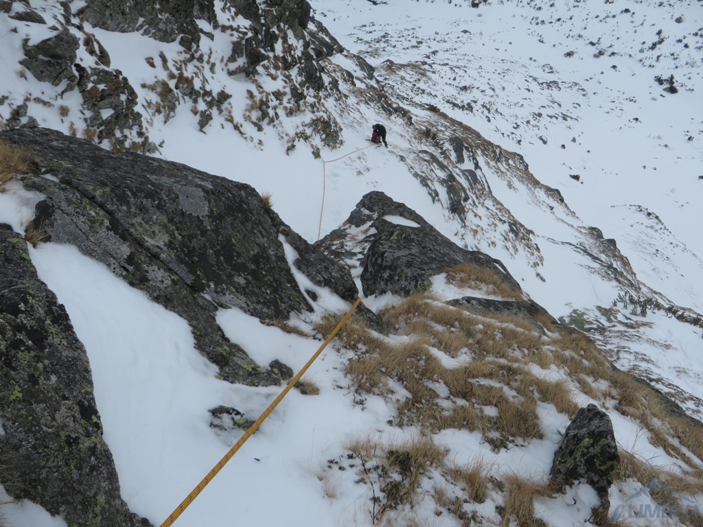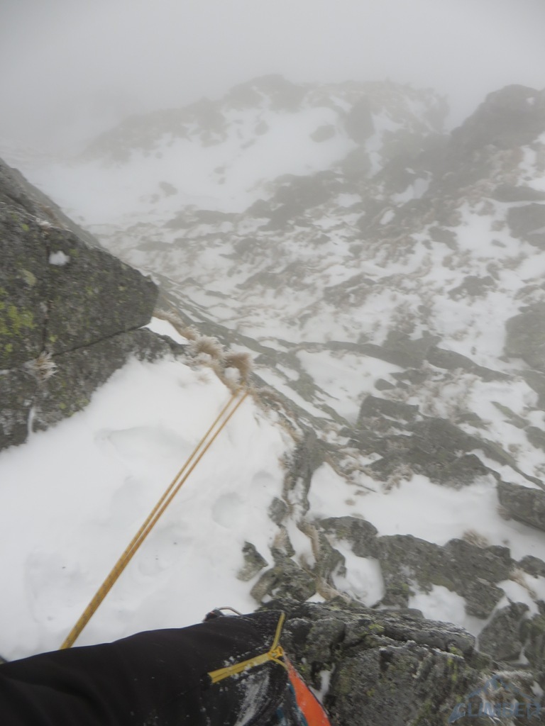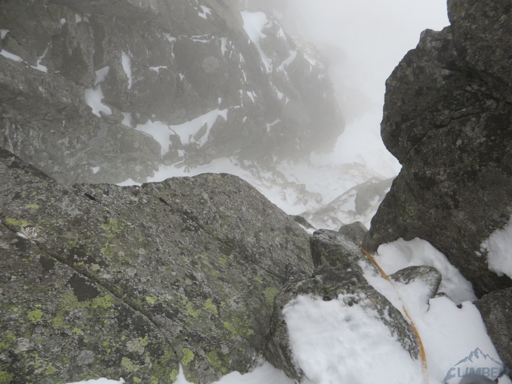 Początkowo idziemy na lotnej bo trudności są dwójkowe i trójkowe, do momentu aż drogę odgradza kilkumetrowa ścianka. Nie znajdując obejścia decyduję się na prowadzenie, miejsce jest jednak raczej rzadko chodzone, a jedyny hak na jaki trafiam (zresztą na całej drodze) pamięta chyba czasy Motyki 😉. Później teren już się kładzie, ciśniemy więc ostro do góry. W miejscu gdzie żebro przechodzi w grań podszczytową trafiamy jeszcze trudniejszą płytkę. Pogoda nadal się pogarsza, a na grzbiecie Tępej meldujemy się tuż przed zmrokiem.