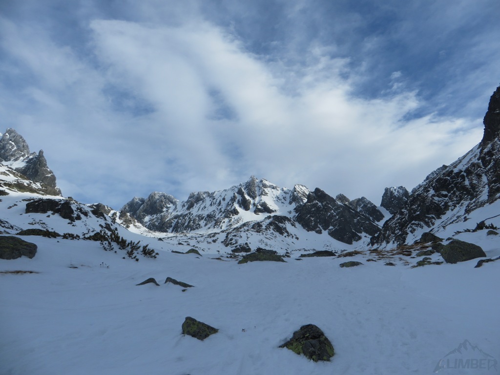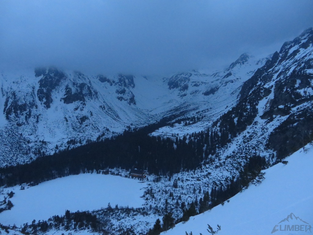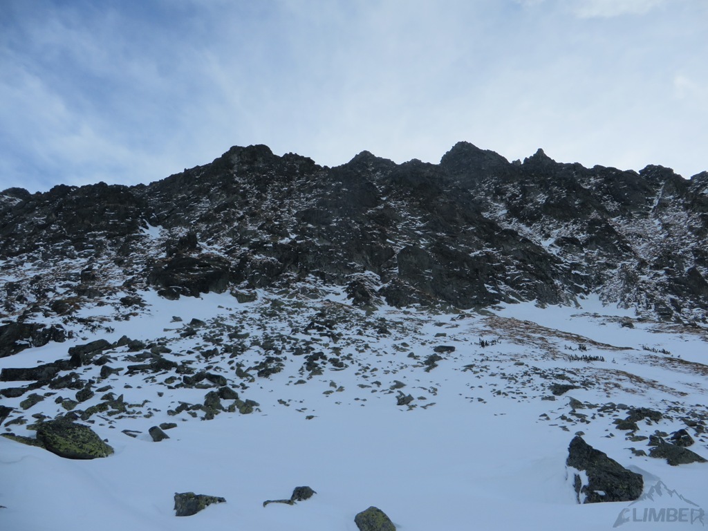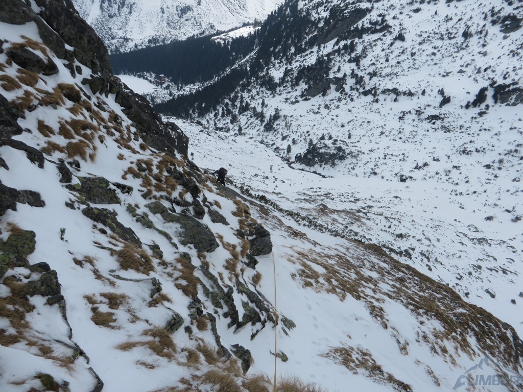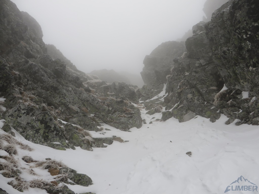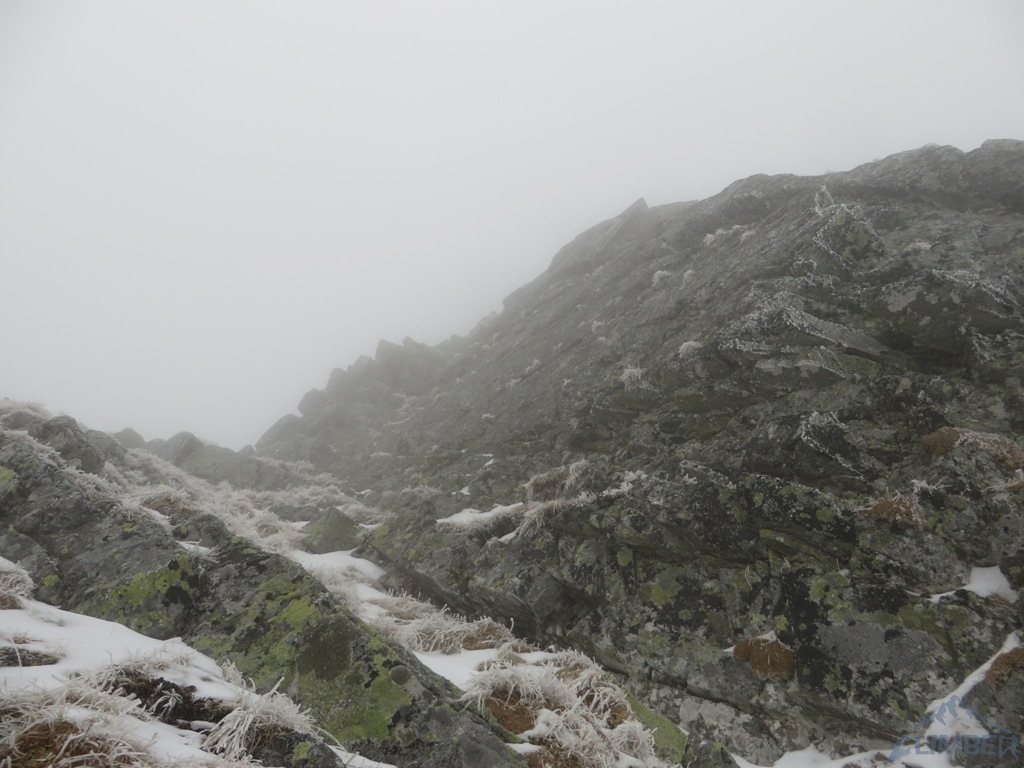 Początkowo idziemy na lotnej bo trudności są dwójkowe i trójkowe, do momentu aż drogę odgradza kilkumetrowa ścianka. Nie znajdując obejścia decyduję się na prowadzenie, miejsce jest jednak raczej rzadko chodzone, a jedyny hak na jaki trafiam (zresztą na całej drodze) pamięta chyba czasy Motyki 😉. Później teren już się kładzie, ciśniemy więc ostro do góry. W miejscu gdzie żebro przechodzi w grań podszczytową trafiamy jeszcze trudniejszą płytkę. Pogoda nadal się pogarsza, a na grzbiecie Tępej meldujemy się tuż przed zmrokiem.