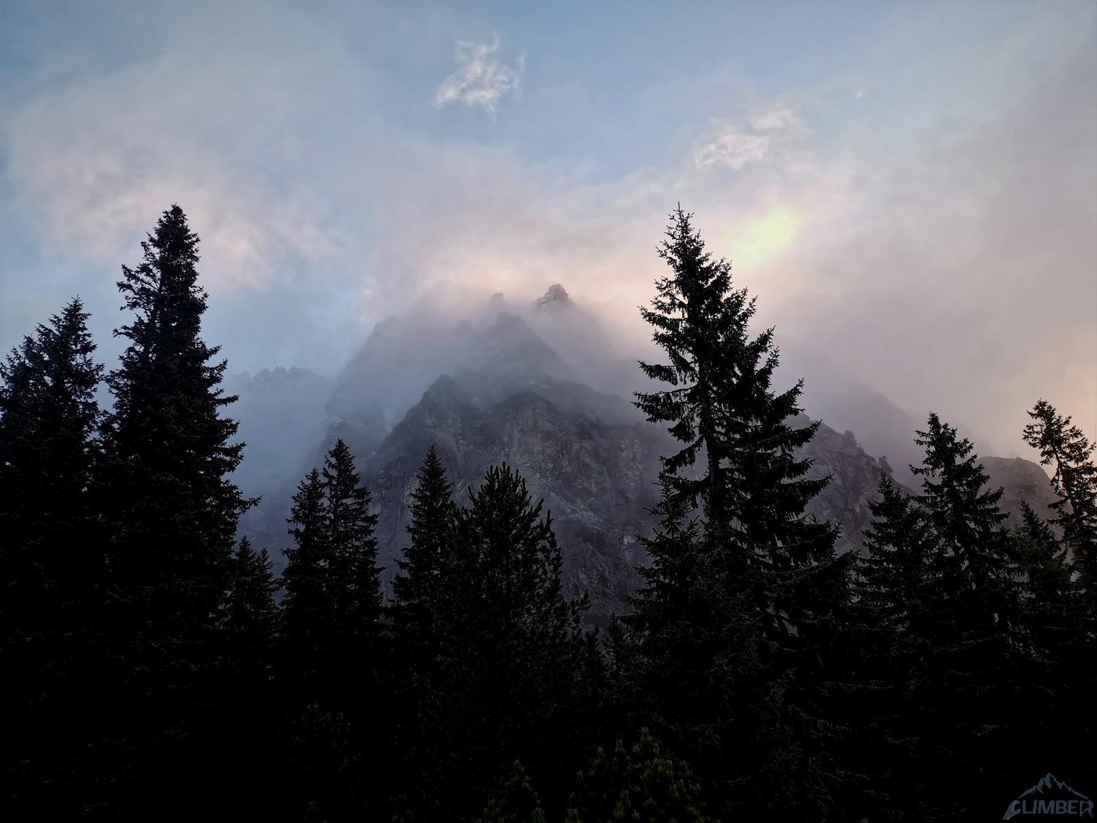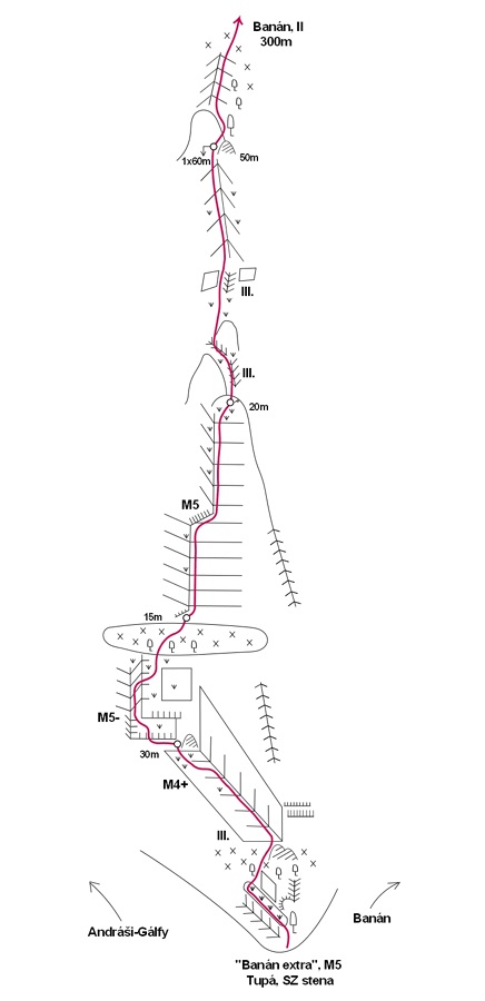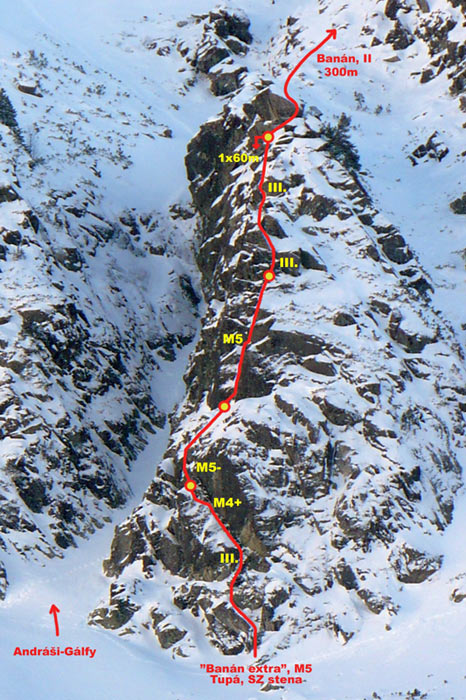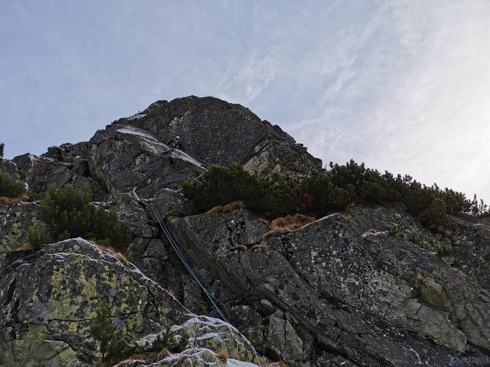 Wspinać zaczynamy się dopiero przed 13-tą, stąd decyzja by po zrobieniu drogi zjechać do żlebu i wrócić pod ścianę. Jak ktoś ma czas i ochotę można przygodę przedłużyć idąć na samą górę dwójkowym Bananem. Pierwszy wyciąg zaczyna się łatwym odcinkiem trawkowo-skalnym, po którym dochodzimy pod skośne, bardzo charakterystyczne zacięcie (M4+), po przejściu którego budujemy stanowisko (zarówno po drodze jak i w miejscu stanowiska nie ma żadnych stałych punktów). Drugi wyciąg zaczyna się dość niewygodnym odcinkiem po płycie (skośnie do góry w lewo), po paru metrach wychodzimy na trawy i podchodzimy do gotowego stanowiska pod zacięciem. Ten odcinek można ominąć schodząc dwa metry w dół i trawersując w lewo za komin, po czym jak puszcza do góry - skała tam jest mocno porysowana rakami więc pewno sporo ludzi tak robi.