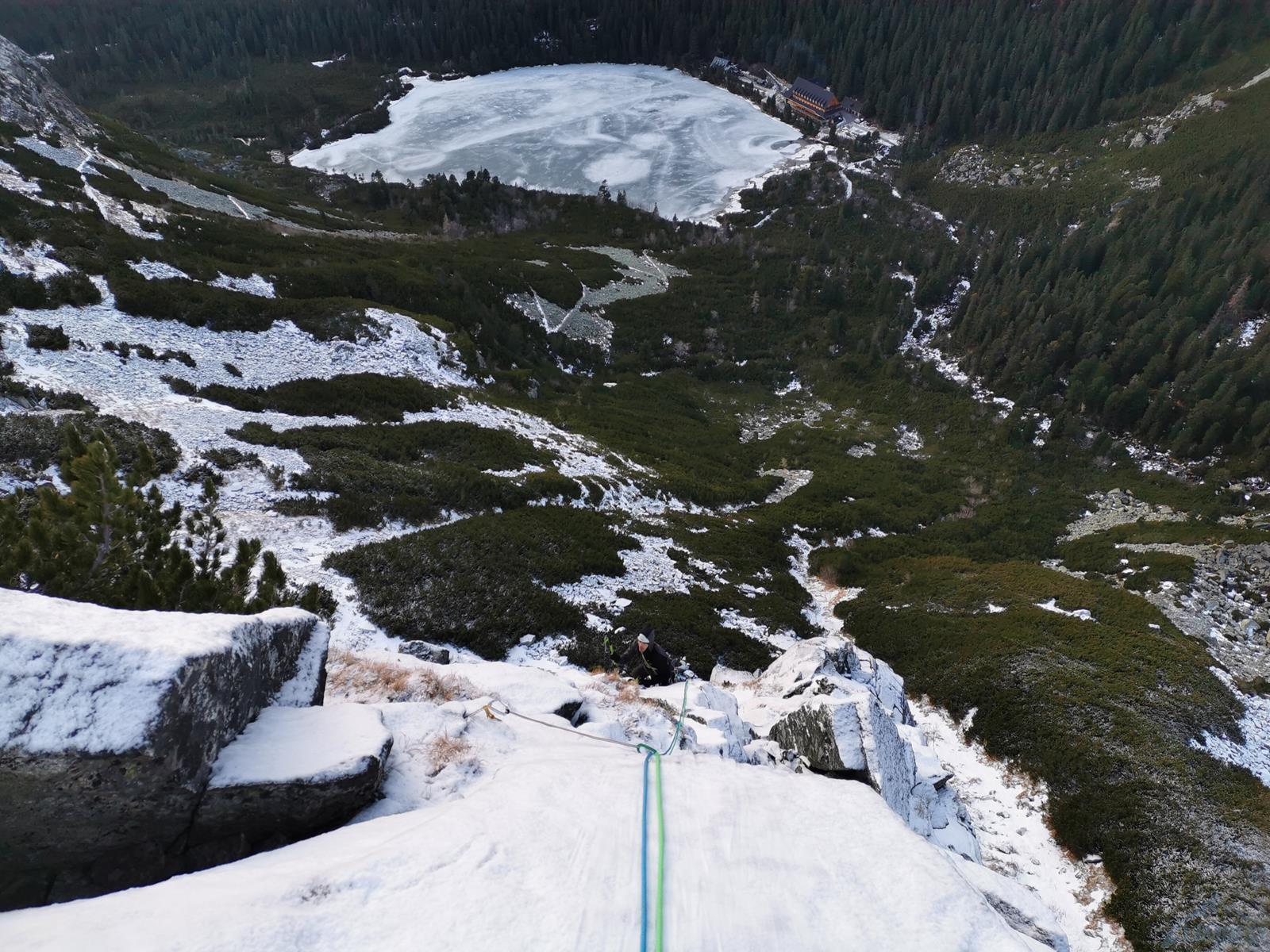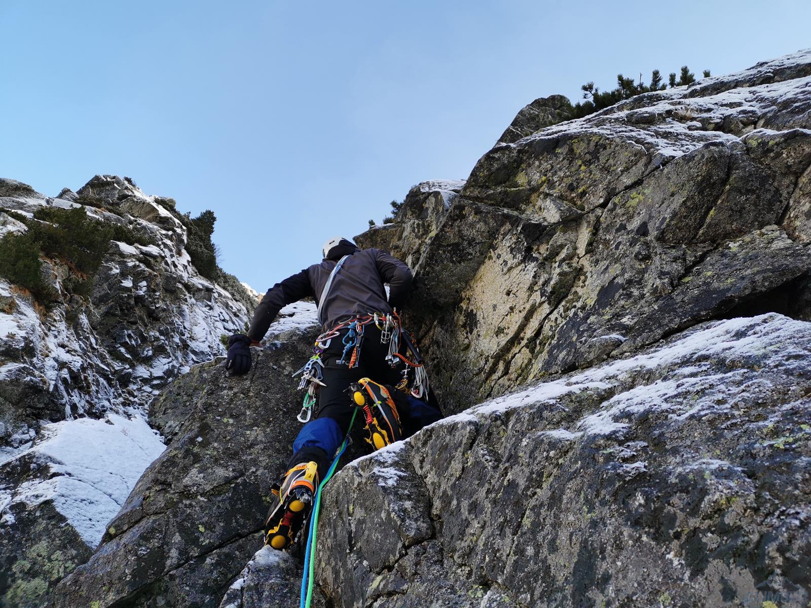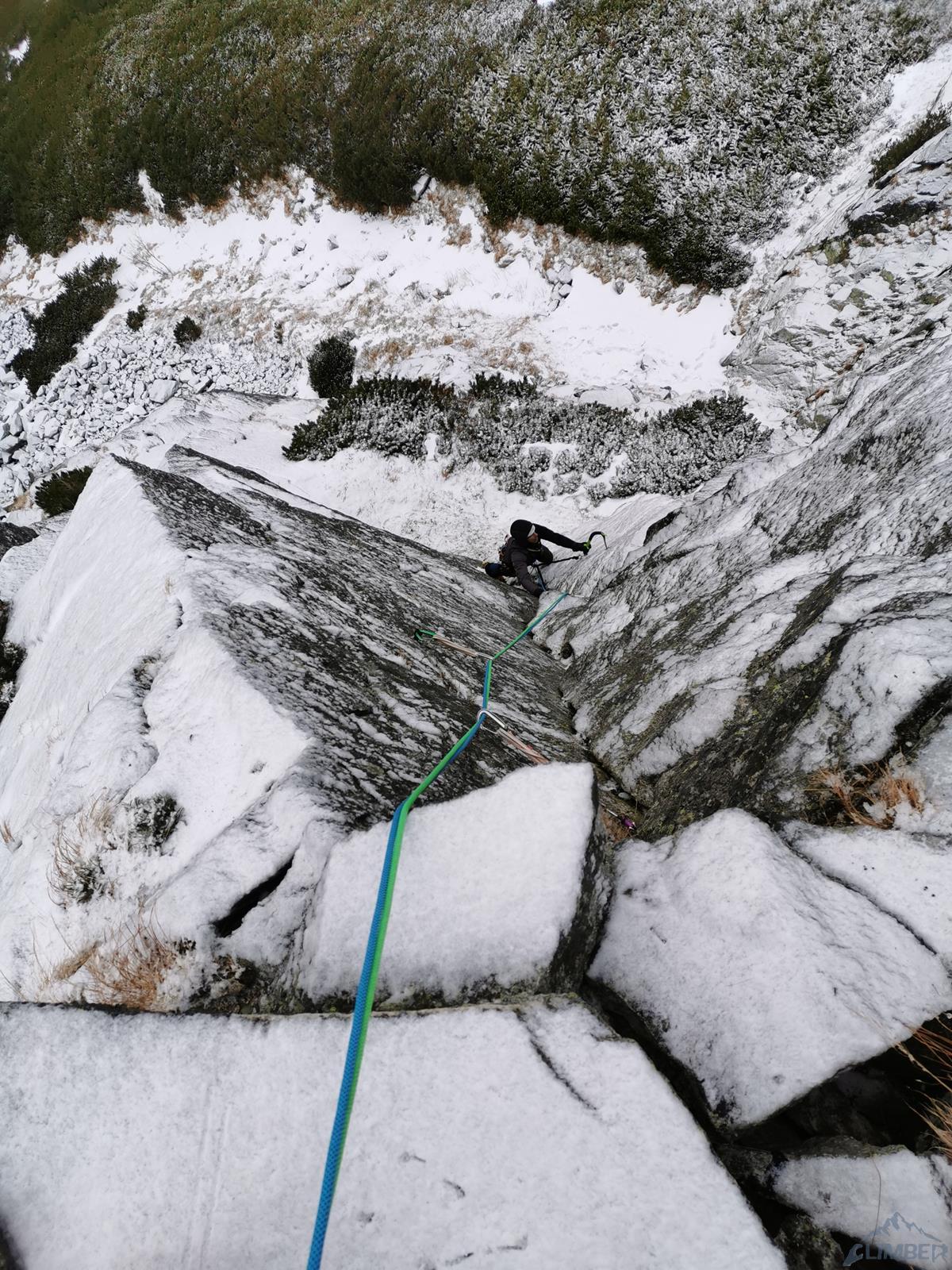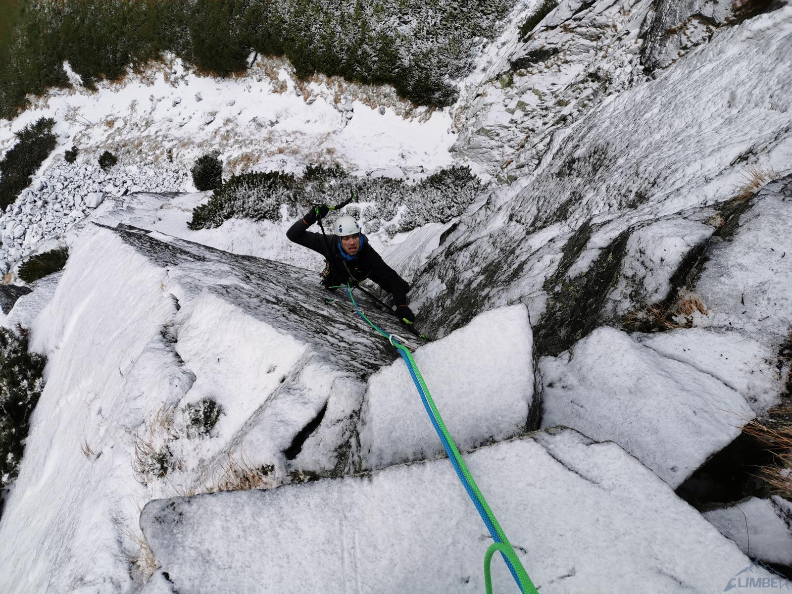 Krótka ale ciekawa propozycja gdy są za słabe warunki na dłuższe drogi lub mamy mało czasu. Tak też było w pierwszy dzień kalendarzowej zimy gdy zjawiliśmy się pod Tępą - po podejściu pod planowaną drogę zdecydowaliśmy, że plany trzeba zweryfikować. Słaby śnieg, miękkie trawy i podmuchy wiatru to jedno, bardziej martwił nas jednak poranny opad, po którym płyty oblepił mokry śnieg i który mocno nas opóźnił. Dlatego też decyzja by przetawersować pod prawą część ściany i zrobić "cokolwiek" - na taką właśnie okoliczność 4-wyciągowy Banan Extra jest idealny.