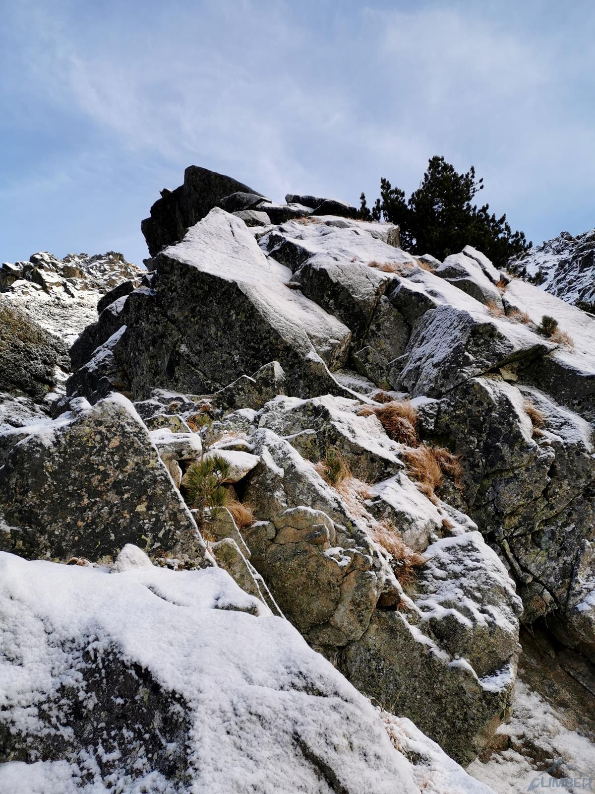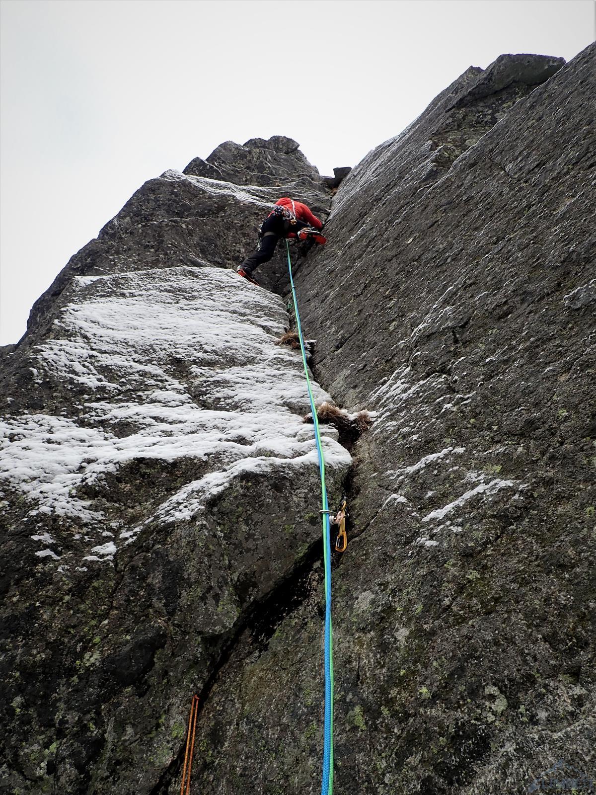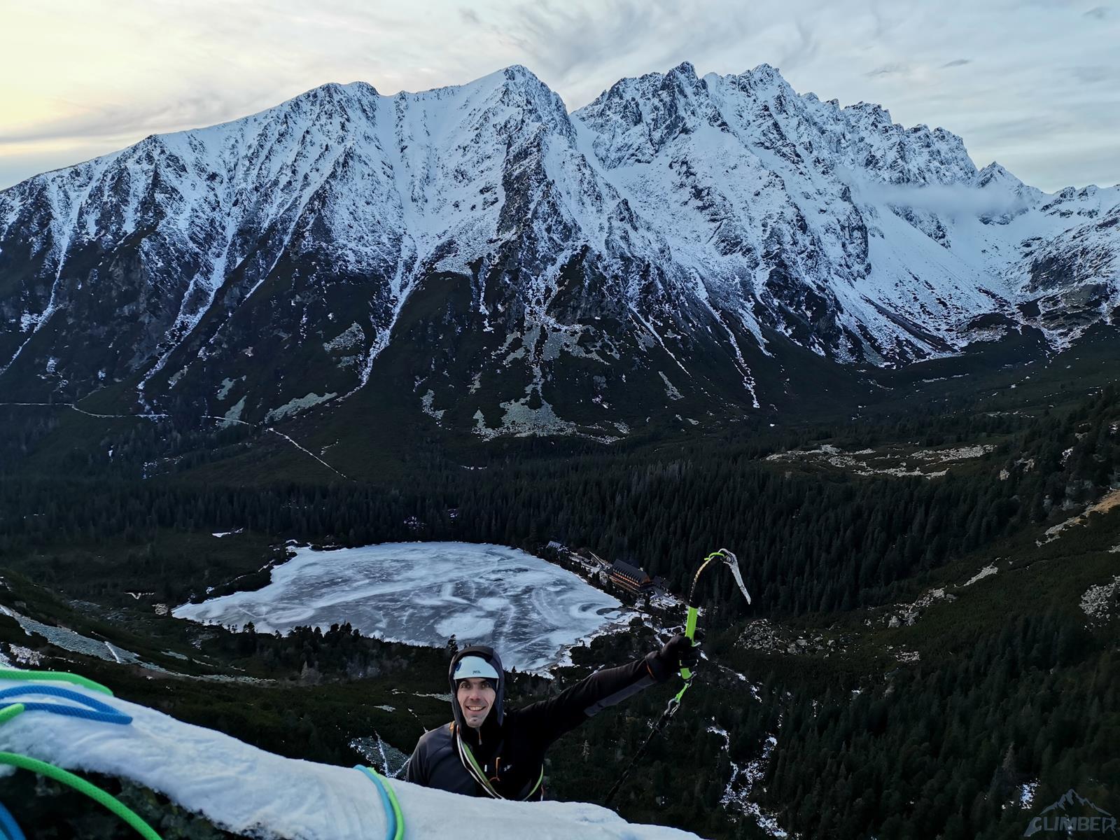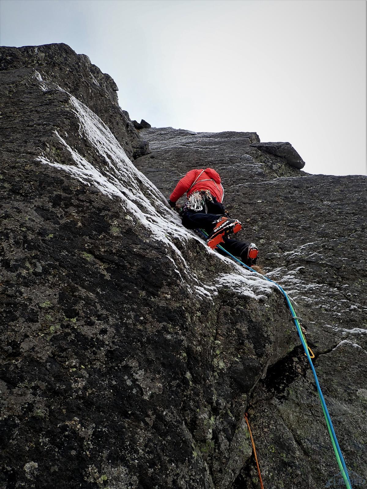 Krótka ale ciekawa propozycja gdy są za słabe warunki na dłuższe drogi lub mamy mało czasu. Tak też było w pierwszy dzień kalendarzowej zimy gdy zjawiliśmy się pod Tępą - po podejściu pod planowaną drogę zdecydowaliśmy, że plany trzeba zweryfikować. Słaby śnieg, miękkie trawy i podmuchy wiatru to jedno, bardziej martwił nas jednak poranny opad, po którym płyty oblepił mokry śnieg i który mocno nas opóźnił. Dlatego też decyzja by przetawersować pod prawą część ściany i zrobić "cokolwiek" - na taką właśnie okoliczność 4-wyciągowy Banan Extra jest idealny.
