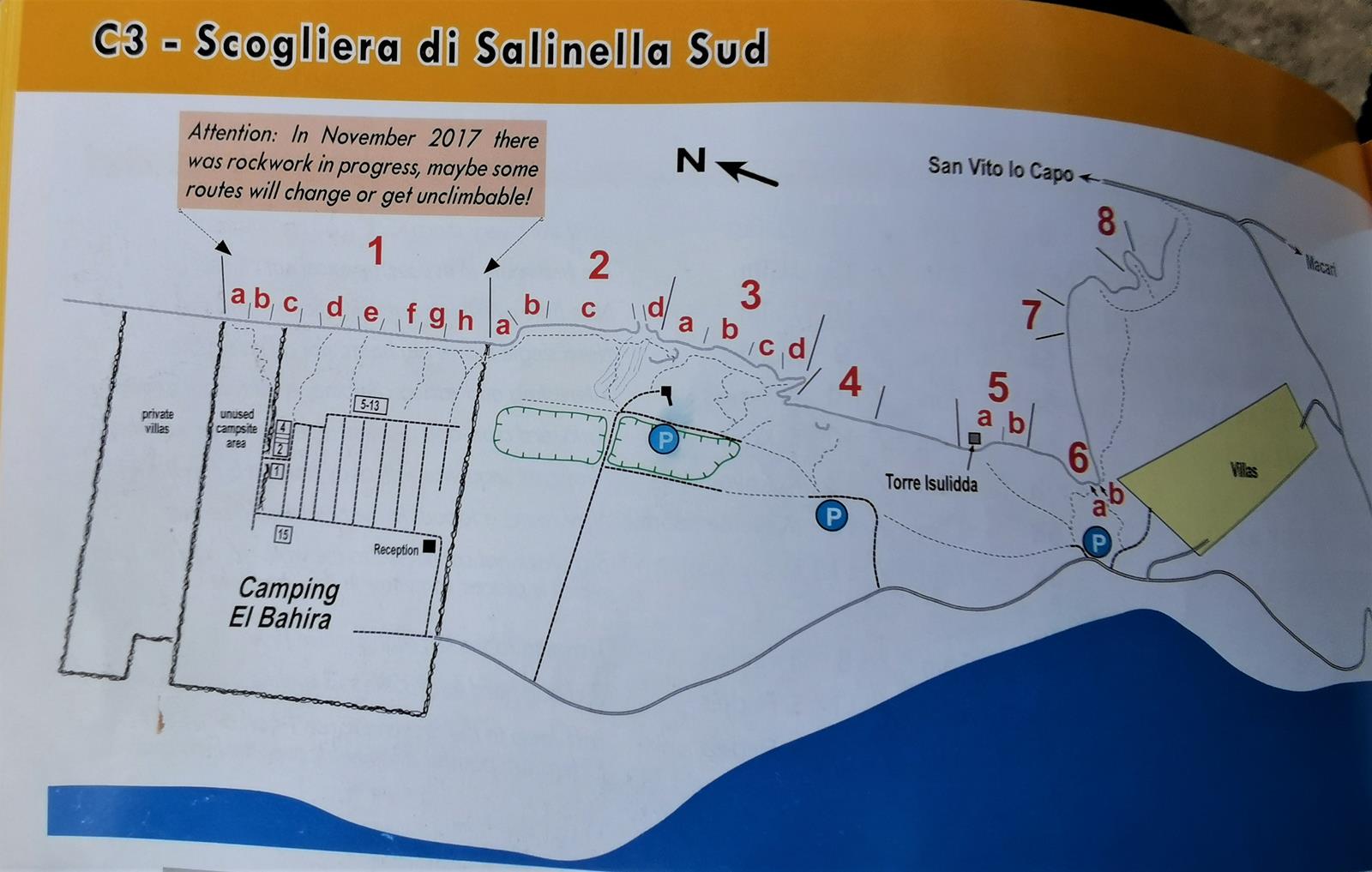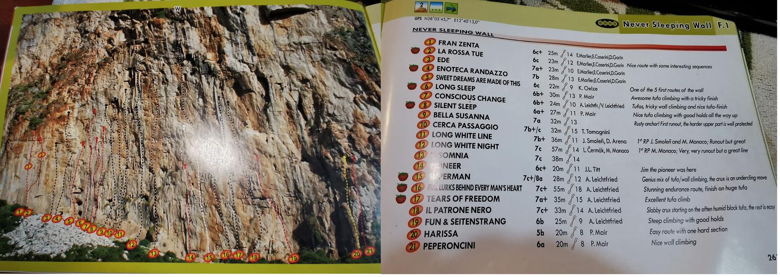 Co do przewodnika wspinaczkowego – najczęściej polecany jest Sicily Rock, w który warto się wcześniej zaopatrzyć, by nie okazało się na miejscu, że nakład na wyspie został wyczerpany 😉 Jeżeli jednak przewodnika nie mamy można skorzystać z niego na recepcji El Bahiry lub w Climbing House w San Vito, gdzie polecają również wykupienie dostępu do aplikacji Climb Advisor, zawierającej ponoć najbardziej aktualne dane na temat dróg wspinaczkowych we Włoszech.
