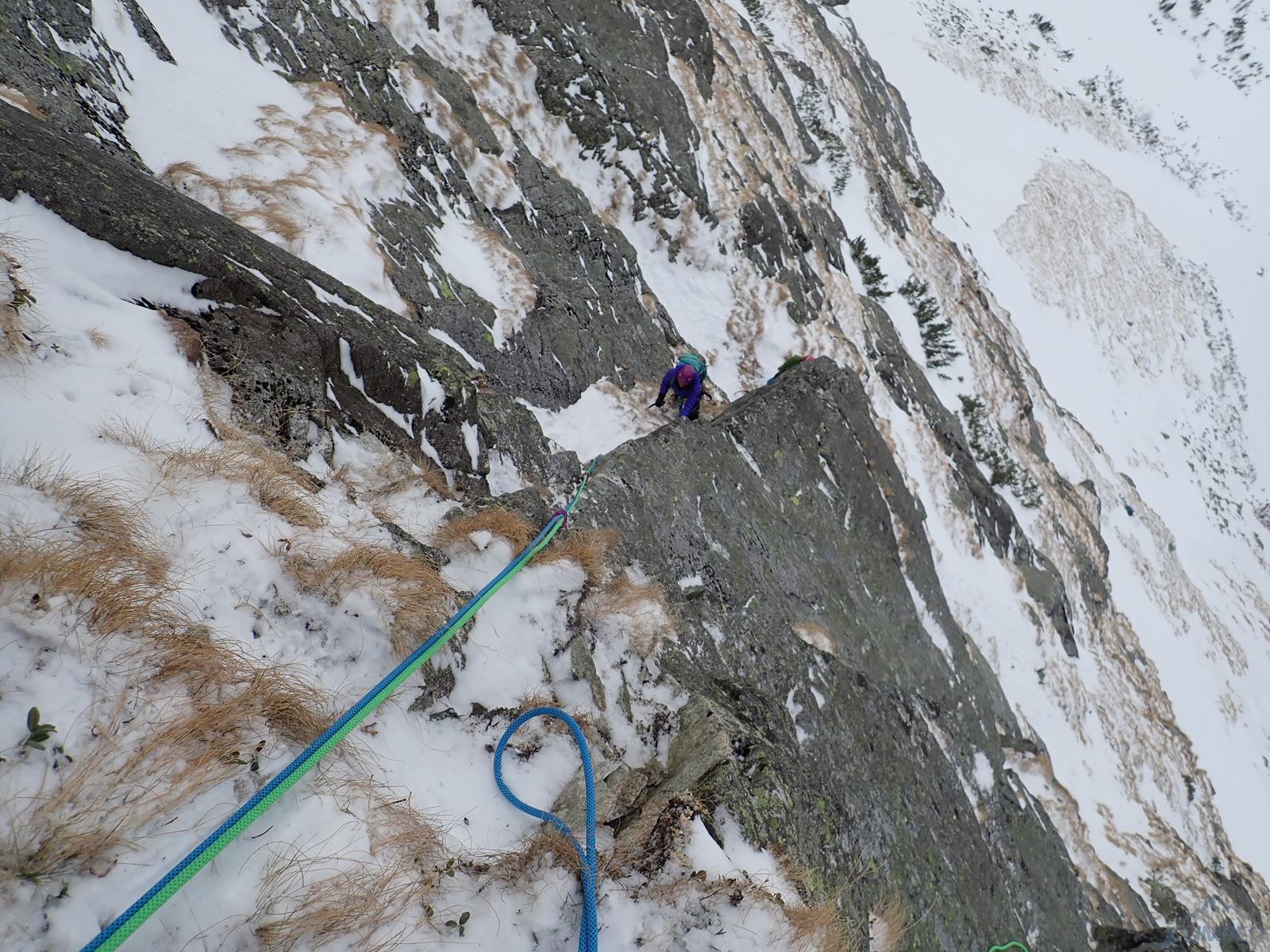 Po tym odcinku przewijamy się do żlebu i łatwym terenem dochodzimy do Niemieckiej Drabiny. By wrócić pod ścianę pozostaje nam minięcie wierzchołka Skrajnego Strażnika i zejście łańcuchami do stromego żlebu, w którym po opadzie i silnym wietrze może być śniegu po pachy – warto w takim przypadku rozważyć zjazdy/asekurację.