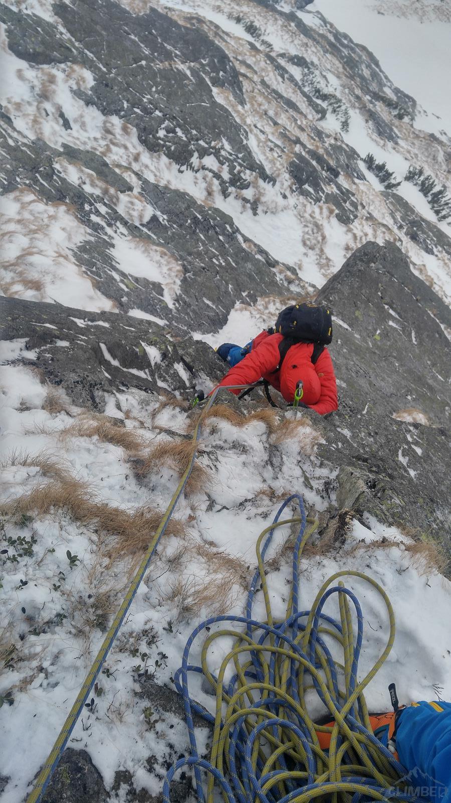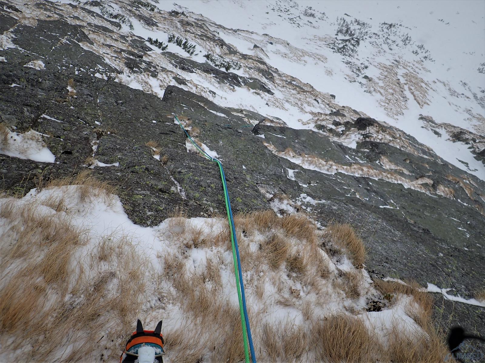 Trzeci wyciąg jest kluczowy (M5) – po przejściu okapiku wspinamy się wzdłuż rysy aż do wejścia w łatwe trawy, nad którymi znajdziemy stanowisko. Kolejny odcinek zaczynamy trawersem po półce w prawo i wg schematu skręcamy do góry w płytkie zacięcie, które doprowadza nas do wyglądającej mało zachęcająco płyty, po przejściu której trawą docieramy do stanowiska na drodze Orłowskiego. My to miejsce pokonaliśmy trochę inaczej - zacząłem zacięciem ale później poszedłem bardziej na prawo jak puszczało. Tutaj droga oficjalnie się kończy, a nam do przejścia pozostaje ciekawy trawers po płytce na Orłowskim, który robiłem już dwa lata wcześniej przy okazji przejścia Psotki-Vargi (LINK).