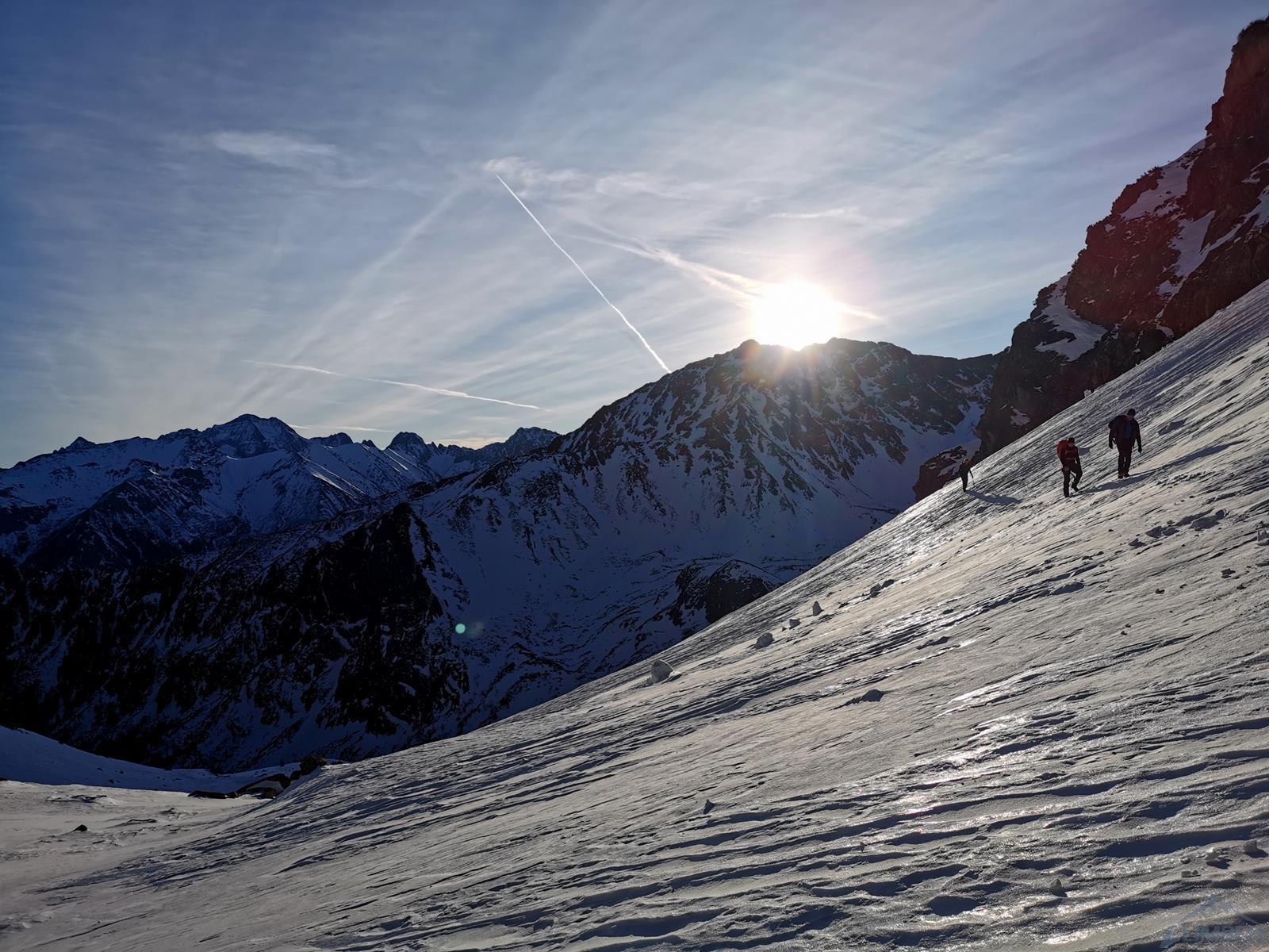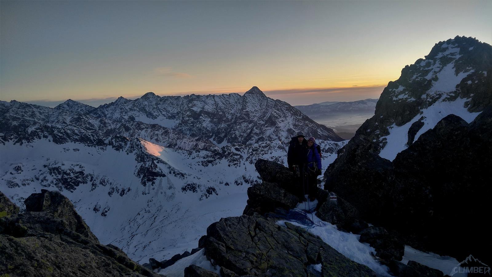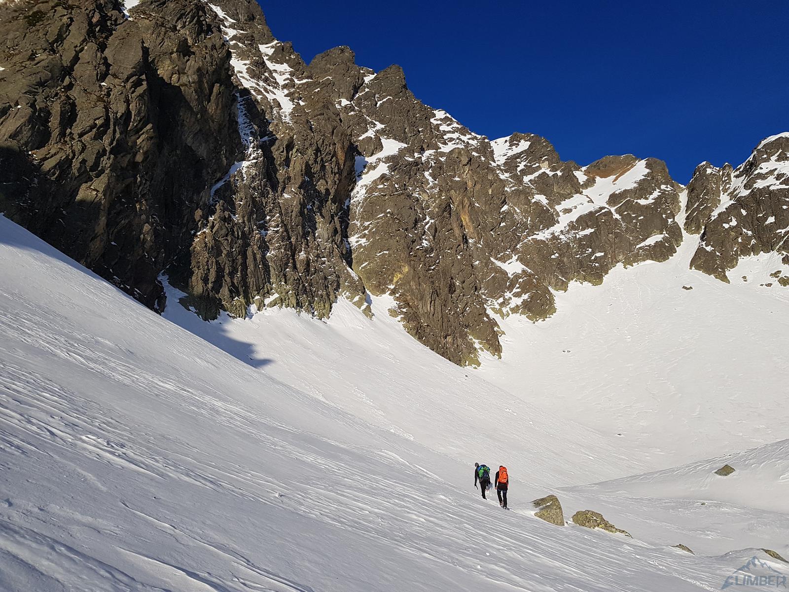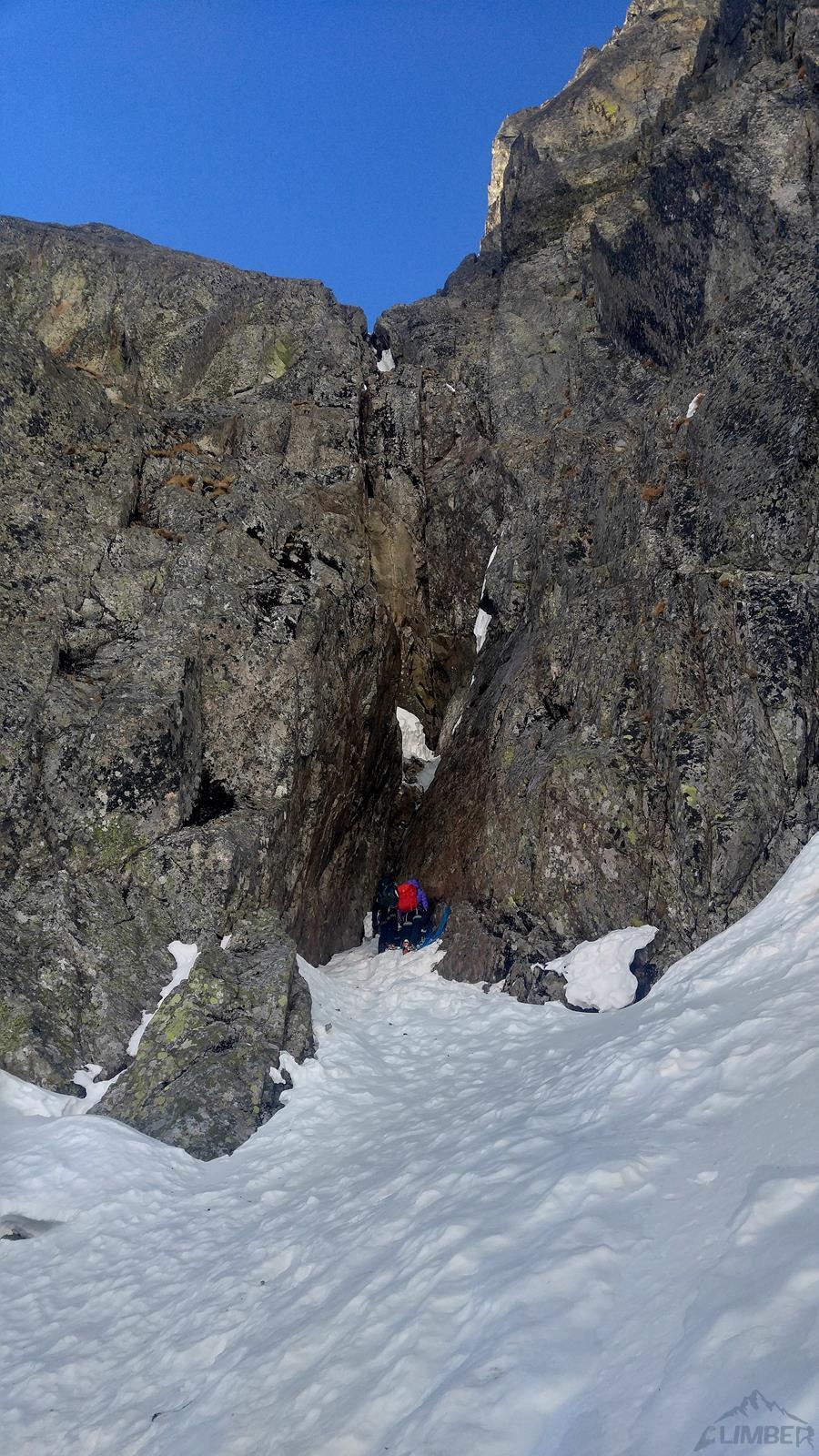 Dalsza część drogi to teoretycznie chodzenie po śniegu – jeżeli pójdziemy jednym z dwóch wariantów odbijających w prawo do WHP207 wyprowadzającej na przełęcz. Jeżeli chcemy się jeszcze trochę powspinać można odbić do góry (zaraz przy bloku lub wyżej – patrz foto-topo), gdy żleb się skończy będziemy mieć do pokonania ok. 40-metrowy odcinek z trudnościami 3-4. Ktoś na pewno już dawno tamtędy się wspinał bo trafiliśmy na starego heksa, zresztą wariant logicznie się narzuca. Zaczynamy stromymi trawkami, po czym pokonujemy fajne zacięcie i trawersem wychodzimy w łatwy teren, doprowadzający nas do Rampy jakieś 50 metrów pod przełęczą. W międzyczasie gdy my poszliśmy tym wariantem, koledzy poszli normalnie i spotkaliśmy się na ostatnim odcinku drogi. Jak się jednak okazało, w górnej części ściany warunki śniegowe wcale nie były tak dobre jakich się spodziewaliśmy i na kopaniu się w „cukrowym” śniegu zeszło nam sporo czasu. Współczuliśmy klubowym kolegom idącym Rampą od samego dołu, których mieliśmy na koniec w zasięgu wzroku. Na Przełączce nad Dolinką Buczynową stajemy więc później niż się spodziewaliśmy bo po 6 godzinach od wejścia w ścianę – jednak jak na 4 osobowy team dzielący się stanowiskami oraz mały zapych, dodatkowy wariant i słaby śnieg w żlebie, nie narzekamy jakoś z tego powodu. U góry dość mocno wieje, podchodzimy więc szybko na szczyt i zaczynamy zejście – początkowo szlakiem, później trawersując śnieżne zbocza masywu Koziego Wierchu, aż do osiągnięcia dogodnego żlebu prowadzącego w dół do Pięciu Stawów.