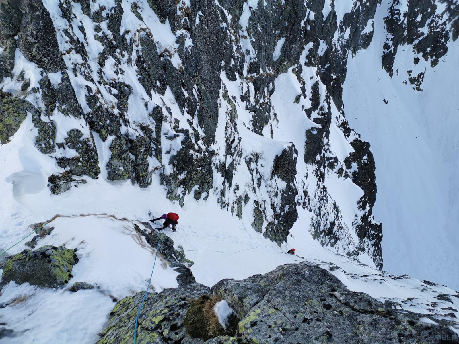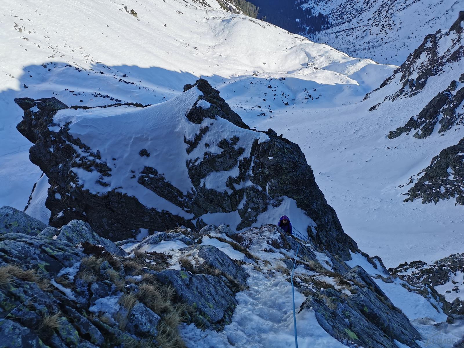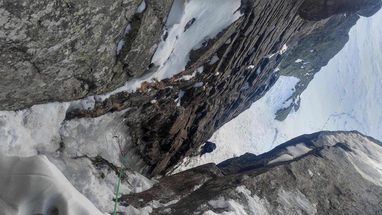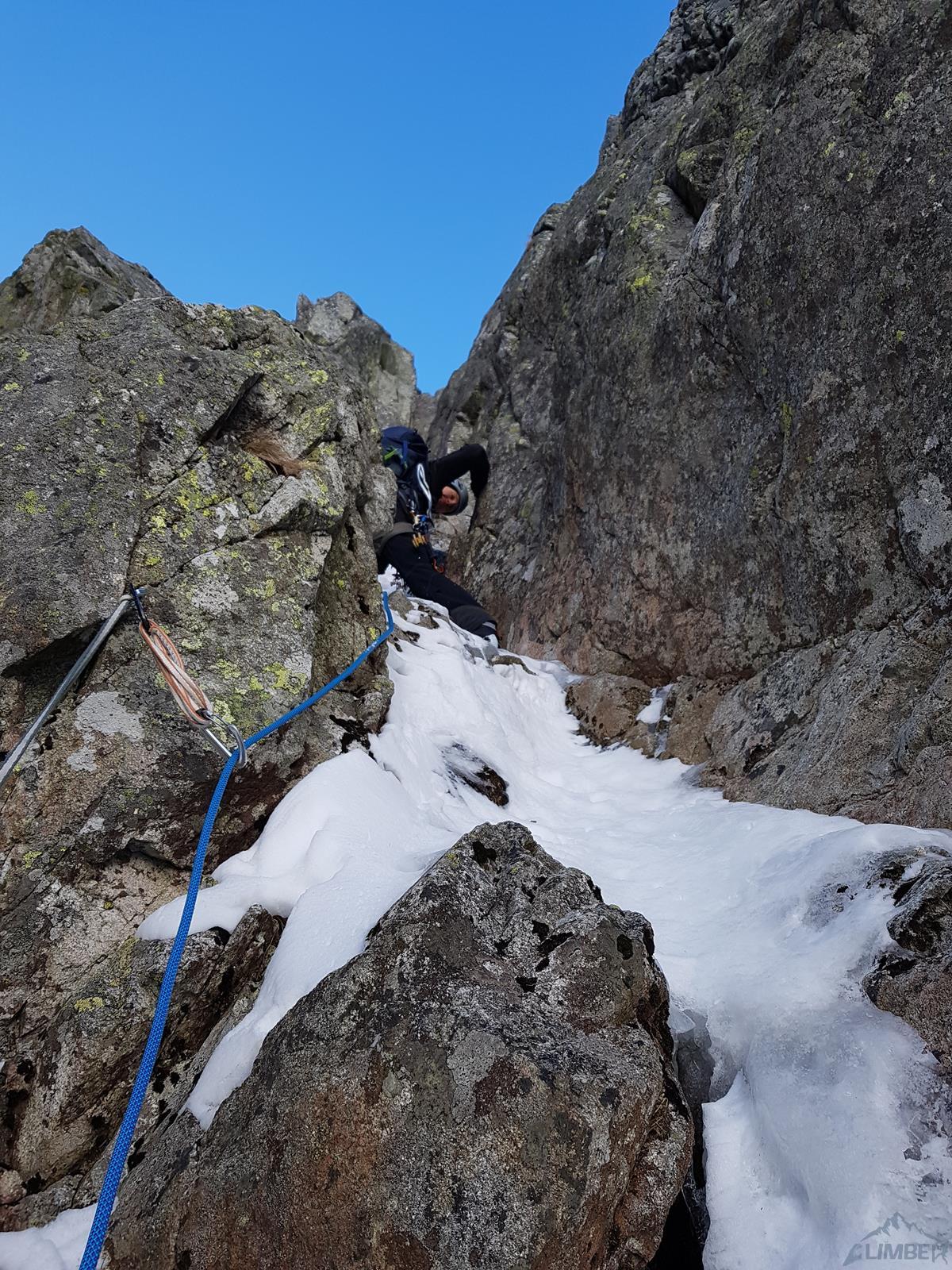 Nasz drugi (wg schematu trzeci) wyciąg ma mocno letni charakter – na początek trawers (IV) po spękanej płycie, po czym pionowo do góry (V/V+) po obłych chwytach – wspinanie głównie na rękach, dziabki przydają się najbardziej na wyjściu. W kociołku robię stan (dokładam swój hak do zastanego, jak się później okazuje należał do zespołu, który robił drogę kilka tygodni wcześniej) i ściągam do siebie partnerkę. Kolejny odcinek rozpoczyna się wznoszącym trawersem w lewo – na początku mamy lód, później już czystą skałę. Kilka czujnych ruchów (V+) i jesteśmy na przewinięciu – stąd idziemy jeszcze kawałek w lewo do trawiastego pęknięcia (IV), nim kilka metrów do góry i poziomo w prawo do żlebu (V) – uwaga, jeżeli pójdziemy dalej do góry, nie będzie się dało do niego zejść (przerabiałem to i musiałem się wspinać w dół). Trudności na tym wyciągu można też sobie skrócić wspinając się do żlebu rysą od razu po przewinięciu (bez trawersu w lewo do trawiastego pęknięcia). Stanowisko zakładamy w kociołku pod kominkiem, jest jeden stary hak. Ostatni wspinaczkowy wyciąg jest bardzo przyjemny – zaczynamy lodowym kominkiem i w lewo po dobrych chwytach (IV+) przewijamy się do żlebu, którym już bez trudności idziemy aż na przełączkę. Stąd do pokonania mamy kilka metrów dwójkowego terenu, po czym robi się łatwo, można przejść na lotną asekurację, lub zgodnie z topo dochodzimy do wystającego bloku skalnego.