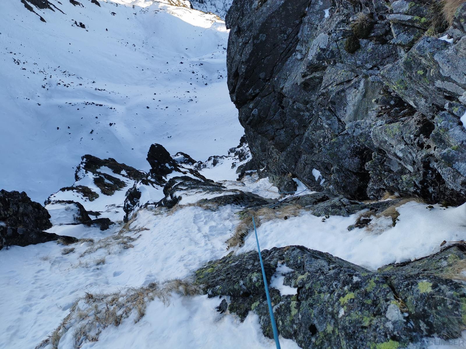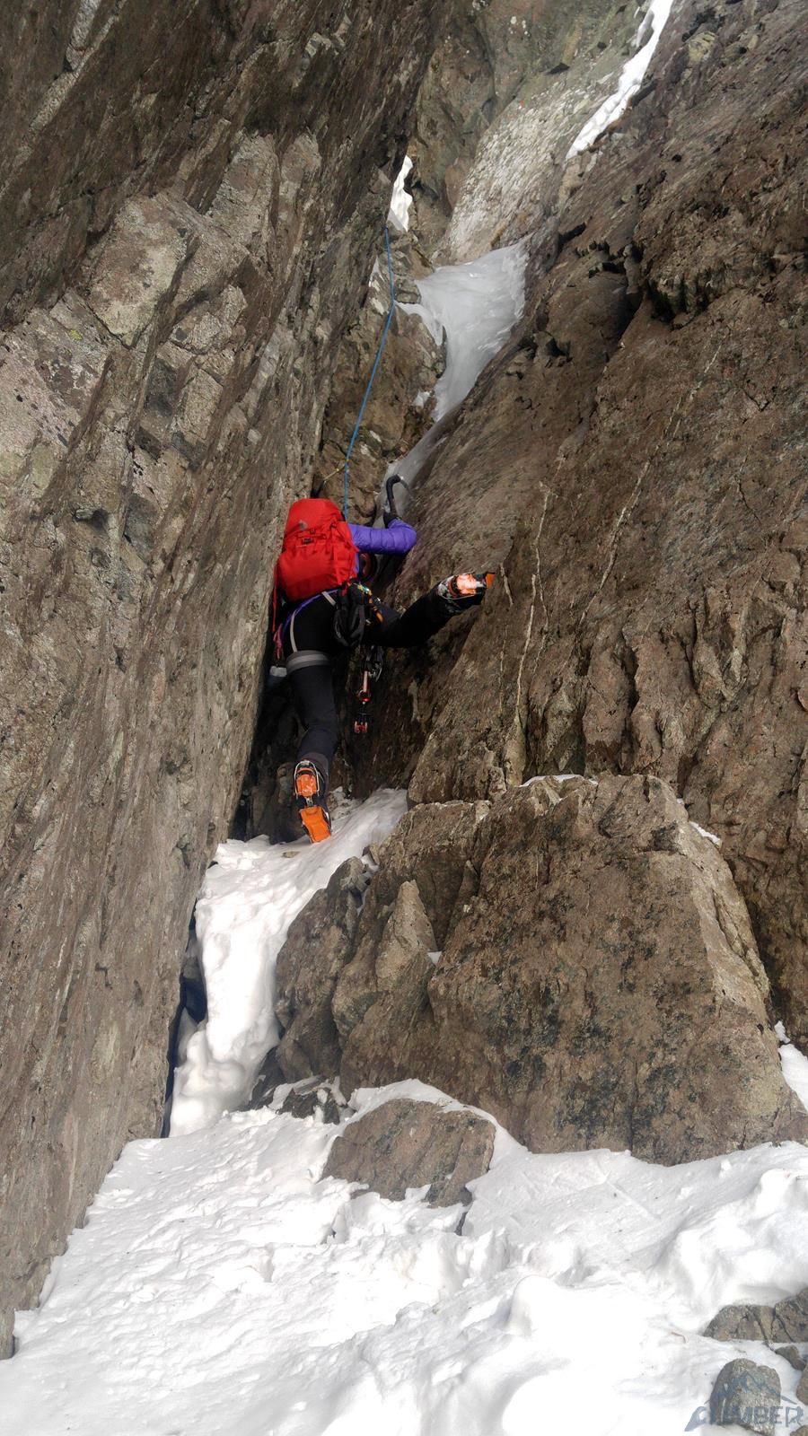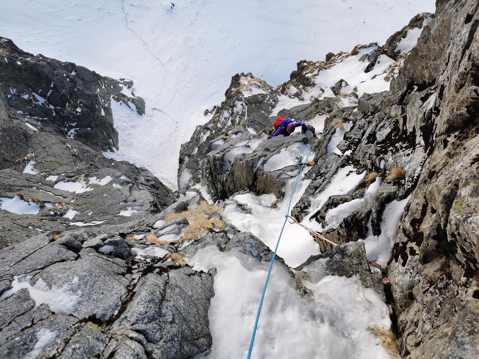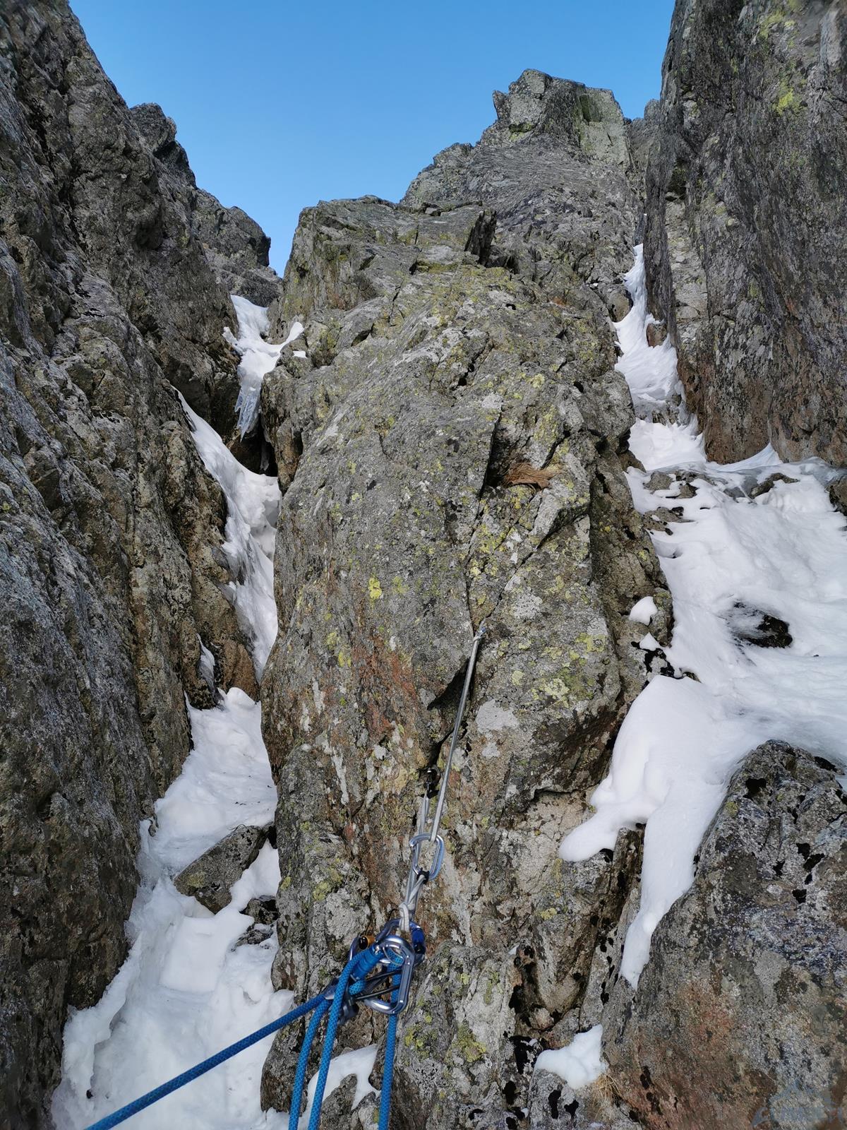 Nasz drugi (wg schematu trzeci) wyciąg ma mocno letni charakter – na początek trawers (IV) po spękanej płycie, po czym pionowo do góry (V/V+) po obłych chwytach – wspinanie głównie na rękach, dziabki przydają się najbardziej na wyjściu. W kociołku robię stan (dokładam swój hak do zastanego, jak się później okazuje należał do zespołu, który robił drogę kilka tygodni wcześniej) i ściągam do siebie partnerkę. Kolejny odcinek rozpoczyna się wznoszącym trawersem w lewo – na początku mamy lód, później już czystą skałę. Kilka czujnych ruchów (V+) i jesteśmy na przewinięciu – stąd idziemy jeszcze kawałek w lewo do trawiastego pęknięcia (IV), nim kilka metrów do góry i poziomo w prawo do żlebu (V) – uwaga, jeżeli pójdziemy dalej do góry, nie będzie się dało do niego zejść (przerabiałem to i musiałem się wspinać w dół). Trudności na tym wyciągu można też sobie skrócić wspinając się do żlebu rysą od razu po przewinięciu (bez trawersu w lewo do trawiastego pęknięcia). Stanowisko zakładamy w kociołku pod kominkiem, jest jeden stary hak. Ostatni wspinaczkowy wyciąg jest bardzo przyjemny – zaczynamy lodowym kominkiem i w lewo po dobrych chwytach (IV+) przewijamy się do żlebu, którym już bez trudności idziemy aż na przełączkę. Stąd do pokonania mamy kilka metrów dwójkowego terenu, po czym robi się łatwo, można przejść na lotną asekurację, lub zgodnie z topo dochodzimy do wystającego bloku skalnego.