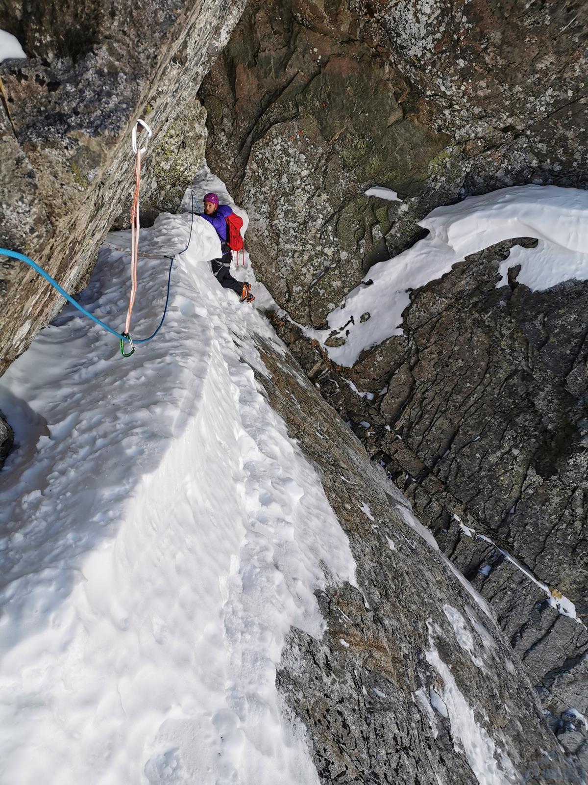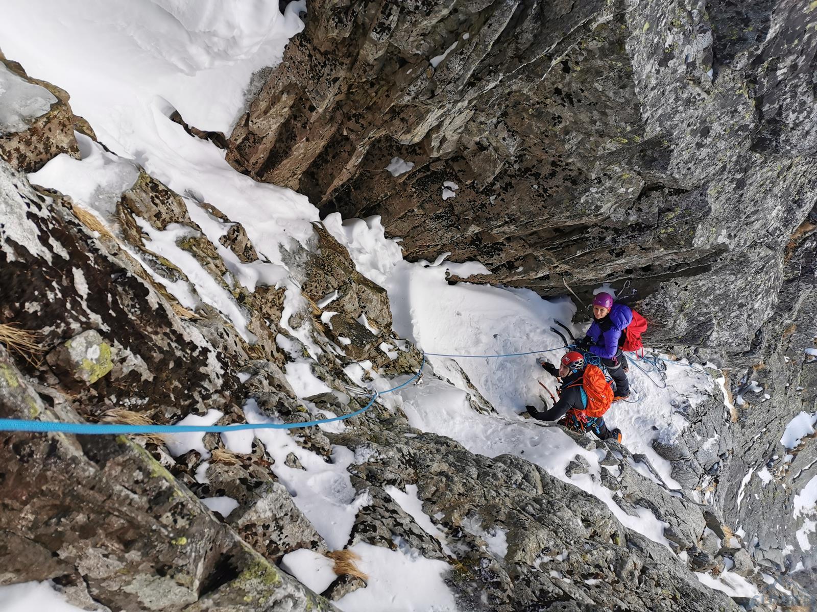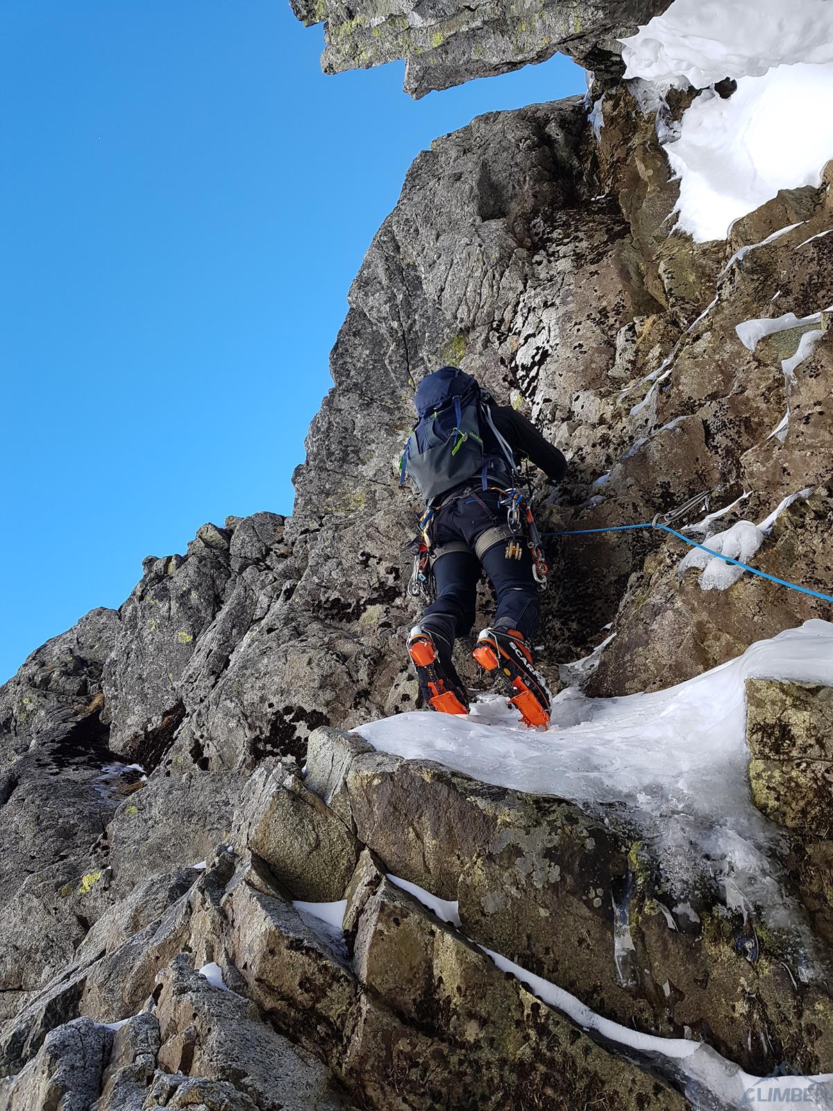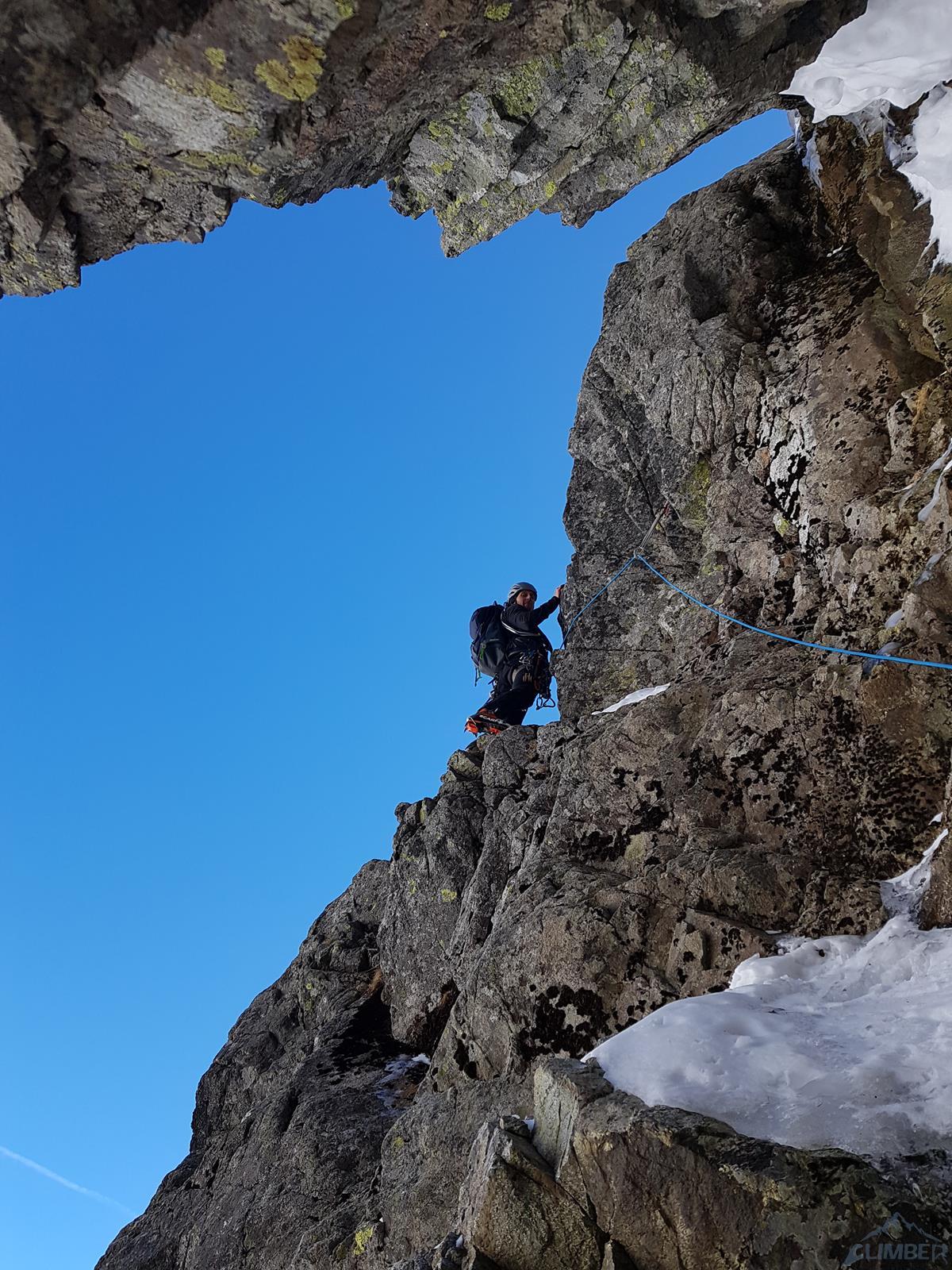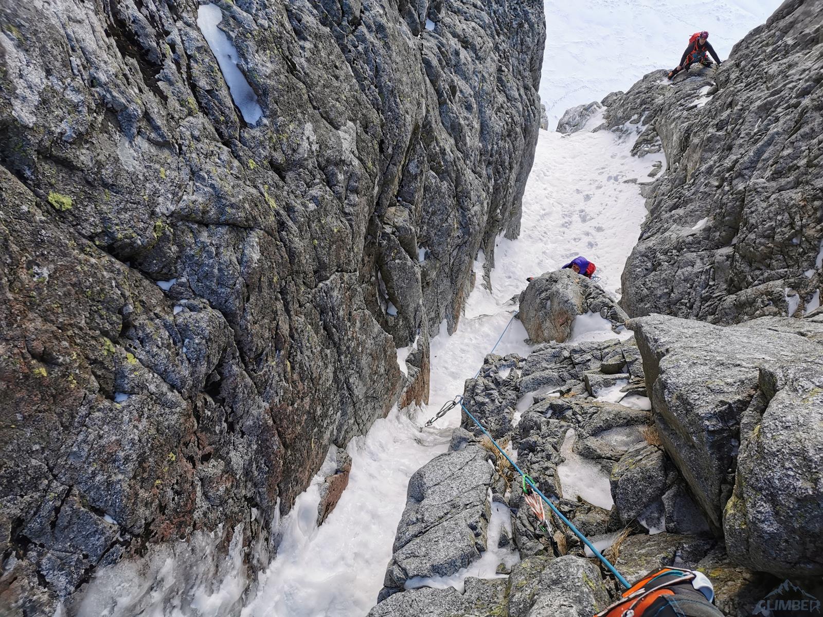 Nasz drugi (wg schematu trzeci) wyciąg ma mocno letni charakter – na początek trawers (IV) po spękanej płycie, po czym pionowo do góry (V/V+) po obłych chwytach – wspinanie głównie na rękach, dziabki przydają się najbardziej na wyjściu. W kociołku robię stan (dokładam swój hak do zastanego, jak się później okazuje należał do zespołu, który robił drogę kilka tygodni wcześniej) i ściągam do siebie partnerkę. Kolejny odcinek rozpoczyna się wznoszącym trawersem w lewo – na początku mamy lód, później już czystą skałę. Kilka czujnych ruchów (V+) i jesteśmy na przewinięciu – stąd idziemy jeszcze kawałek w lewo do trawiastego pęknięcia (IV), nim kilka metrów do góry i poziomo w prawo do żlebu (V) – uwaga, jeżeli pójdziemy dalej do góry, nie będzie się dało do niego zejść (przerabiałem to i musiałem się wspinać w dół). Trudności na tym wyciągu można też sobie skrócić wspinając się do żlebu rysą od razu po przewinięciu (bez trawersu w lewo do trawiastego pęknięcia). Stanowisko zakładamy w kociołku pod kominkiem, jest jeden stary hak. Ostatni wspinaczkowy wyciąg jest bardzo przyjemny – zaczynamy lodowym kominkiem i w lewo po dobrych chwytach (IV+) przewijamy się do żlebu, którym już bez trudności idziemy aż na przełączkę. Stąd do pokonania mamy kilka metrów dwójkowego terenu, po czym robi się łatwo, można przejść na lotną asekurację, lub zgodnie z topo dochodzimy do wystającego bloku skalnego.