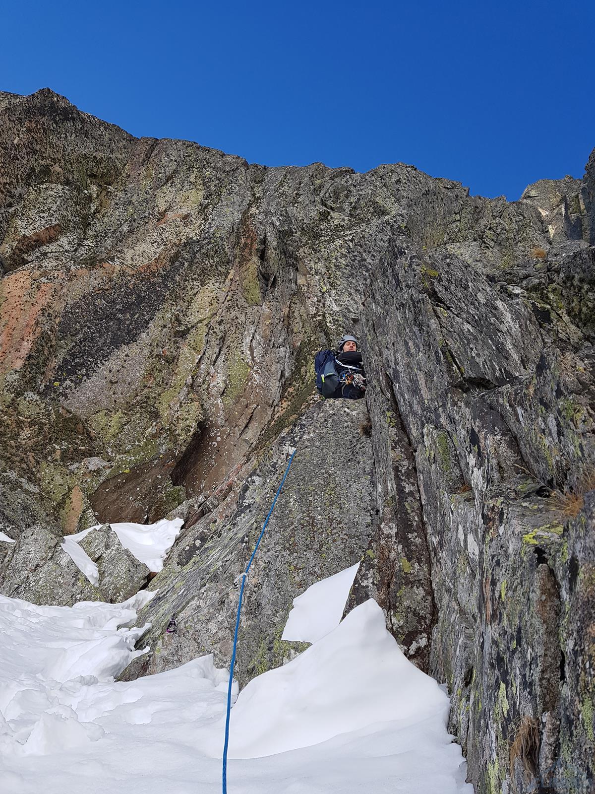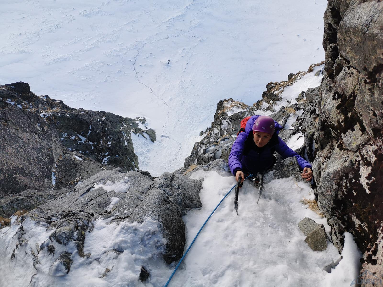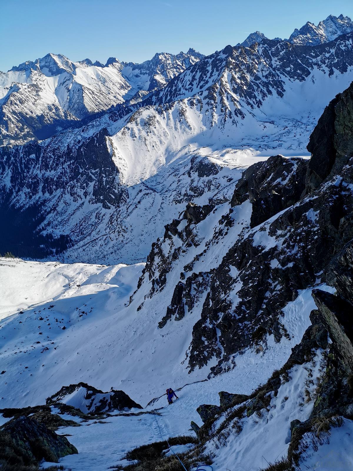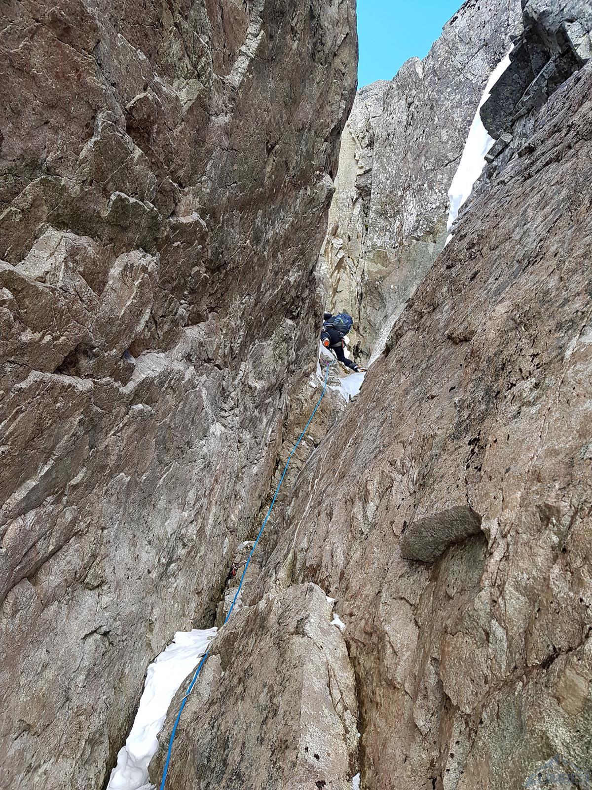 Nasz drugi (wg schematu trzeci) wyciąg ma mocno letni charakter – na początek trawers (IV) po spękanej płycie, po czym pionowo do góry (V/V+) po obłych chwytach – wspinanie głównie na rękach, dziabki przydają się najbardziej na wyjściu. W kociołku robię stan (dokładam swój hak do zastanego, jak się później okazuje należał do zespołu, który robił drogę kilka tygodni wcześniej) i ściągam do siebie partnerkę. Kolejny odcinek rozpoczyna się wznoszącym trawersem w lewo – na początku mamy lód, później już czystą skałę. Kilka czujnych ruchów (V+) i jesteśmy na przewinięciu – stąd idziemy jeszcze kawałek w lewo do trawiastego pęknięcia (IV), nim kilka metrów do góry i poziomo w prawo do żlebu (V) – uwaga, jeżeli pójdziemy dalej do góry, nie będzie się dało do niego zejść (przerabiałem to i musiałem się wspinać w dół). Trudności na tym wyciągu można też sobie skrócić wspinając się do żlebu rysą od razu po przewinięciu (bez trawersu w lewo do trawiastego pęknięcia). Stanowisko zakładamy w kociołku pod kominkiem, jest jeden stary hak. Ostatni wspinaczkowy wyciąg jest bardzo przyjemny – zaczynamy lodowym kominkiem i w lewo po dobrych chwytach (IV+) przewijamy się do żlebu, którym już bez trudności idziemy aż na przełączkę. Stąd do pokonania mamy kilka metrów dwójkowego terenu, po czym robi się łatwo, można przejść na lotną asekurację, lub zgodnie z topo dochodzimy do wystającego bloku skalnego.
