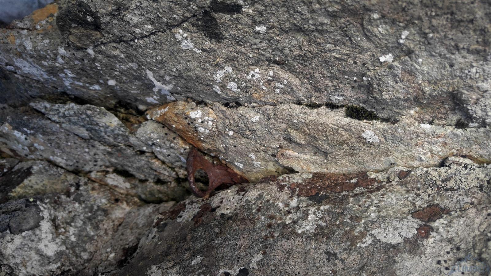 W Dolince Buczynowej, ku naszemu zaskoczeniu, zjawiają się również nasi dwaj klubowi koledzy, zmierzający na drogę Rampą – tyle osób na raz w tak mało popularnym rejonie to rzadkość, a już z jednego klubu to w ogóle 😊. Ruszam (w zespole z Anią) jako pierwszy – na początek (wg schematu V+) ciasny kominek i przejście z płyty na lód, bardzo fajne i różnorodne wspinanie. Nie zatrzymuję się i po wkręceniu krótkiej śruby od razu wchodzę w trawers na (teoretycznie) drugim wyciągu – płyta pokryta jest słabo trzymającym śniegiem, wystarcza to jednak to łatwego jej pokonania, na pewno trudniej będzie gdy śniegu nie ma wcale. Po drodze znajduje się kilka starych haków nie budzących zbytniego zaufania (patrz foto). Po przewinięciu trafiam na dobry egzemplarz, korzystam więc z niego by zbudować stanowisko – nie ma sensu iść za wysoko bo konieczne byłoby zejście by rozpocząć kolejny wyciąg, poza tym mamy dobry widok na drugiego. Po krótkim ale intensywnym zmaganiom z kominem dociera do mnie Ania i możemy ruszać dalej. W międzyczasie swoje wspinanie na dole rozpoczynają idący naszymi śladami Michał i Szymon.