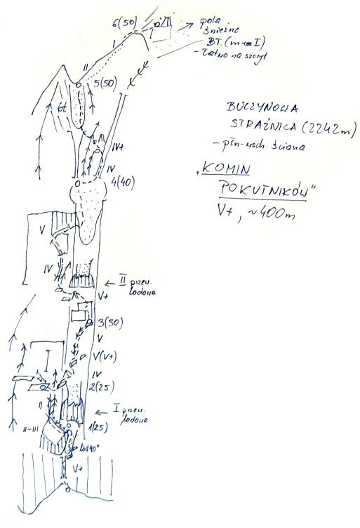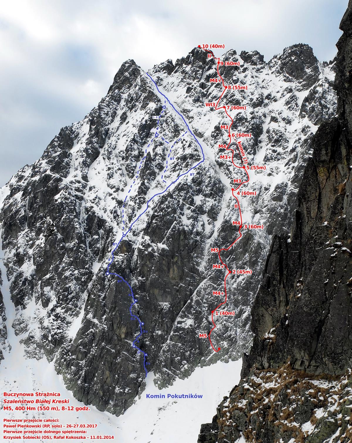 Droga, której nazwa kojarzona jest najczęściej z opowiadaniem Jana Długosza pod tym samym tytułem, zlokalizowana jest na północno-wschodniej ścianie Buczynowej Strażnicy. Oferuje 5 wyciągów zróżnicowanego wspinania, po których czeka nas jeszcze przejście ok. 300 metrów łatwego terenu do Przełączki nad Dolinką Buczynową. Komin "odkurzył" początkiem sezonu Kuba Radziejowski, po którego przejściu droga trafiła na listę moich najbliższych zimowych celów. Pod koniec stycznia, korzystając z wyjątkowo korzystnych warunków śniegowych, postanawiamy w 4-osobowym składzie dołączyć do „Klubu Pokutników”.