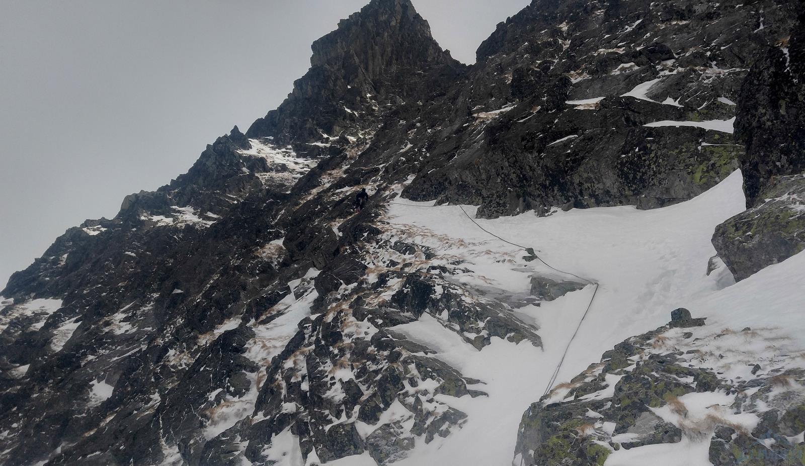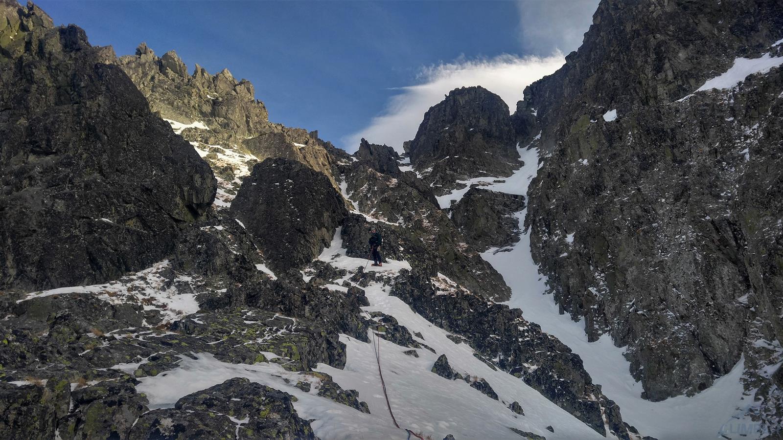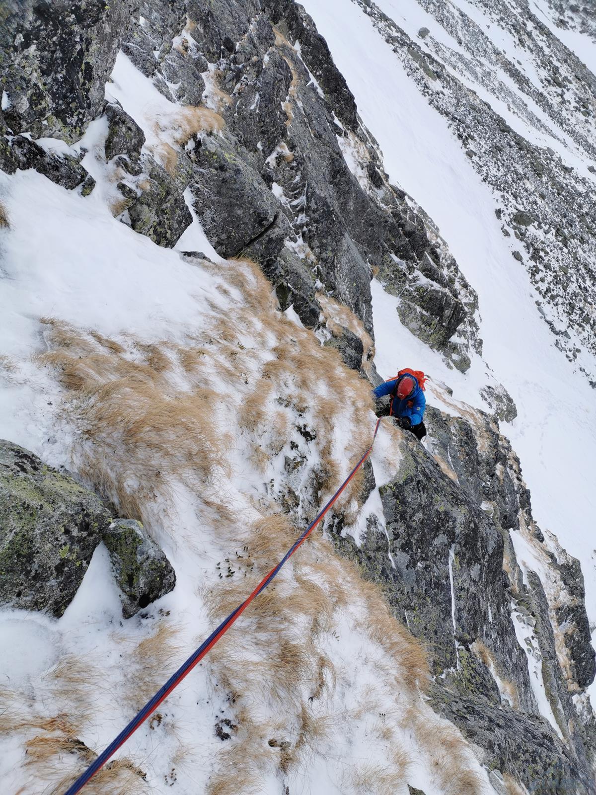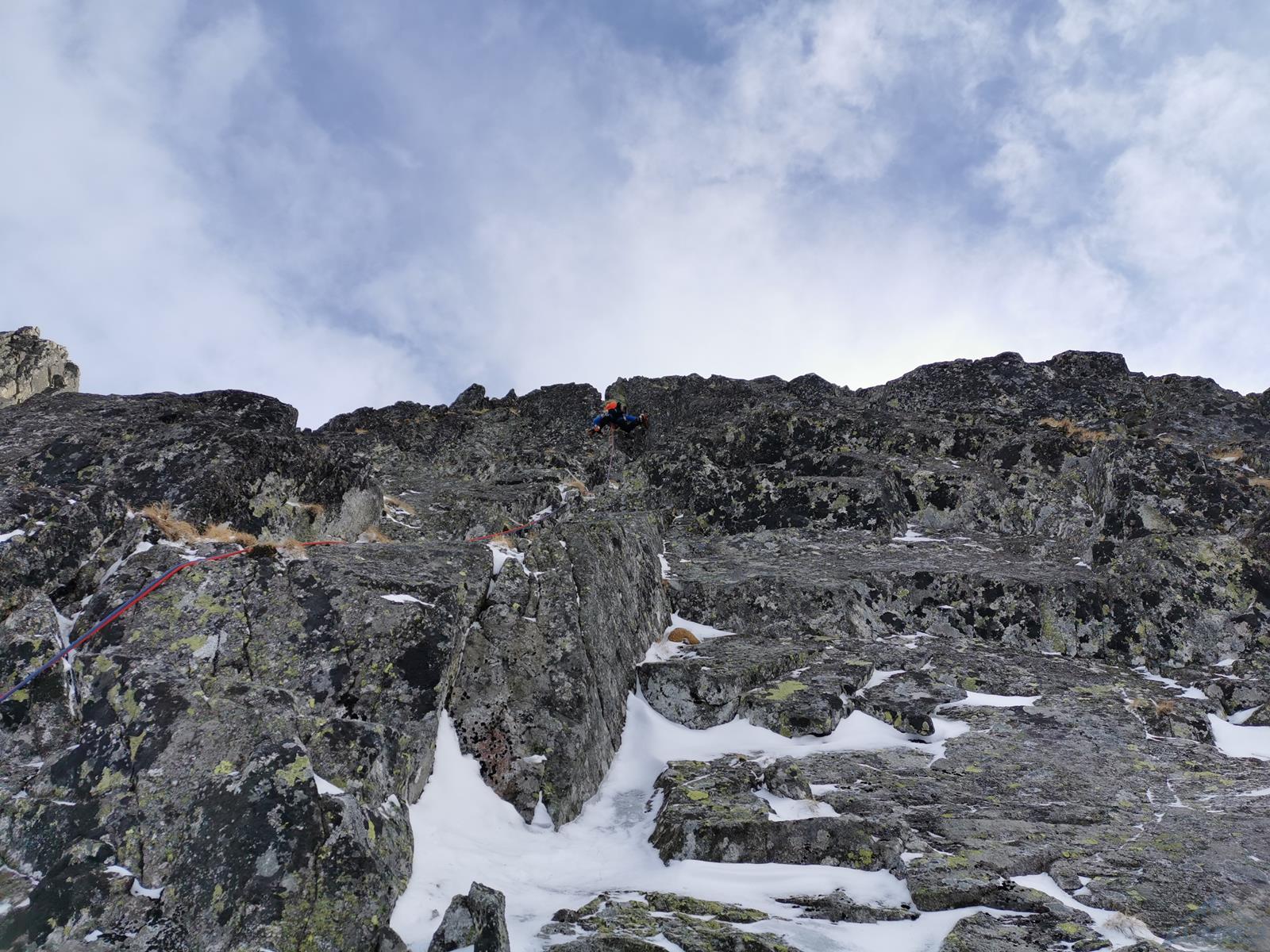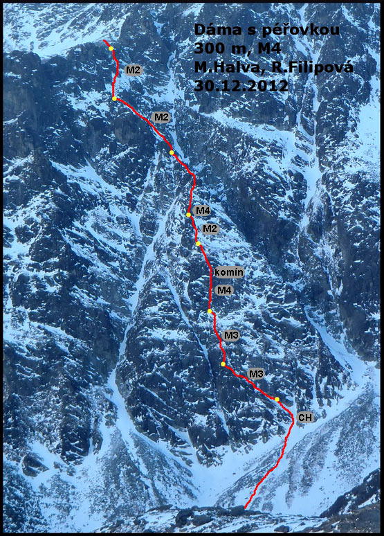 Droga zrobiona podczas obozu zimowego KW Bielsko-Biała w Dolinie Staroleśnej. Po dotarciu do Zbójnickiej Chaty i zrzuceniu z siebie ciężkich plecaków w czwórkę ruszamy w kierunku Baniastej Turni, spod której jednak zaliczamy odwrót – trzeba torować po mocnym opadzie, wieje silny wiatr, jest też późno. Pozostaje opcja rezerwowa, czyli mocno przewiana Sławkowska Kopa i droga, którą można szybko zrobić przed zmrokiem – na taką okoliczność Dáma s péřovkou jest idealna. Ania i Szymon wracają do schroniska, wiążę się z Michałem i zaczynamy wspinanie. Droga wiedzie środkiem trójkątnej ściany (trujholnika) opadającej spod Warzęchowego Przechodu (Slavkovská Priehyba), pomiędzy Warzęchowymi Strażnicami i Sławkowską Kopą.