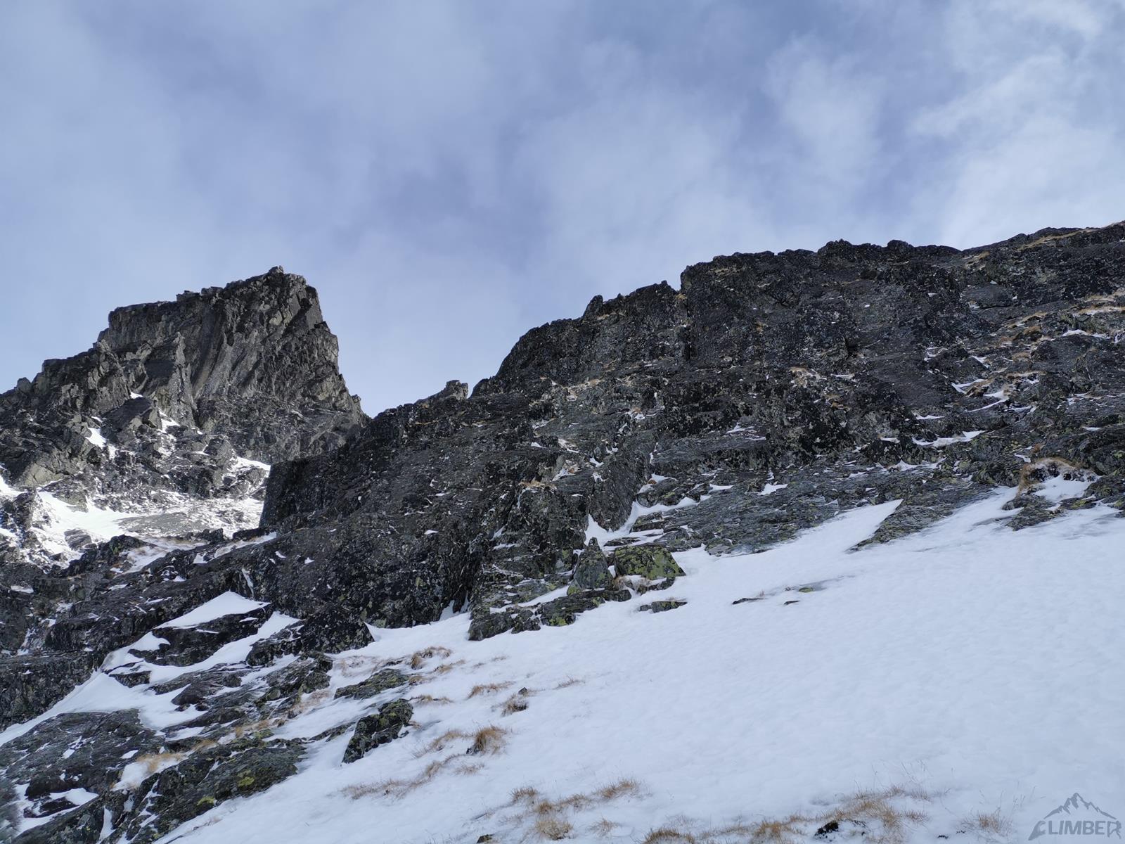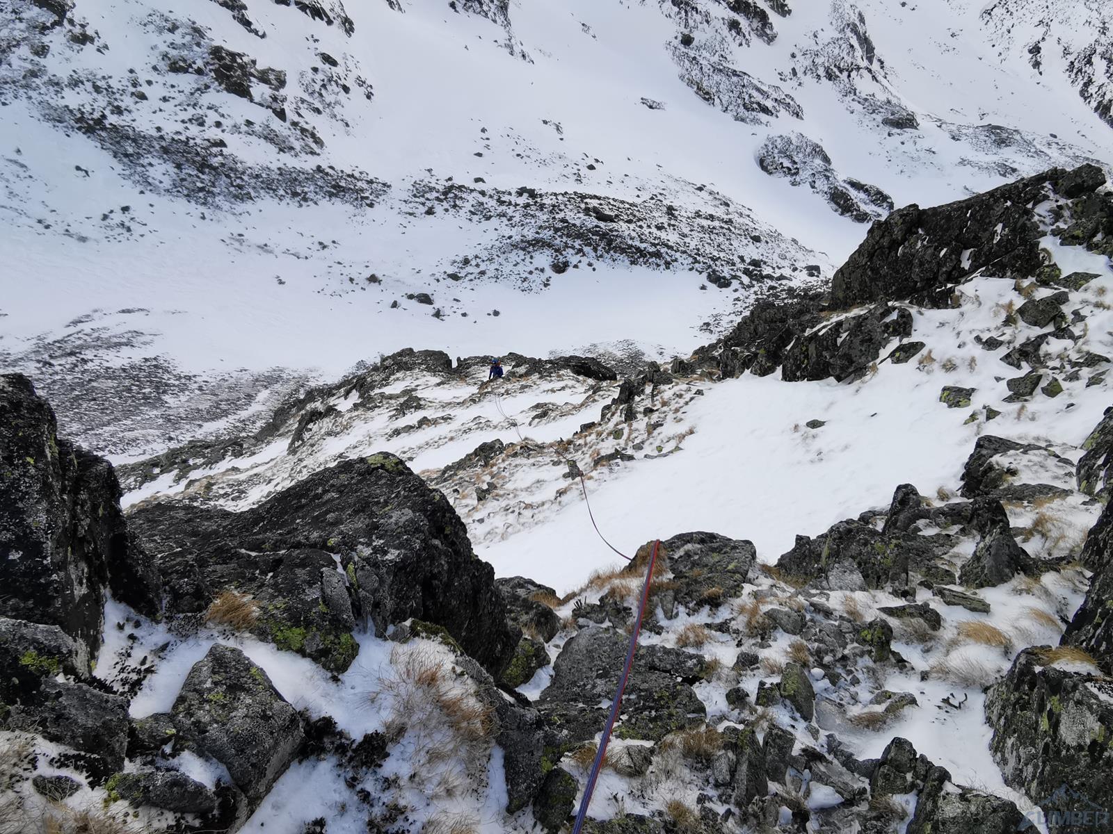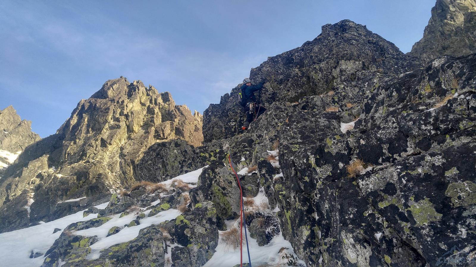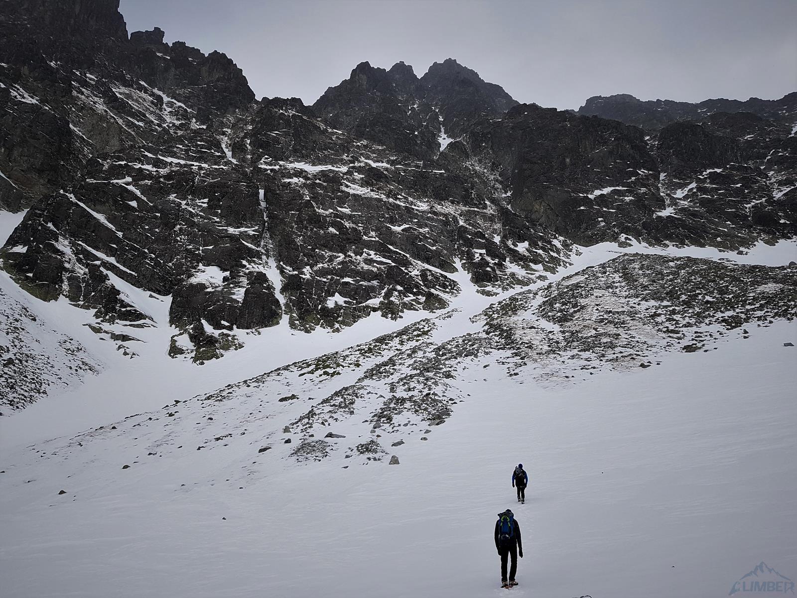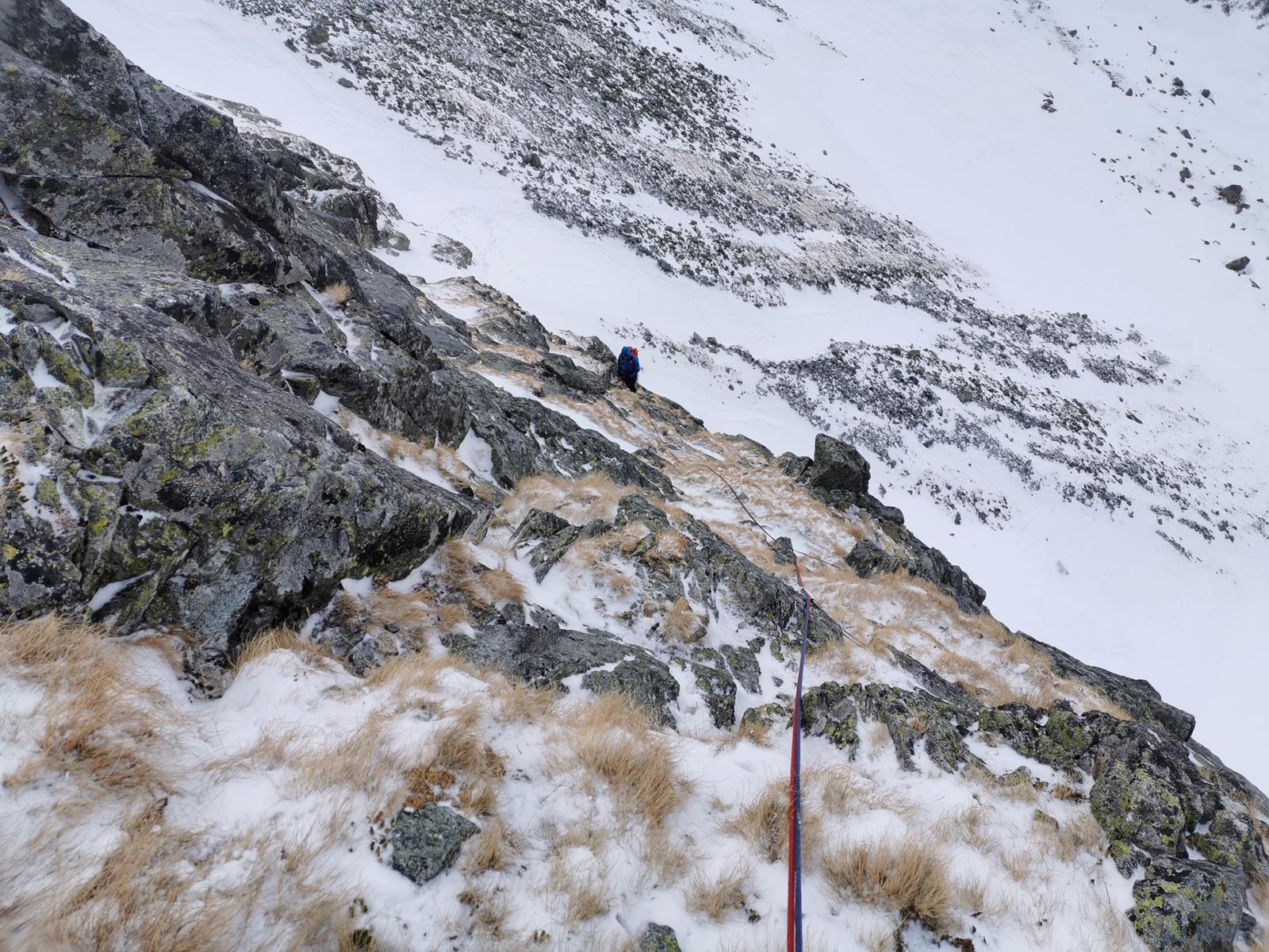 Droga zrobiona podczas obozu zimowego KW Bielsko-Biała w Dolinie Staroleśnej. Po dotarciu do Zbójnickiej Chaty i zrzuceniu z siebie ciężkich plecaków w czwórkę ruszamy w kierunku Baniastej Turni, spod której jednak zaliczamy odwrót – trzeba torować po mocnym opadzie, wieje silny wiatr, jest też późno. Pozostaje opcja rezerwowa, czyli mocno przewiana Sławkowska Kopa i droga, którą można szybko zrobić przed zmrokiem – na taką okoliczność Dáma s péřovkou jest idealna. Ania i Szymon wracają do schroniska, wiążę się z Michałem i zaczynamy wspinanie. Droga wiedzie środkiem trójkątnej ściany (trujholnika) opadającej spod Warzęchowego Przechodu (Slavkovská Priehyba), pomiędzy Warzęchowymi Strażnicami i Sławkowską Kopą.