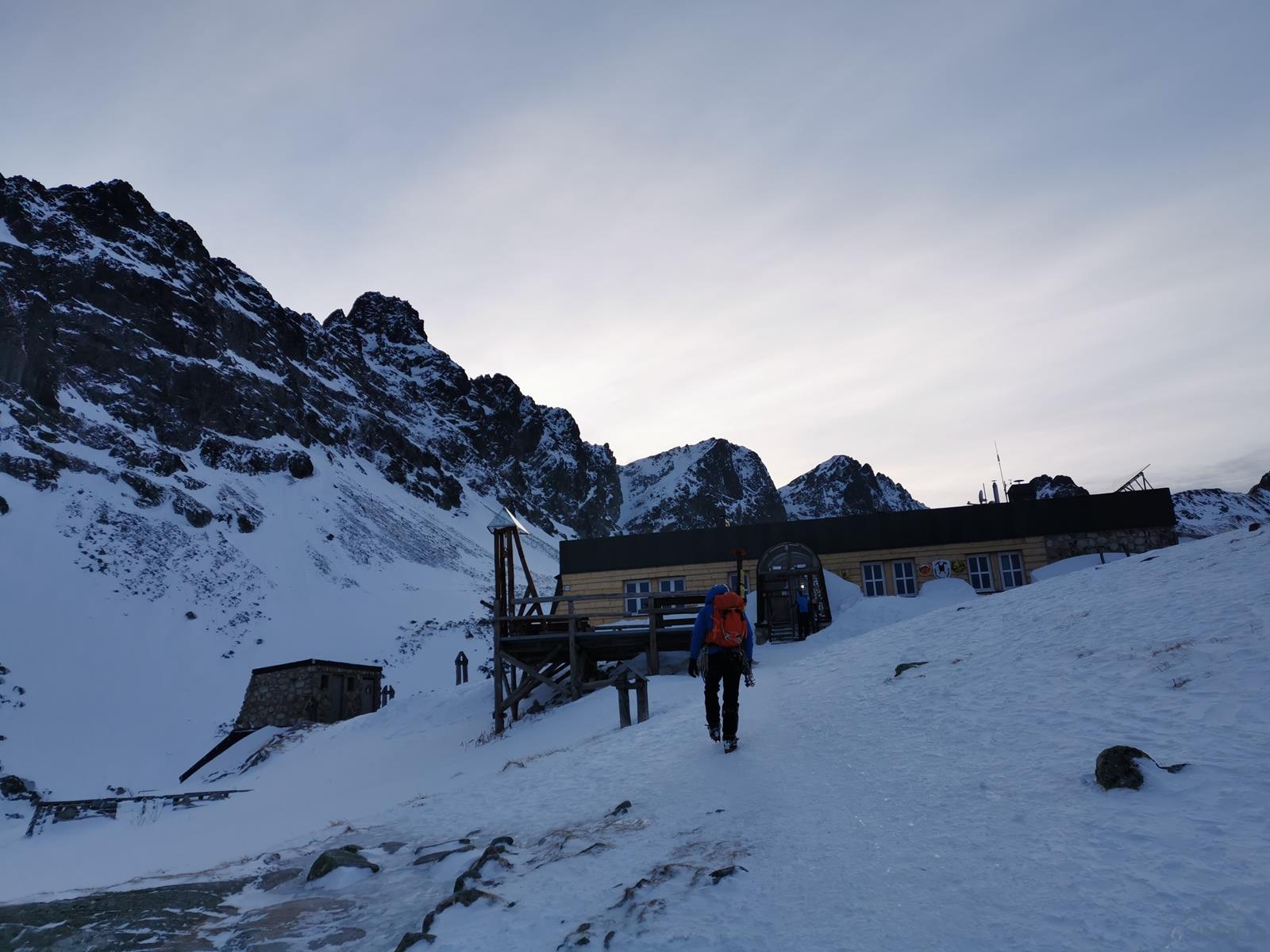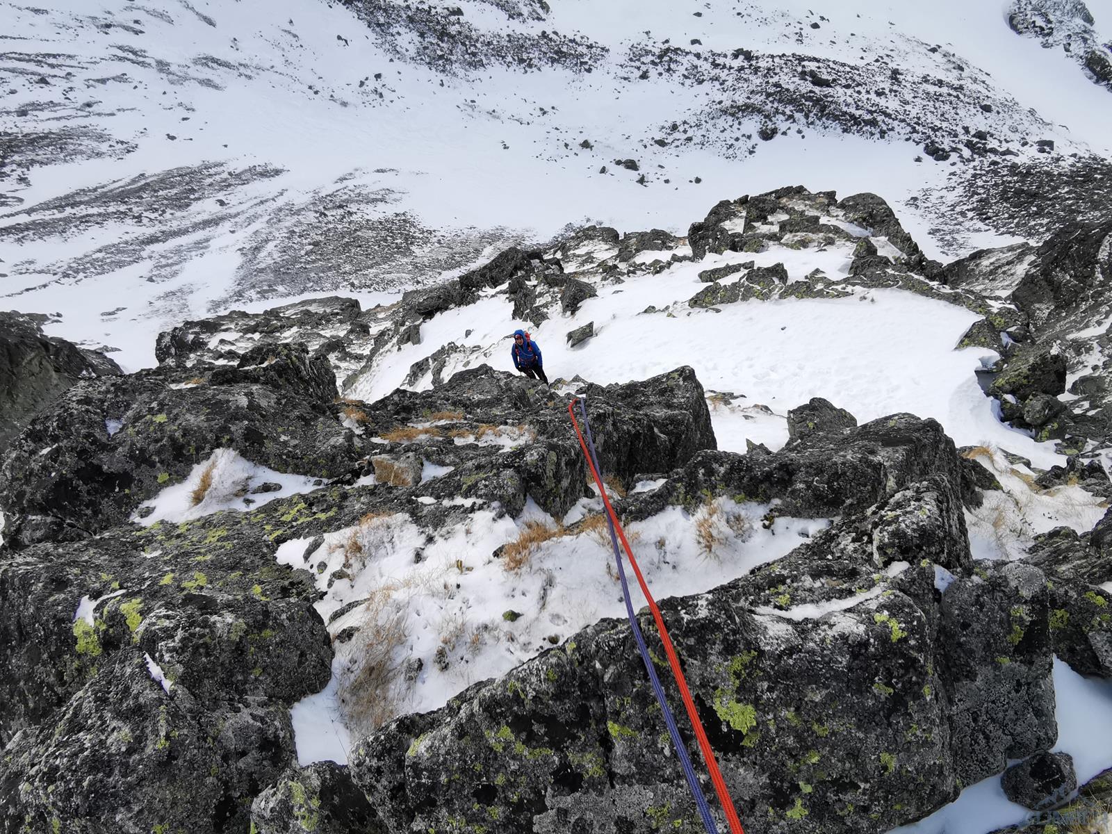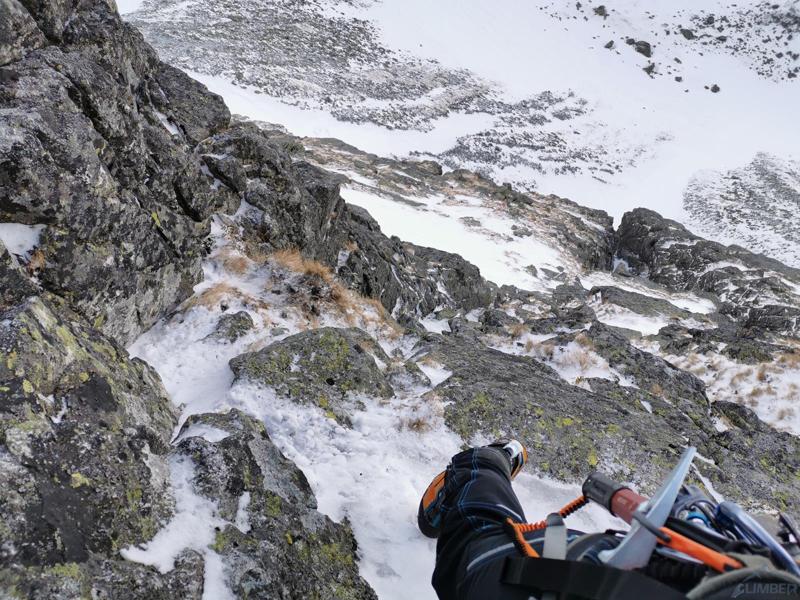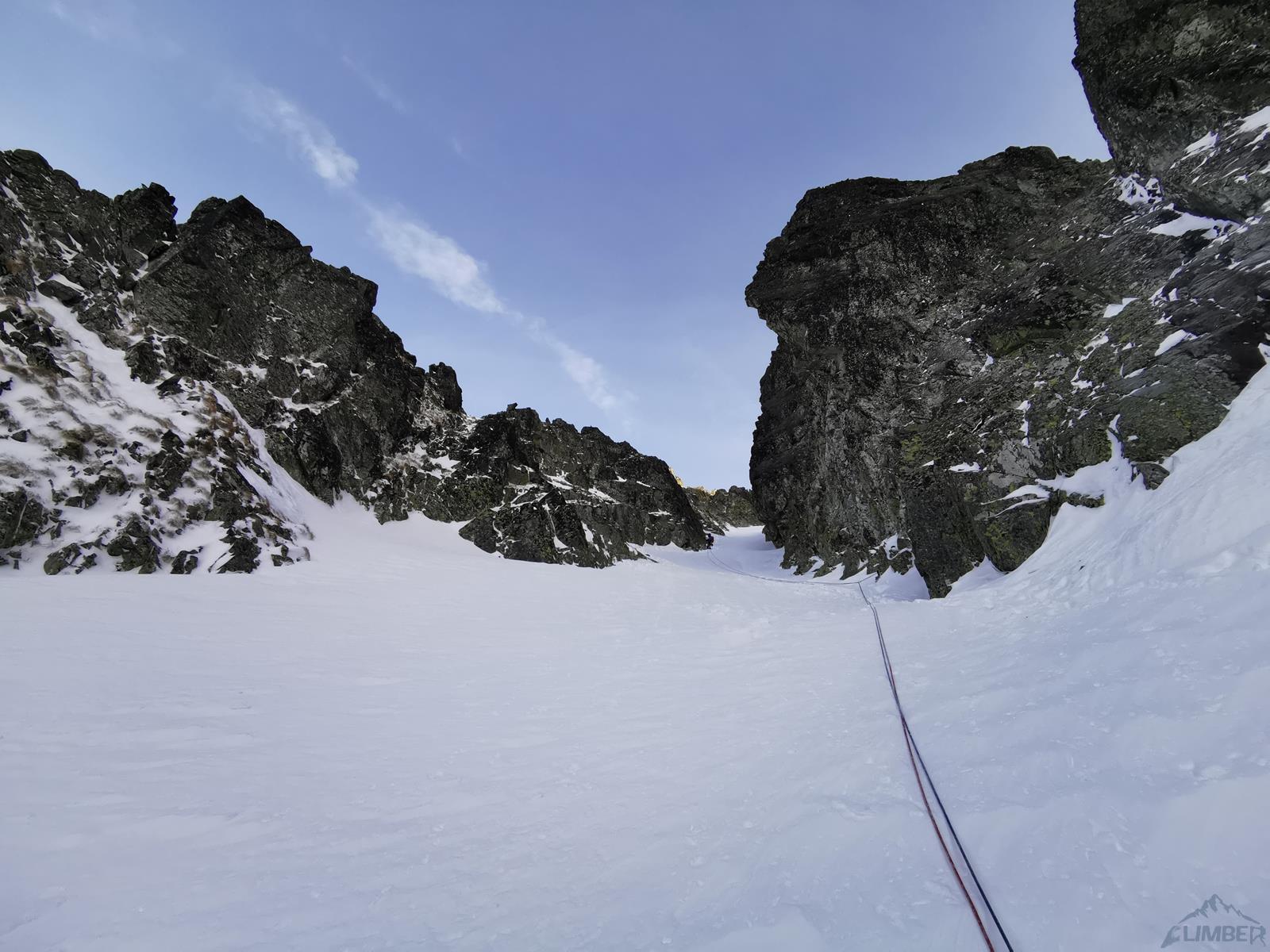 Droga zrobiona podczas obozu zimowego KW Bielsko-Biała w Dolinie Staroleśnej. Po dotarciu do Zbójnickiej Chaty i zrzuceniu z siebie ciężkich plecaków w czwórkę ruszamy w kierunku Baniastej Turni, spod której jednak zaliczamy odwrót – trzeba torować po mocnym opadzie, wieje silny wiatr, jest też późno. Pozostaje opcja rezerwowa, czyli mocno przewiana Sławkowska Kopa i droga, którą można szybko zrobić przed zmrokiem – na taką okoliczność Dáma s péřovkou jest idealna. Ania i Szymon wracają do schroniska, wiążę się z Michałem i zaczynamy wspinanie. Droga wiedzie środkiem trójkątnej ściany (trujholnika) opadającej spod Warzęchowego Przechodu (Slavkovská Priehyba), pomiędzy Warzęchowymi Strażnicami i Sławkowską Kopą.
