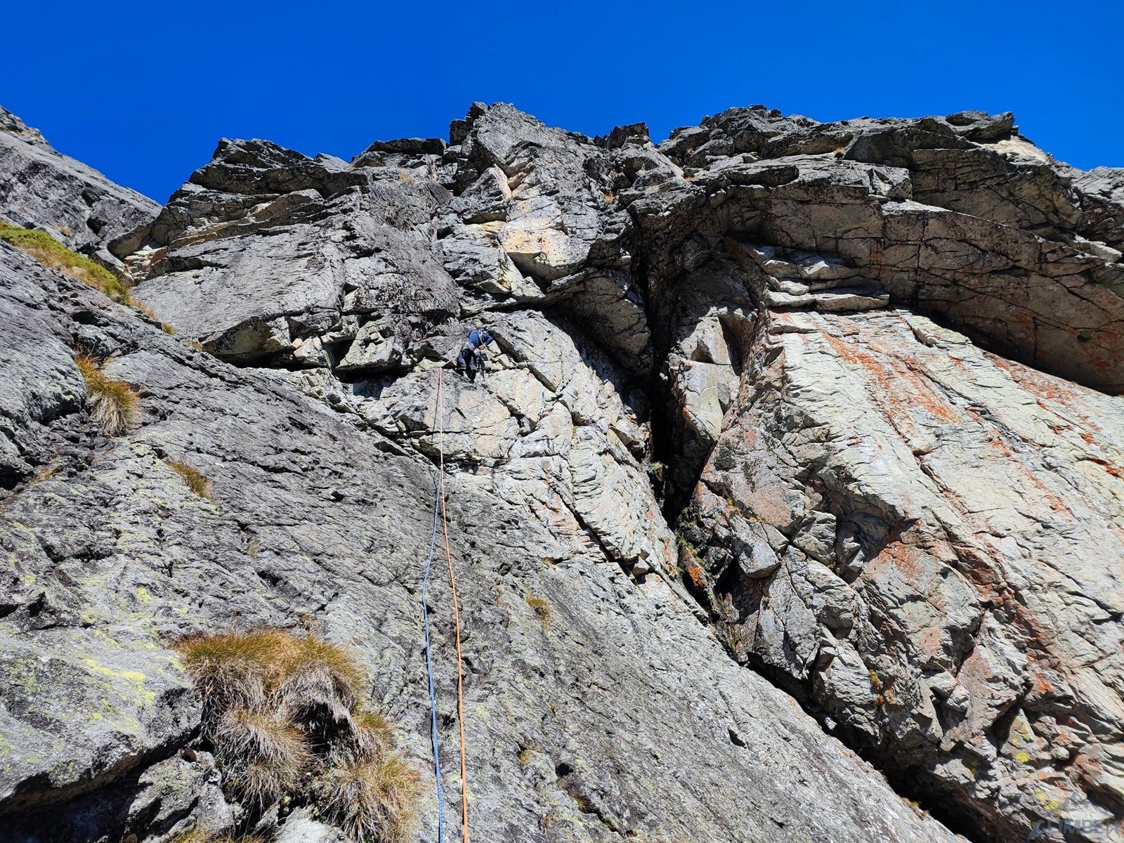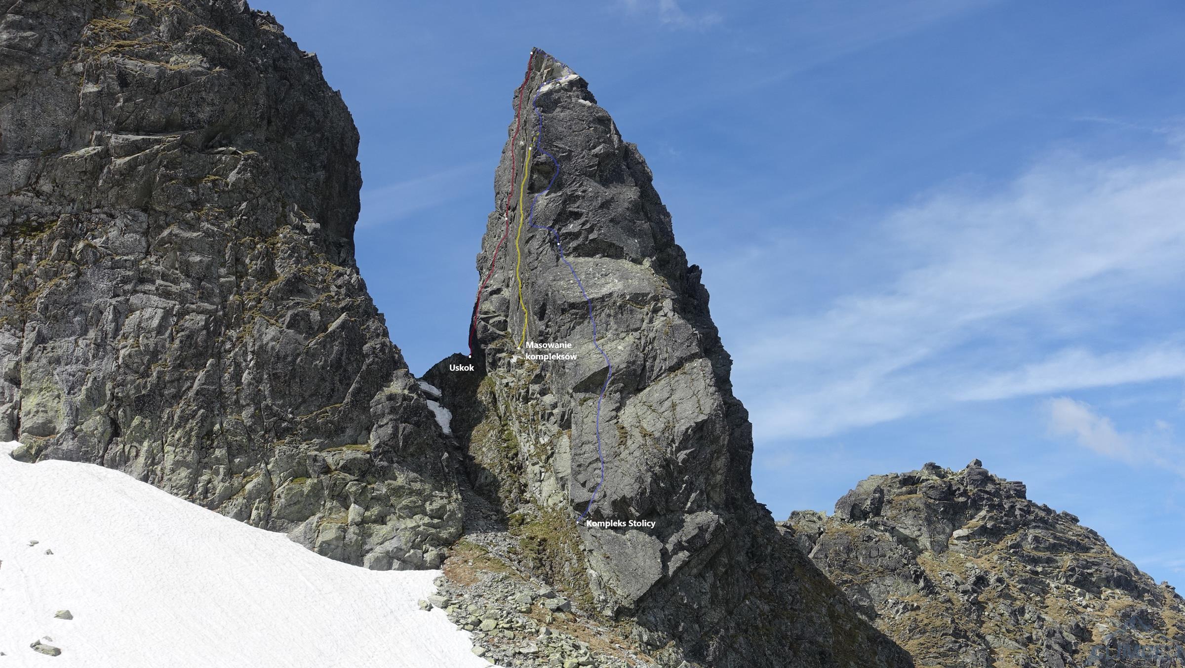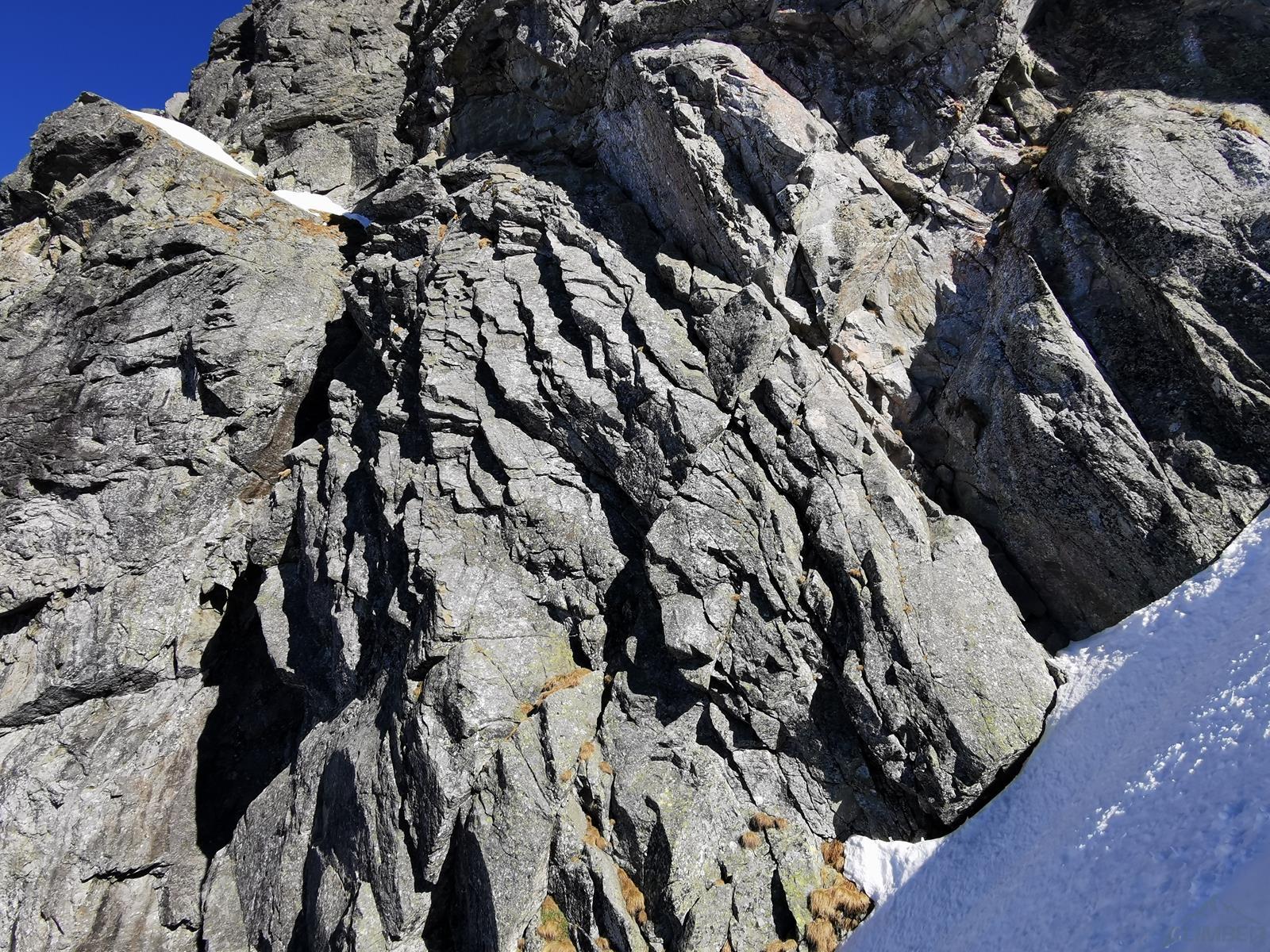 OSTRY SZCZYT (S-SW) tutaj znajdziemy z kolei jedną z najciekawszych tatrzańskich „czwórek” (choć najczęściej przechodzoną piątkowym wariantem) - Motykę (IV/V R1 250m). Inne potencjalne cele na słonecznej wystawie jednego z najbardziej strzelistych szczytów w Tatrach to zaskakująco ładny Häberlein (IV war. V R1 150m), Jaskynky (V R2 300m), świetny Kant Filara (VI- R2 250m) czy wytyczona dość niedawno, bardziej wymagająca asekuracyjnie ciekawa Primula minima (VI R3 280m).
