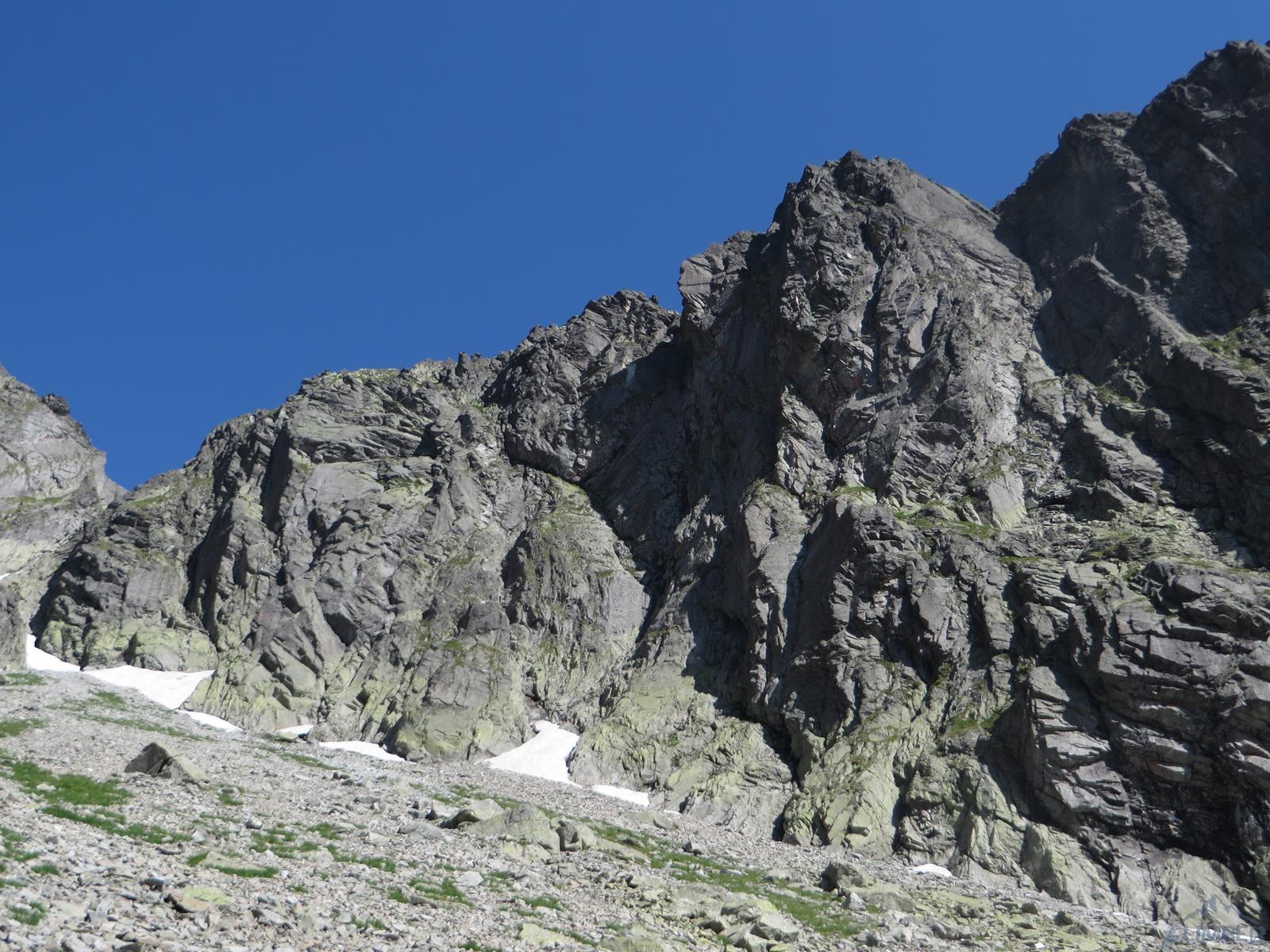 KIEŻMARSKI SZCZYT (S) przepiękna i duża jak na tatrzańskie warunki ściana – szczególnie jeżeli robimy drogi przecinające ją w całości lub łączymy wybrane w dolnej i górnej części. Zaledwie część z łatwiejszych linii wartych powtórzenia to świetny Birkenmajer (IV war. V+ RS1 250m), popularna i traktowana czasem jako droga podejściowa pod górną część ściany tzw. Rampa czyli Lewy Puškáš (IV RS1 500m), mniej popularny ale długi i ciekawy Filar Grosza (IV R1 600m) czy wreszcie jeden z wielkich klasyków - Prawy Puškáš (V R2 450m).