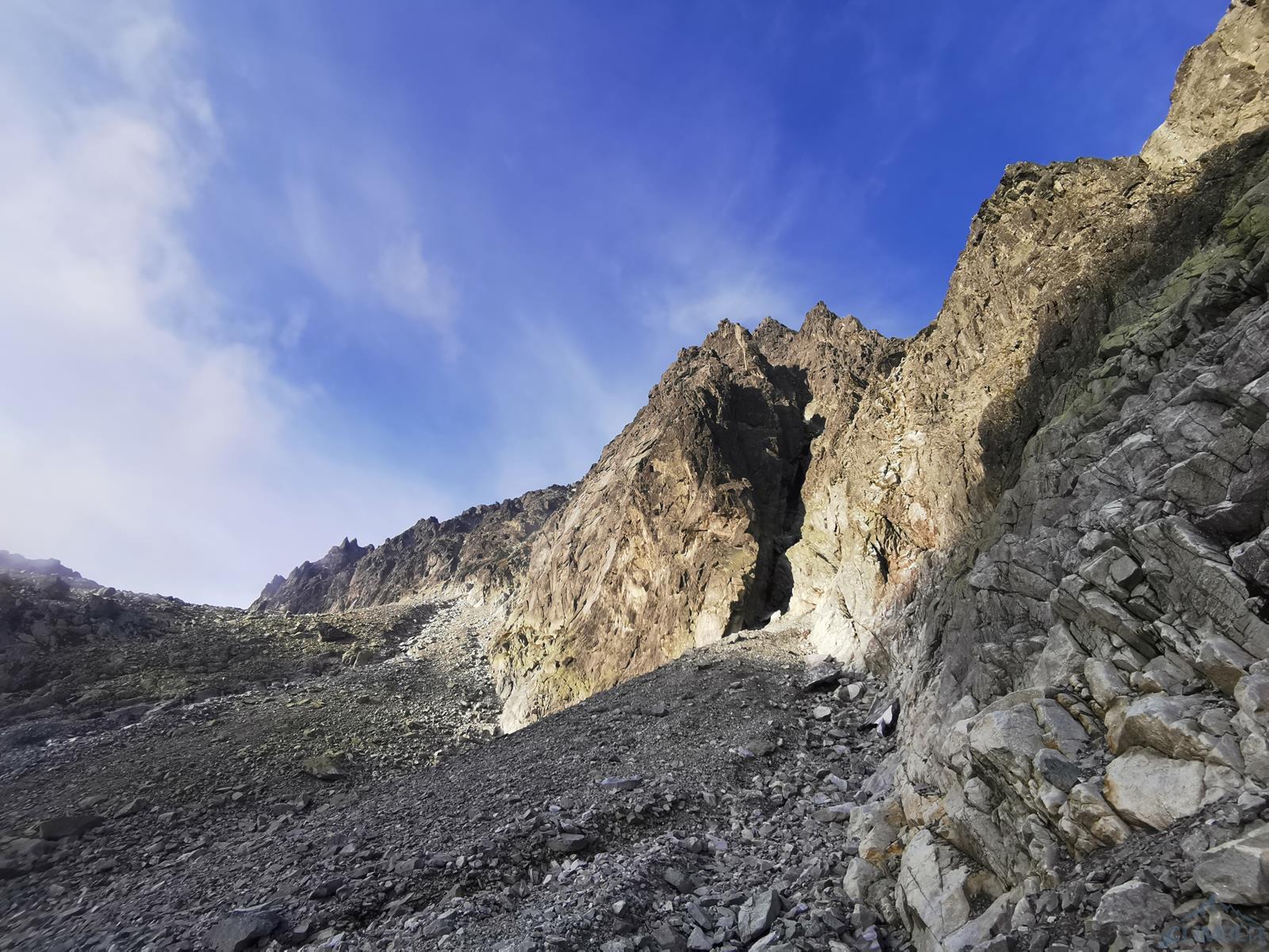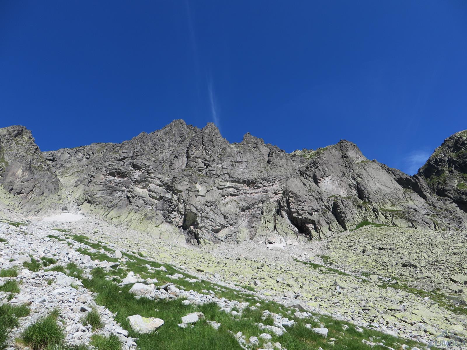 KOPA LODOWA (S), słow. ĽADOVÝ ŠTÍT MALÝ odległa, położona w bezpośrednim sąsiedztwie Przełęczy Lodowej ściana, na której znajdziemy jedną z najładniejszych tatrzańskich piątek - Cestę k slnku (V war. VI R1 250m).