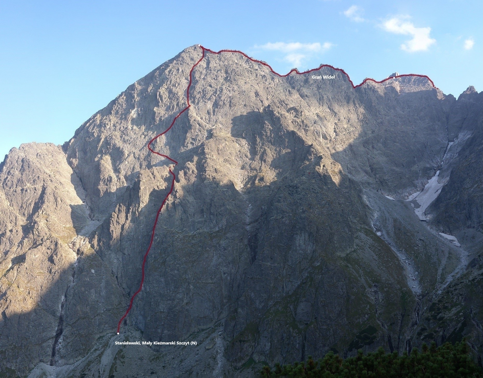 MAŁY KIEŻMARSKI SZCZYT (N) – jednym z łatwiejszych ale i ciekawych sposobów na przejście całej północnej zerwy jest pokonanie jej Filarem Północno-Zachodnim (III R2 1200m), popularnym również zimą i potocznie zwanym Filarem Grosza (opis zimowy). Niewątpliwie jednak to co przyciąga taterników od lat to historyczna linia poprowadzona wielkim kominem przecinającym dolną część ściany – Stanisławski (VI R1 400m do Niemieckiej Drabiny), na Słowacji znana jako Weberovka. Górna część ściany robiona jest rzadko – wspinacze po przejściu komina (w nim znajdziemy stałe stanowiska) najczęściej schodzą w dół wspomnianą wcześniej Drabiną, czyli wielką ławką przecinającą ścianę w poprzek. Warto jednak pokusić się o logiczną kontynuację tzw. Górny Stanisławskim (V R1 ok. 600m) - całość drogi opisana jest w relacji z tzw. Stanisławskich Wideł łączących drogi na Małym Kieżmarskim z Granią Wideł i Stanisławskim na Łomnicy.