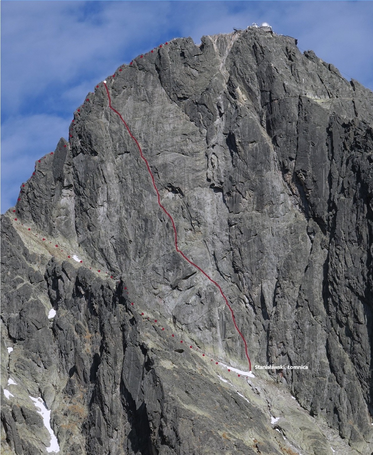 ŁOMNICA (W) – jedna z najładniejszych ścian w Tatrach, wysoka na ok. 300 metrów i oferująca ponad 40 dróg – linii dla początkujących tutaj nie znajdziemy a i na niektórych piątkach trzeba się mocno wspinać. Najpopularniejsze z nich to prowadzący pięknymi płytami i ciekawym kominem Puškáš (V RS1 210m), trawersujący skośną rampą Stanisławski (V R2 350m), krótki ale ładny Kopejkový filar (V+ R2 200m) czy też oferujące wspinanie w dość unikalnych formacjach ale dość mocne jak na piątkę i wymagające sprawnej asekuracji Pękniecie w płycie (V+ R3 260m) - po słowacku Puklina v Platni. Propozycja szóstkowa to historyczna linia przecinająca całą ścianę, na której nadal poczuć można przygodę - Birkenmajer (VI R2 400m), z trudnościami na tzw. Ściance Kupczyka, oryginalnie wycenionej na V.