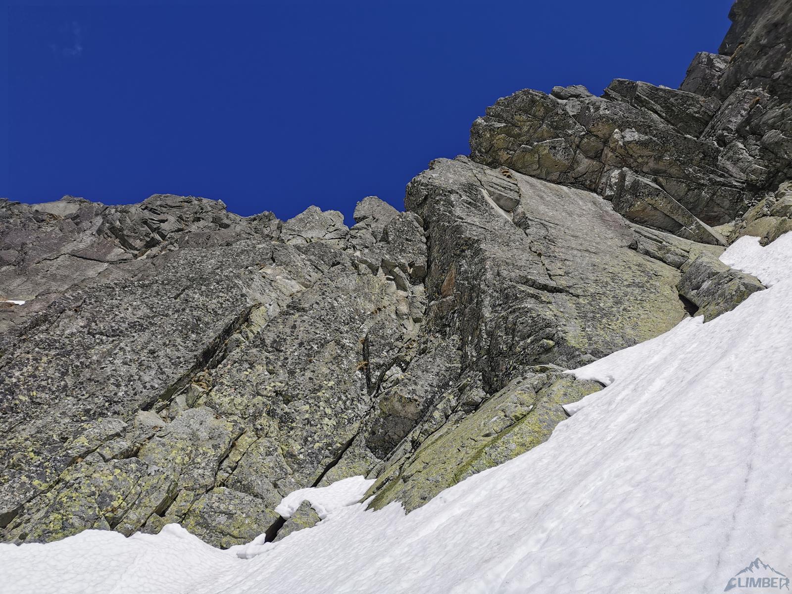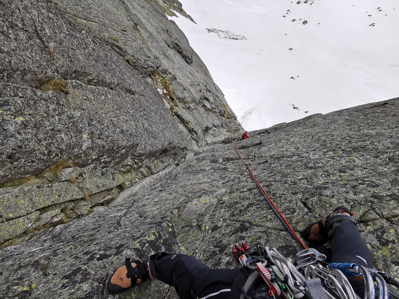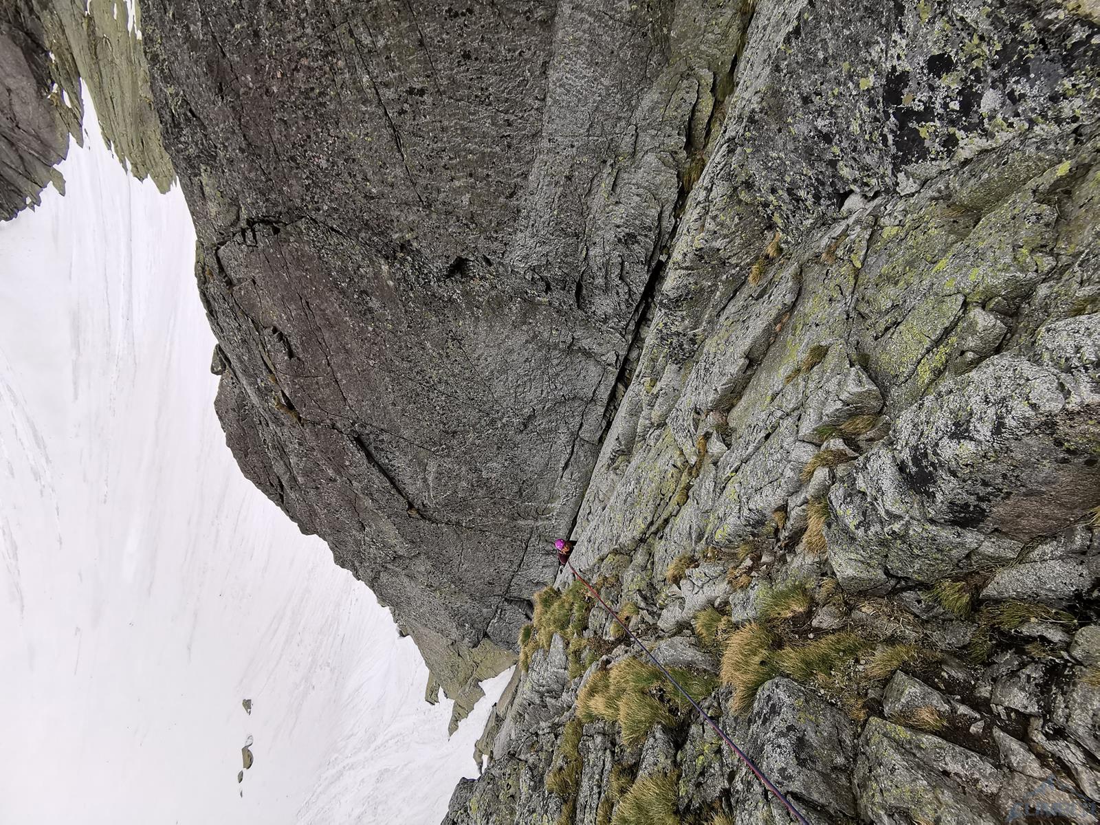 Długo wyczekiwany początek sezonu w Tatrach - granica ze Słowacją nadal zamknięta, po deszczowym tygodniu wybieramy więc południową wystawę Zamarłej. W górnych partiach nadal zalega bardzo dużo śniegu, gdy docieramy więc do Dolinki Pustej, ukazuje się nam widok jak z Enversów, gdzie w ściany startuje się prosto z lodowca. Rano zacięcia i rysy są jeszcze mokre, postanawiamy więc rozpocząć od wspinania na skąpanym w Słońcu Lewym Kancie. Początkowo w planach jest Egzamin z Fizyki (VII), jednak gdy omijamy pierwszy kruchy fragment lewą stroną, a na drugim długo błądzę w poszukiwaniu odpowiedniego (i suchego) wariantu, od trzeciego stanowiska postanawiamy zrobić kombinację najładniejszych wyciągów powyżej - jednego z Lewego Heinricha i dwóch z Mu-Mu-Mu.