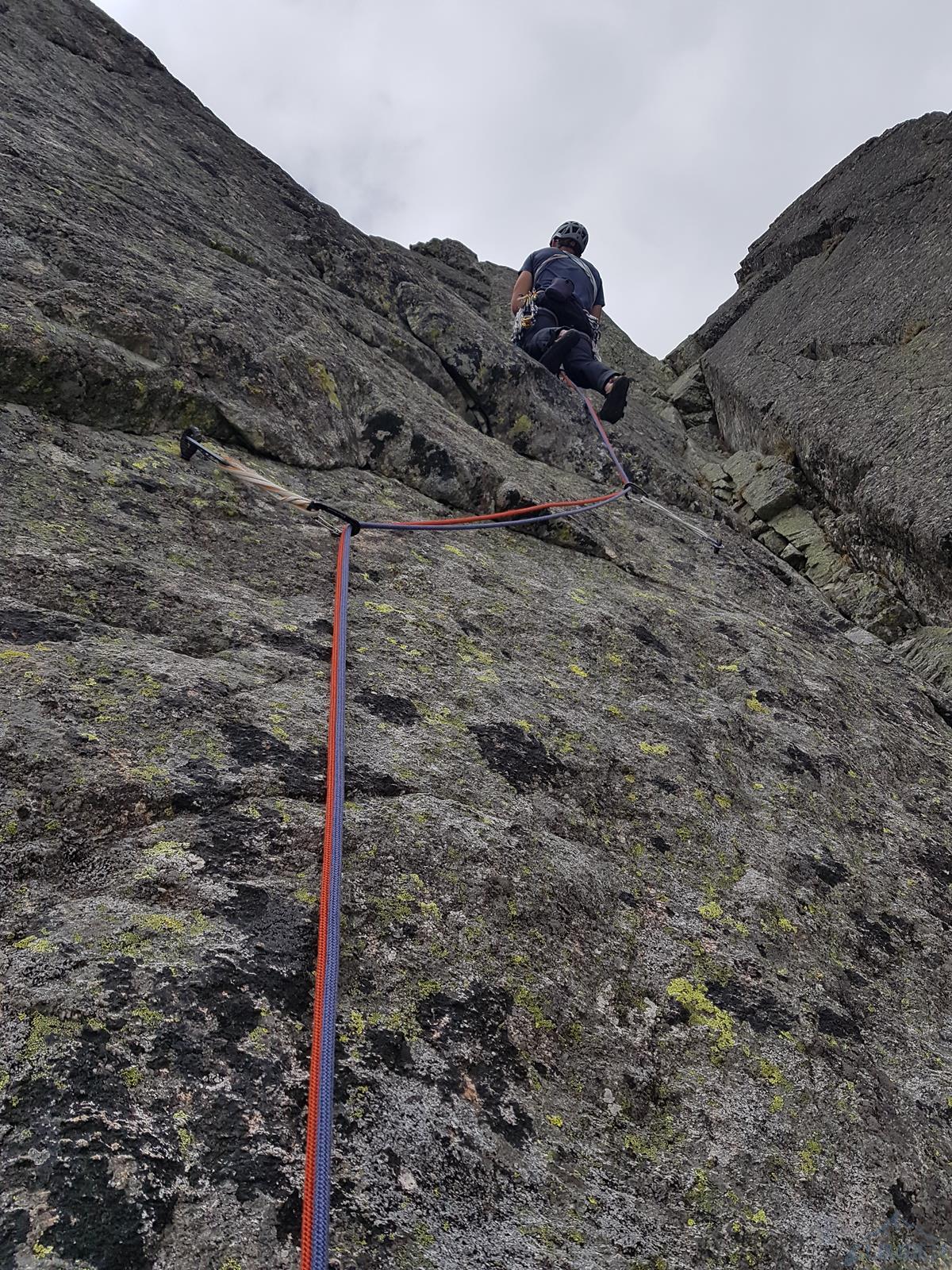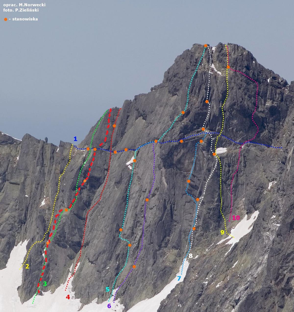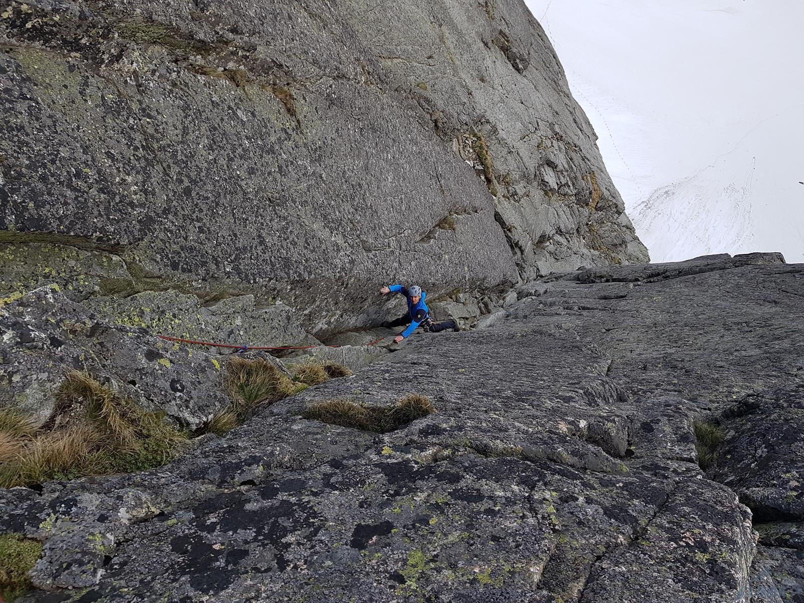 Kluczowy wyciąg na Lewym Heinrichu zaczyna się wąskim zacięciem, którym dochodzimy do niezwykle eksponowanego fragmentu (VI/VI+) z niebanalną rysą - zaraz później docieramy do wspólnego stanowiska z 3 wspominanych dróg (ring + spit). Heinrich od tego miejsca biegnie łatwiejszym terenem w lewo, my decydujemy się kontynuuować dwoma ładnymi wyciągami Mu-Mu-Mu (wyposażonego w stare ringi z prętów co kilka metrów, można coś dokładać miejscami). Zaraz nad stanowiskiem czeka nas płytka za VII- z efektownym przewinięciem, po czym już dobrze urzeźbioną ścianką dochodzimy do stanu. Ostatni wyciąg (również VII-) to bardzo ładne płytowe wspinanie, na początek tarcie plus krawądki, końcówka po dobrych chwytach. Zadowoleni, że udało się "uratować" sytuację i przewspinać trzy piękne wyciągi zjeżdżamy pod ścianę, a właściwie na półkę nad śniegiem zakrywającym dolne 10-15 metrów ściany.