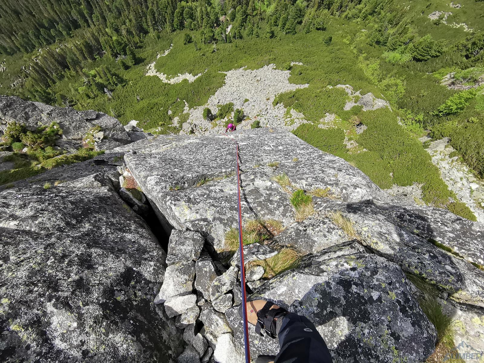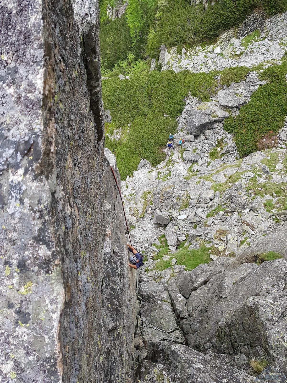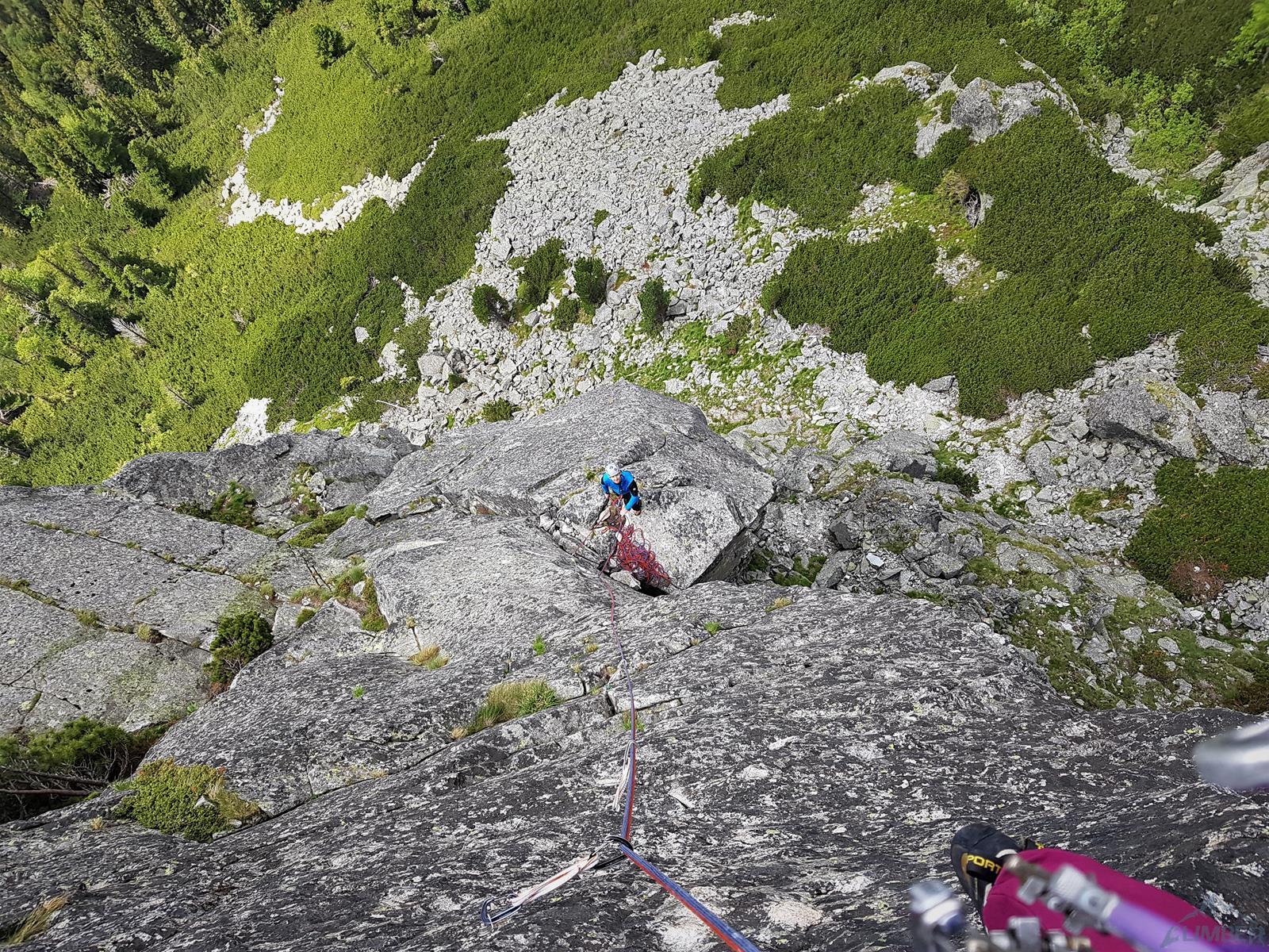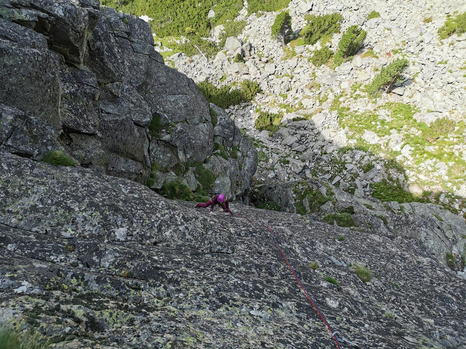 Co do samej AliNiny, droga jest prawie w całości obita (RS1, 3-4 małe/średnie friendy opcjonalnie) i ma trzy krótkie, różnorodne wyciągi. Po przejściu komina z drogi Pavlín-Kráčalík możemy od razu wejść w płytę z trudnościami (VI+) albo założyć stanowisko pośrednie.Wspinamy się w ryskach i po krawądkach, po czym dochodzimy do gotowego stanowiska pod okapem. Po efektownym, ale klamiastym przewinięciu, na drugim wyciągu czeka nas krótki techniczny połóg (VI) i wygodna półka z kolejnym stanem. Początek ostatniego wyciągu (VI) może zaskoczyć z powodu deficytu chwytów na starcie, potem rzeźba robi się dużo lepsza i możemy delektować się dobrymi krawądkami na pionującej sie płycie. Po zrobieniu drogi zjeżdżamy wzdłuż kantu i bawię się z liną z góry na dwóch ostatnich wyciągach sportowego Shangri La (VIII i VIII-), szczególnie kluczowy wyciąg jest naprawdę ładny - trzeba będzie kiedyś wrócić i spróbować przejść całą drogę w należytym stylu. Polecam, a jeżeli to dla kogoś za dużo - można (tak kiedyś zrobiliśmy) przejść pierwszy wyciąg (VII) i kontynuować AliNiną. Mimo słonecznego popołudnia 'nasze' drogi nadal zacieknięte, po powrocie pod ścianę postanawiamy więc zakończyć działanie i udać się do Smokovca na nocleg.
