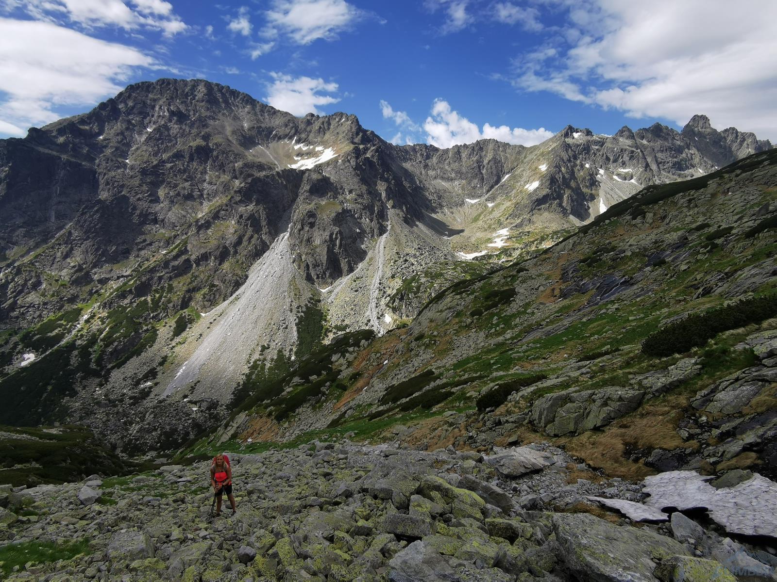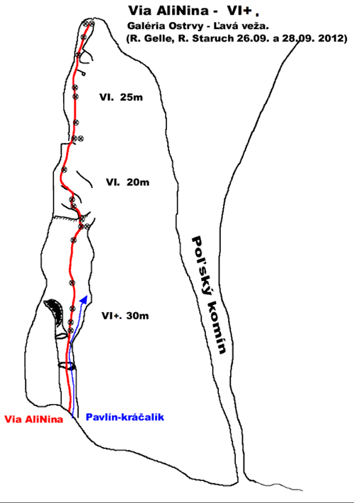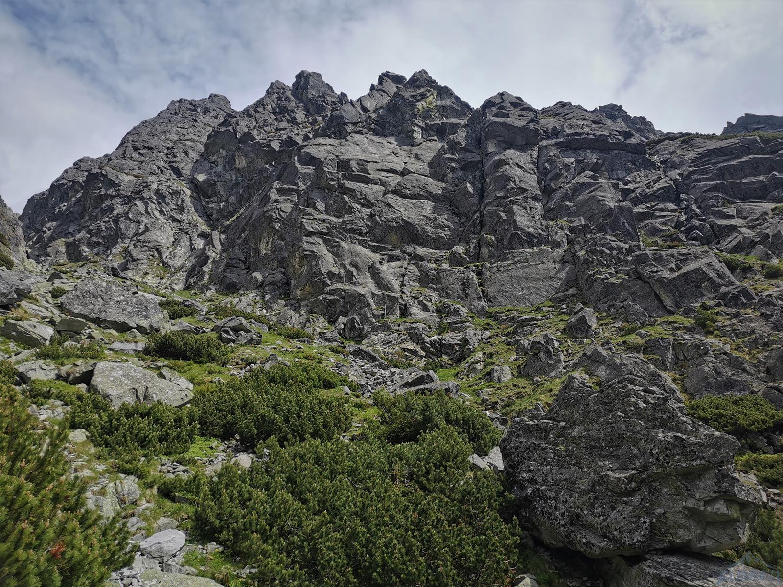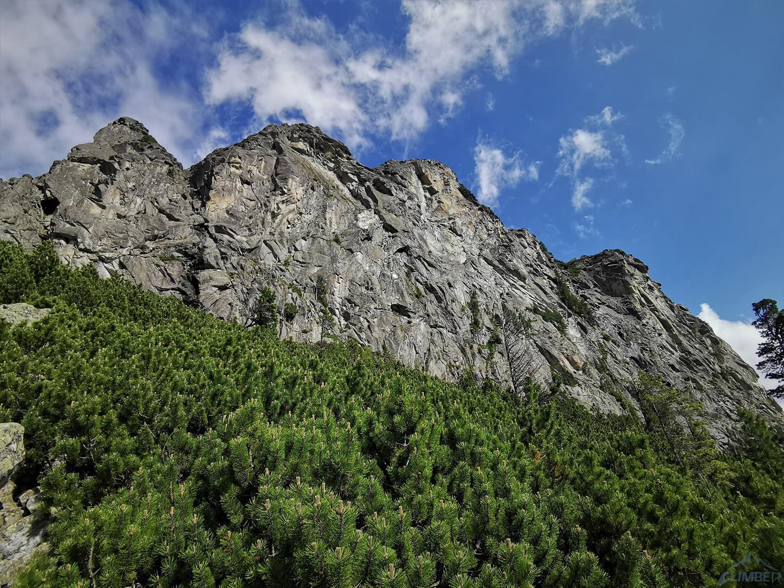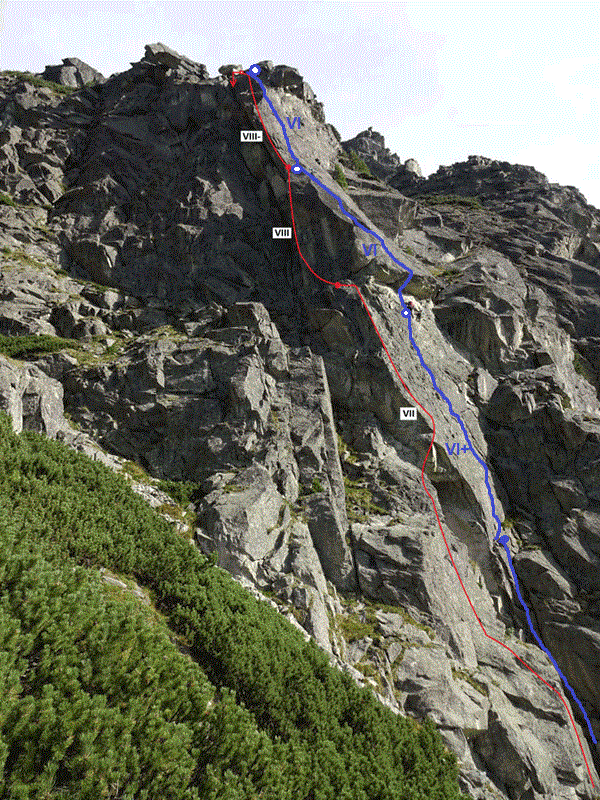 Co do samej AliNiny, droga jest prawie w całości obita (RS1, 3-4 małe/średnie friendy opcjonalnie) i ma trzy krótkie, różnorodne wyciągi. Po przejściu komina z drogi Pavlín-Kráčalík możemy od razu wejść w płytę z trudnościami (VI+) albo założyć stanowisko pośrednie.Wspinamy się w ryskach i po krawądkach, po czym dochodzimy do gotowego stanowiska pod okapem. Po efektownym, ale klamiastym przewinięciu, na drugim wyciągu czeka nas krótki techniczny połóg (VI) i wygodna półka z kolejnym stanem. Początek ostatniego wyciągu (VI) może zaskoczyć z powodu deficytu chwytów na starcie, potem rzeźba robi się dużo lepsza i możemy delektować się dobrymi krawądkami na pionującej sie płycie. Po zrobieniu drogi zjeżdżamy wzdłuż kantu i bawię się z liną z góry na dwóch ostatnich wyciągach sportowego Shangri La (VIII i VIII-), szczególnie kluczowy wyciąg jest naprawdę ładny - trzeba będzie kiedyś wrócić i spróbować przejść całą drogę w należytym stylu. Polecam, a jeżeli to dla kogoś za dużo - można (tak kiedyś zrobiliśmy) przejść pierwszy wyciąg (VII) i kontynuować AliNiną. Mimo słonecznego popołudnia 'nasze' drogi nadal zacieknięte, po powrocie pod ścianę postanawiamy więc zakończyć działanie i udać się do Smokovca na nocleg.