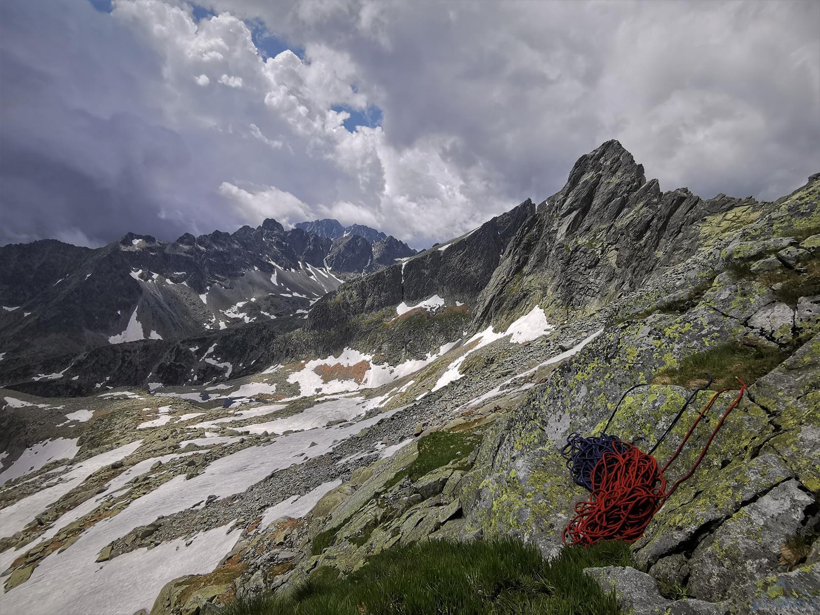Czerwiec w Tatrach w tym roku nie rozpieszcza - często pada, a gdy już robi się słonecznie, nadal jest burzowo, należy też liczyć się duża wilgotnością. W sobotę meldujemy się pod Galerią Osterwy z zamiarem zrobienia dwóch ładnych dróg, niestety po nocnej ulewie ściana jest pokryta zaciekami, które nie znikną z kluczowych miejsc aż do późnego popołudnia. AliNinę (VI+) wspominam miło z poprzedniego przejścia (RELACJA), mokrawy jest tylko pierwszy wyciąg, opcja wydaje się więc rozsądna. Dodatkowo będzie okazja do sprawdzenia ruchów na Shangri La. Prognozy na niedzielę zmieniają się na lepsze, postanawiamy więc wybrać się wyżej - pod Mały Lodowy i Ostry, co finalnie okazuje się chybionym pomysłem - jak wiadomo pogoda za nic ma ludzkie plany 😉.