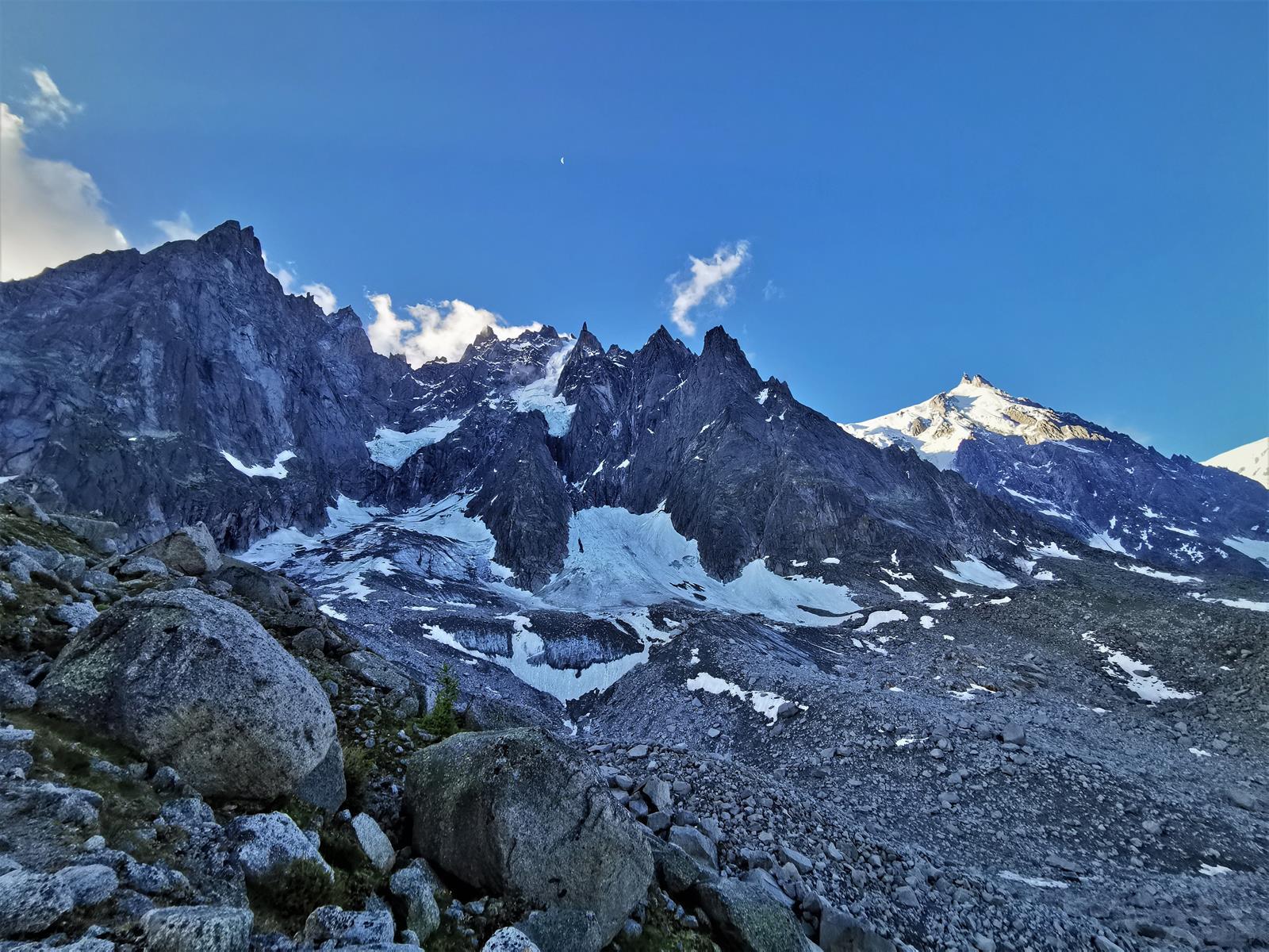 Na początek naszej przygody zmierzyć musimy się jednak z komplikacjami – plan zakładał dojazd na miejsce w poniedziałkowe popołudnie, wyjazd kolejką na Plan, rozbicie namiotu, odpoczynek i rozpoczęcie wspinania o świcie dnia następnego, ewentualnie w przypadku lepszych prognoz na środę zrobienie we wtorek czegoś krótkiego na Filarze Aiguille de Blaitière. Niestety, w związku z nieplanowanym kilkugodzinnym opóźnieniem wyjazdu, do Chamonix docieramy dopiero w poniedziałek późnym wieczorem, a ponieważ w środę ma lać, pozostaje jedynie opcja „intensywna i niepewna” czyli start z kolejki rano, rozbicie namiotu na podejściu, wspinanie, nocne zjazdy, krótka regeneracja, zwinięcie bazy i powrót do miasta, a wszystko przy niezbyt przyjemnej pogodzie (zimno, chmury i przelotne opady).