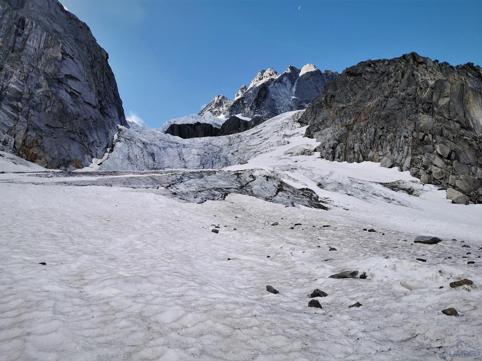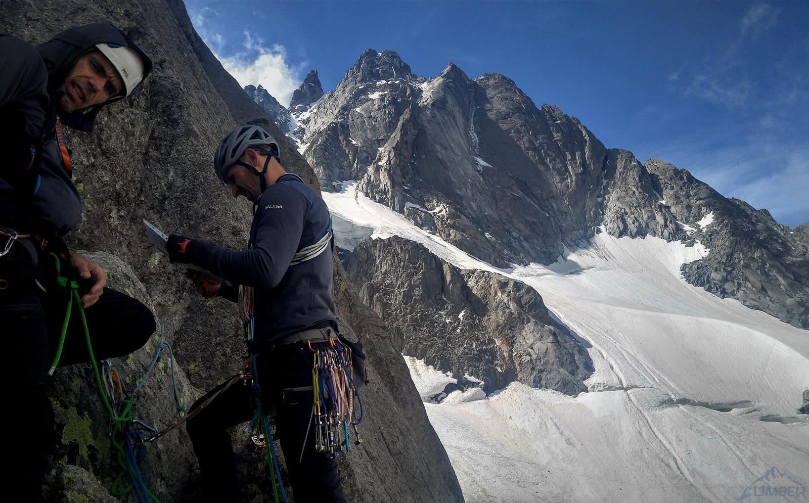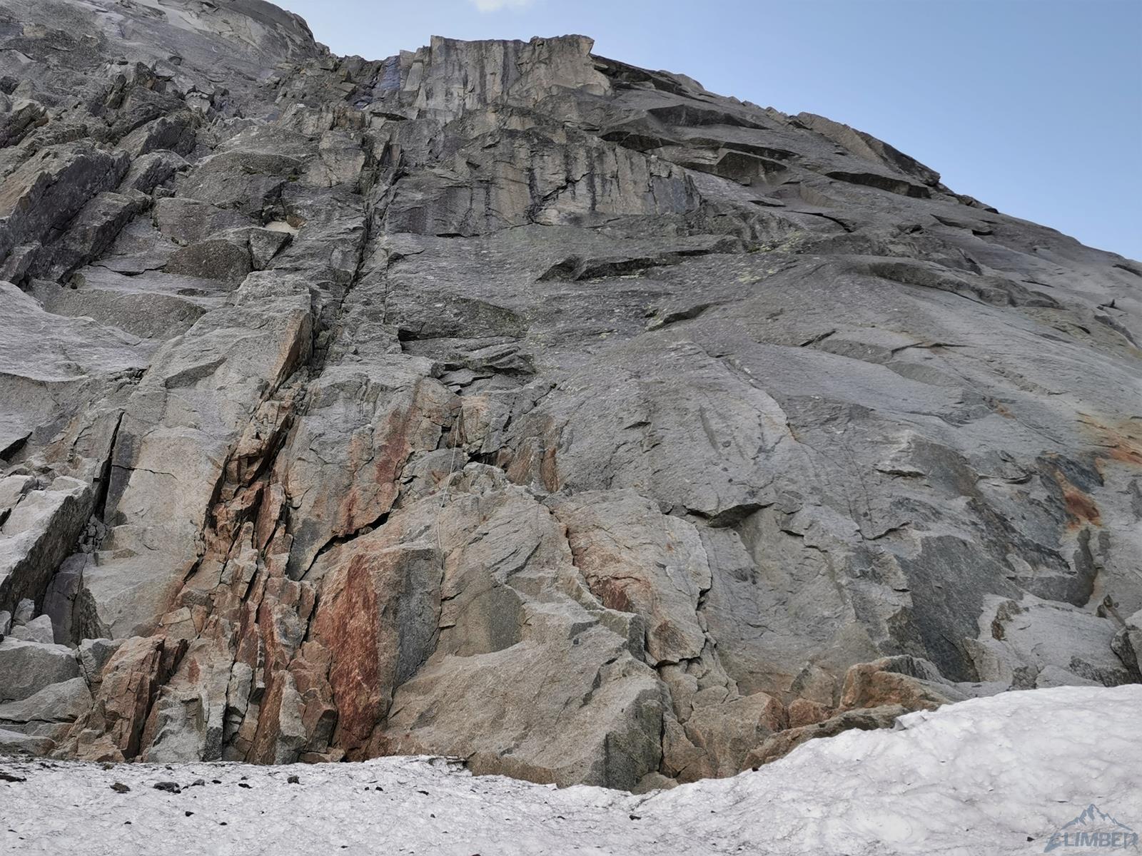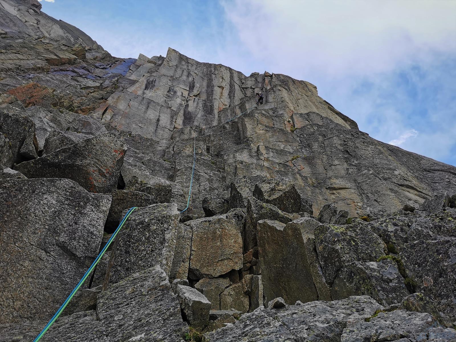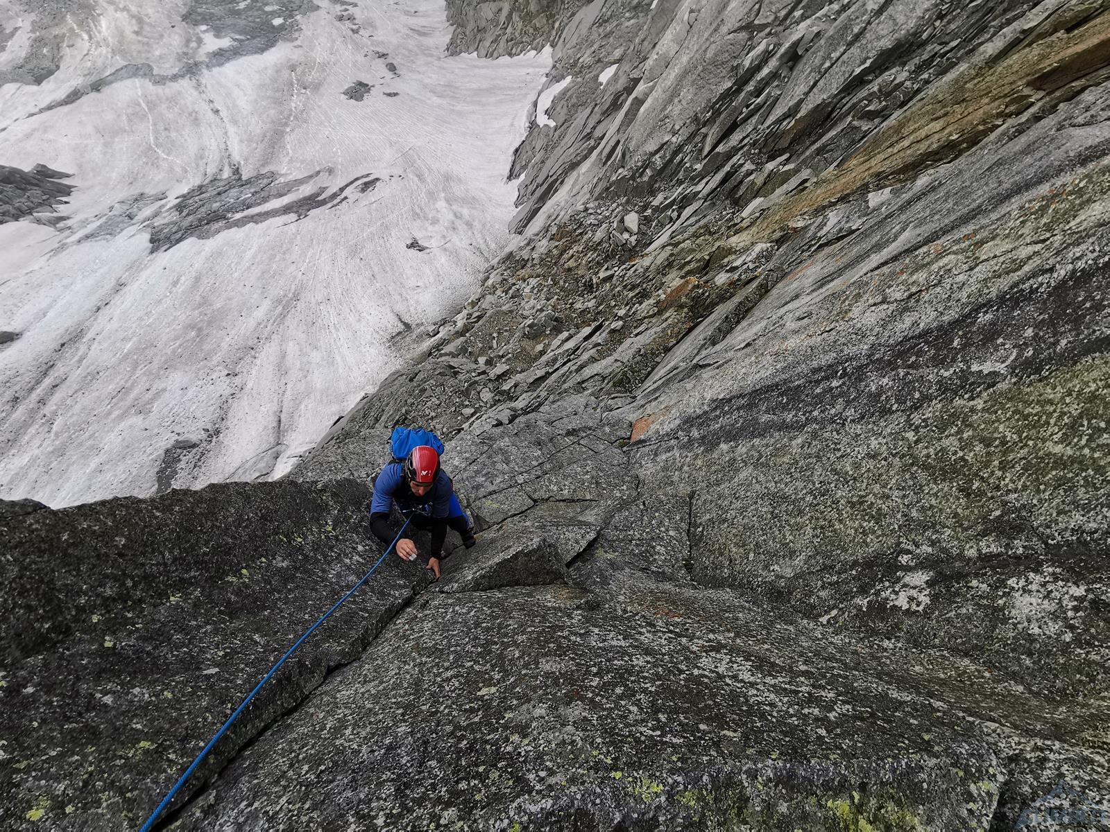 Postanawiamy jednak podjąć rękawicę i nie „iść zrobić drogę” a „iść się fajnie powspinać” (zgodnie z maksymą, że celem jest droga a nie jej koniec 😉) - ile zrobimy, tyle zrobimy. Początek napawa optymizmem – jesteśmy pierwsi w kolejce, podejście mija szybka, namiot szybko rozbijamy w świetnym miejscu, pod drogą meldujemy się przed 10-tą , pogoda rokuje przynajmniej na kilka godzin, a spręż jest na wysokim poziomie. Prowadzić będziemy na zmianę z Szymonem, dla Michała jest to pierwsze alpejskie wspinanie – decyduje się więc na zbieranie doświadczenia „na trzeciego” i dociążenie plecaka, tak by prowadzący szedł na lekko. By wspinanie było komfortowe i szybsze, postanawiamy również nie zabierać ze sobą górskich butów na zjazdy – oj ponarzekamy na to w nocy, gdy zawieje i sypnie śniegiem 😉.
