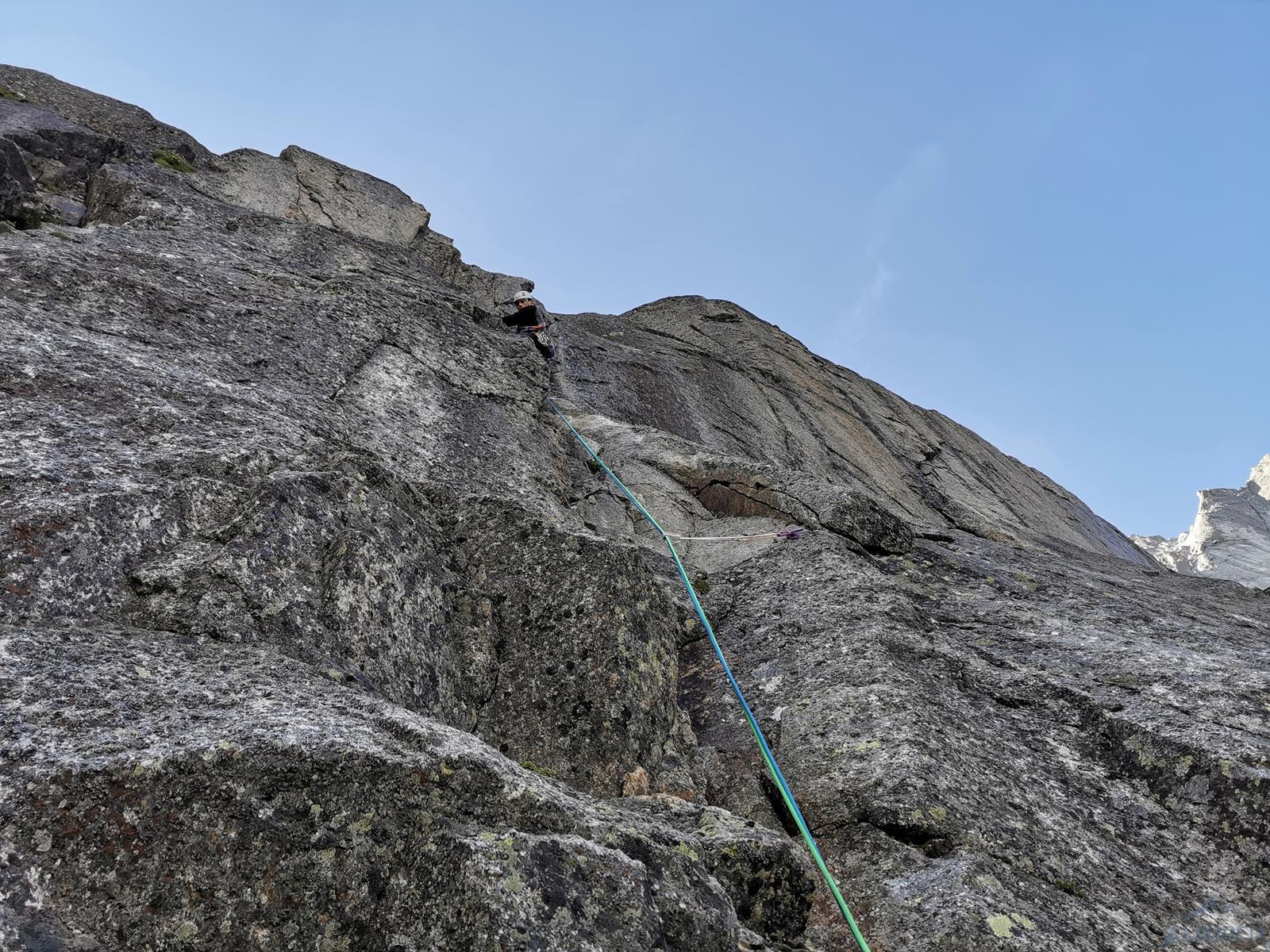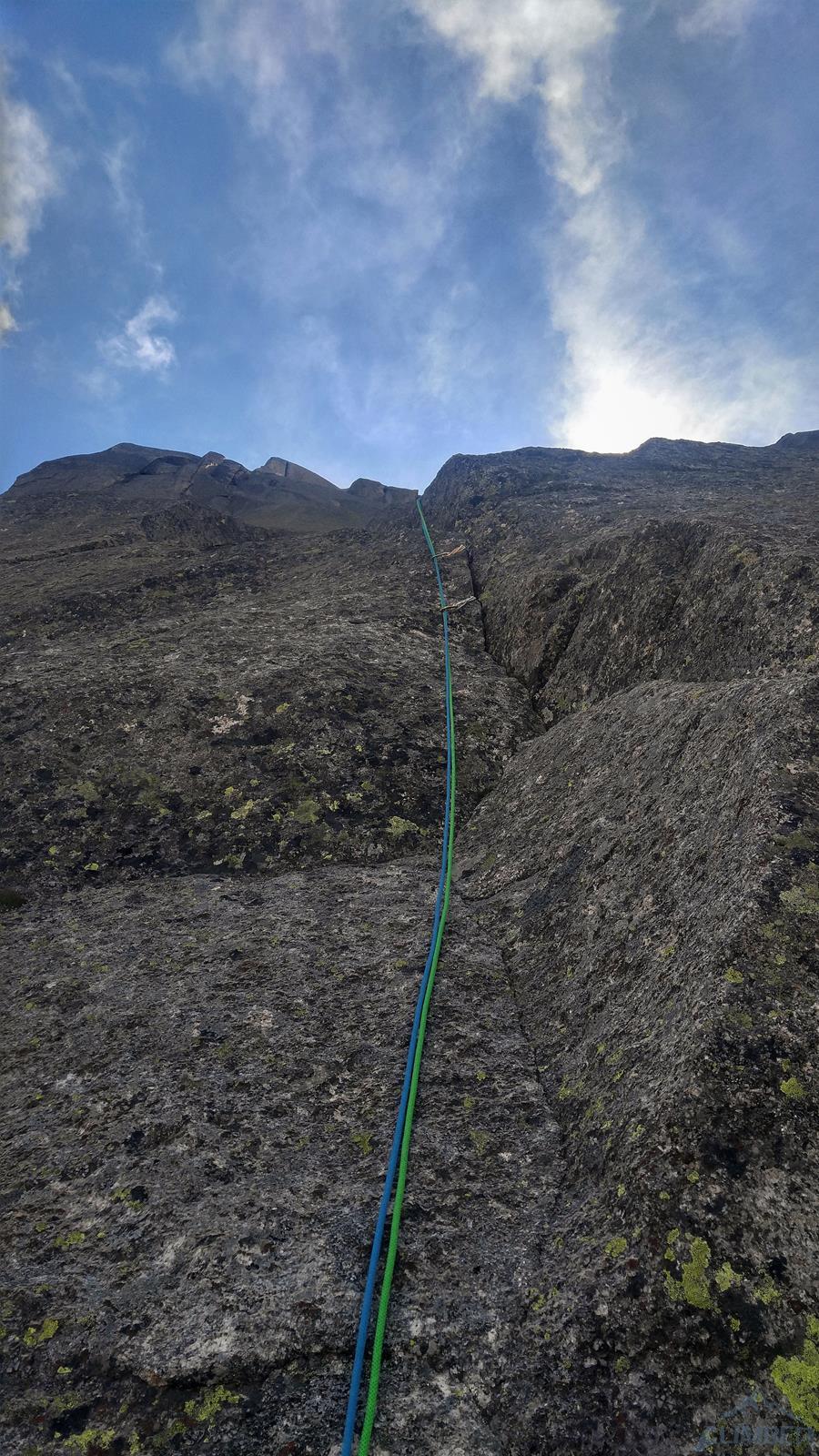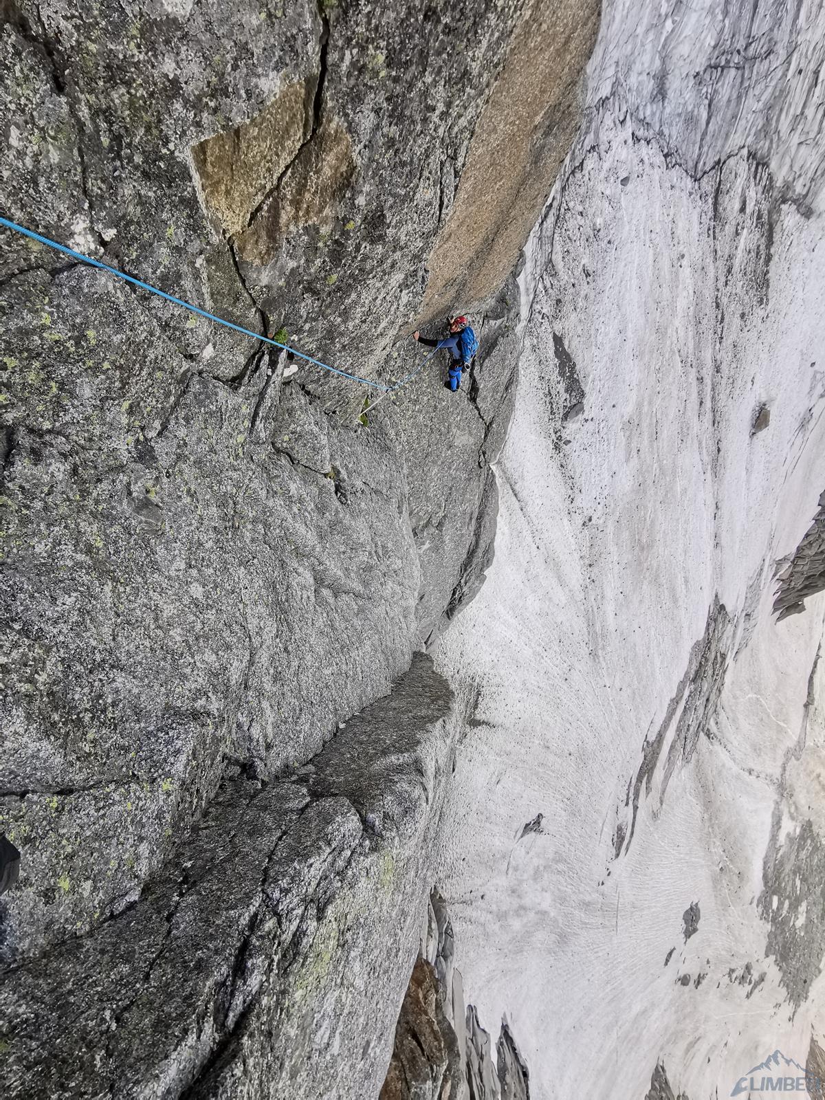 Zaczynamy łatwym wyciągiem doprowadzającym pod ciasne zacięcie (VI-) – zarówno na drugim, jak i kolejnym (V+) wyciągu trzeba się już wspinać, szczególnie przy niskiej temperaturze i braku rozgrzewki jest kwadratowo. Czwarty i piąty wyciąg łączymy w jeden – na początek łatwy trójkowy teren z dużymi blokami, następnie trawers i dość sprężne (VI) zacięcie z rysą. Zmieniamy się i dwa kolejne łatwe wyciągi również robimy na raz – na początek wyjście na półki za igłą, potem ostro w prawo wzdłuż charakterystycznej poziomej rysy. Na wyciągu 8 i 9 czeka nas bardzo ładne wspinanie w rysach – oba odcinki (V+ i V-) prowadzę na jedną długość liny. Wyciąg kolejny (VI+) to bardzo ładna łukowata rysa na palce, asekuracja siada świetnie więc można delektować się wspinaniem. Przechodzę jeszcze wyciąg następny (przyjemne zacięcie za V+) i oddaję prowadzenie Szymonowi. Wyciąg 12-ty jest jednym z ciekawszych na drodze i prowadzi tuż obok żółtej turni, kilka ruchów za VI+ nie pozwala na nudę. Na następnym wyciągu czekają nas przyjemne odciągi (V-) pomiędzy płytami , wyciąg 14 to piękne zacięcie i okapik wyglądający na trudniejszy niż jest (V+). Na wyciągu 15-tym wspinamy się w kącie obok kolejnej turni (V+), a następnie rysą w lewo do stanowiska pod łatwym terenem – kolejne 20 metrów kruchego terenu wyprowadza nas na duże półki z charakterystyczną przełączką, powyżej czeka nas już wspinania na ścianie czołowej górnej części filara.
